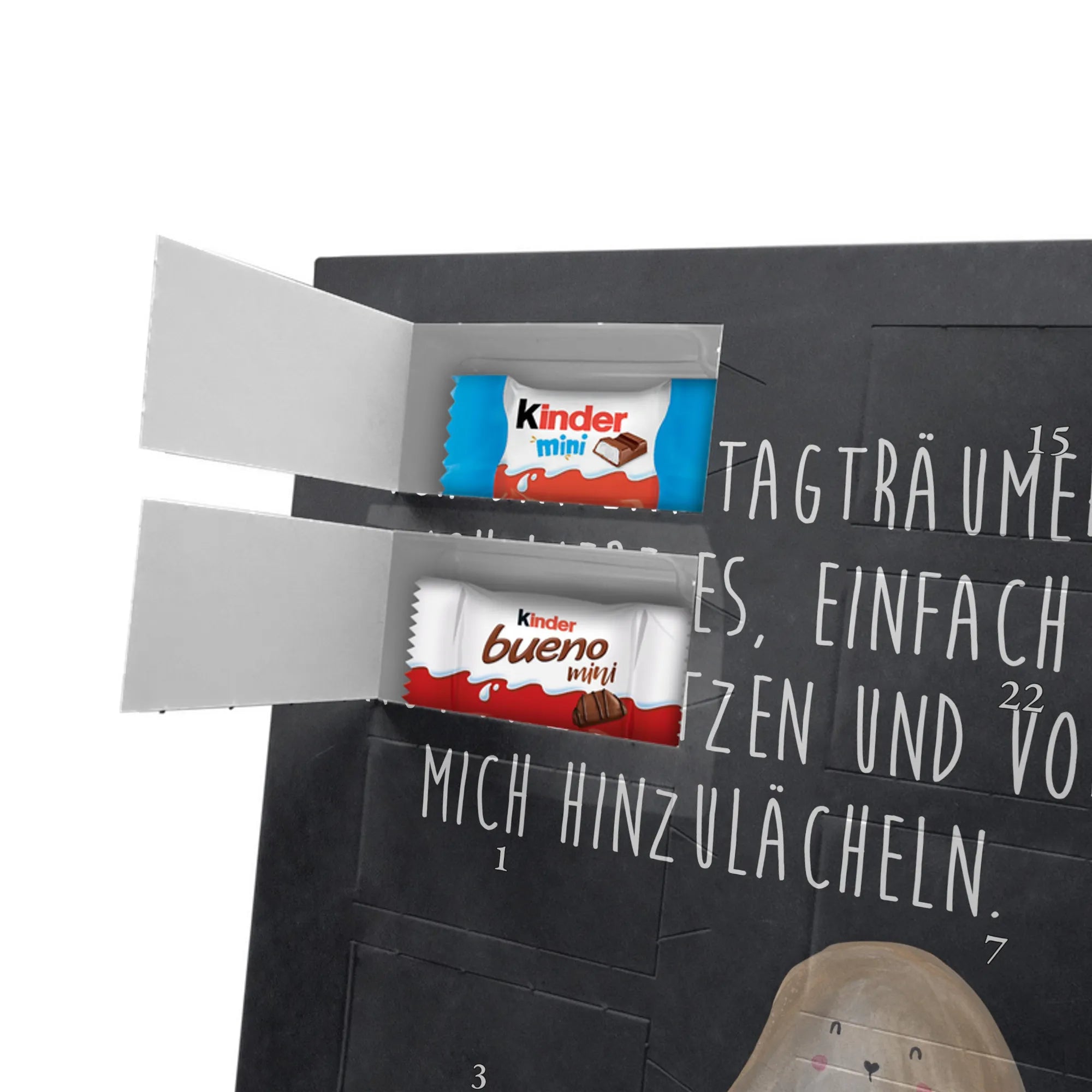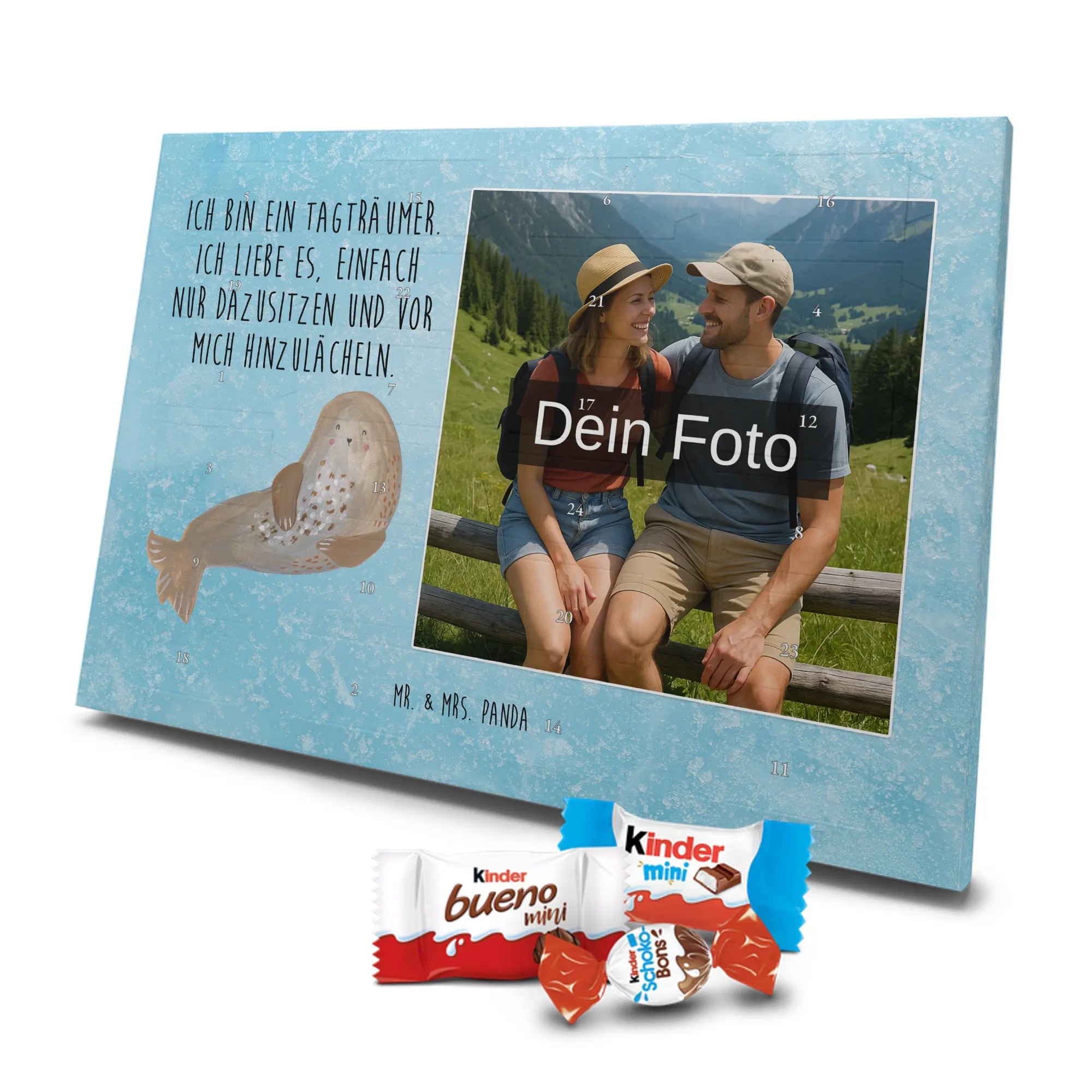 Unser personalisierten Schoko Foto Adventskalender ist ein echtes Highlight in der Adventszeit – handlich, individuell und voller süßer Überraschungen. Du personalisierst die Vorderseite mit deinem liebsten Foto und wir kombinieren es mit liebevollen Motiven und Sprüchen von Mr. & Mrs. Panda. Bitte achte auf eine ausreichende Bildauflösung und einen passenden Bildausschnitt, damit das Druckergebnis gestochen scharf ist. Lade nur Bilder hoch, deren Rechte du besitzt oder bei denen du die Erlaubnis hast, besonders wenn Personen darauf zu sehen sind. Wichtig: Fotos werden nicht retuschiert oder zugeschnitten; personalisierte Foto-Artikel sind vom Widerruf ausgeschlossen. Der Kalender besticht durch brillante Druckqualität und eine seidenmatte Oberflächenveredelung sowie bedruckte Seitenflächen. Maße: 355 mm x 245 mm x 11 mm. Du kannst ihn entweder aufstellen oder an die Wand hängen. Gefüllt ist der Adventskalender mit kinder® Schokolade, inklusive kinder® Schoko-Bons, kinder® Bueno mini und kinder® Schokolade mini. Ein liebevolles, persönliches Geschenk für Kinder, Freunde oder die bessere Hälfte – individuell, süß und mit dem typischen Mr. & Mrs. Panda Charme.