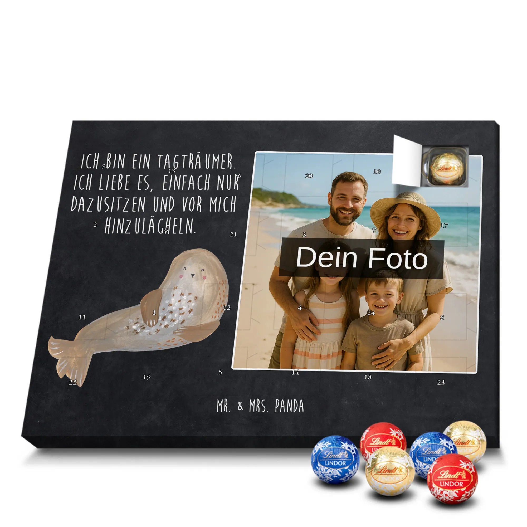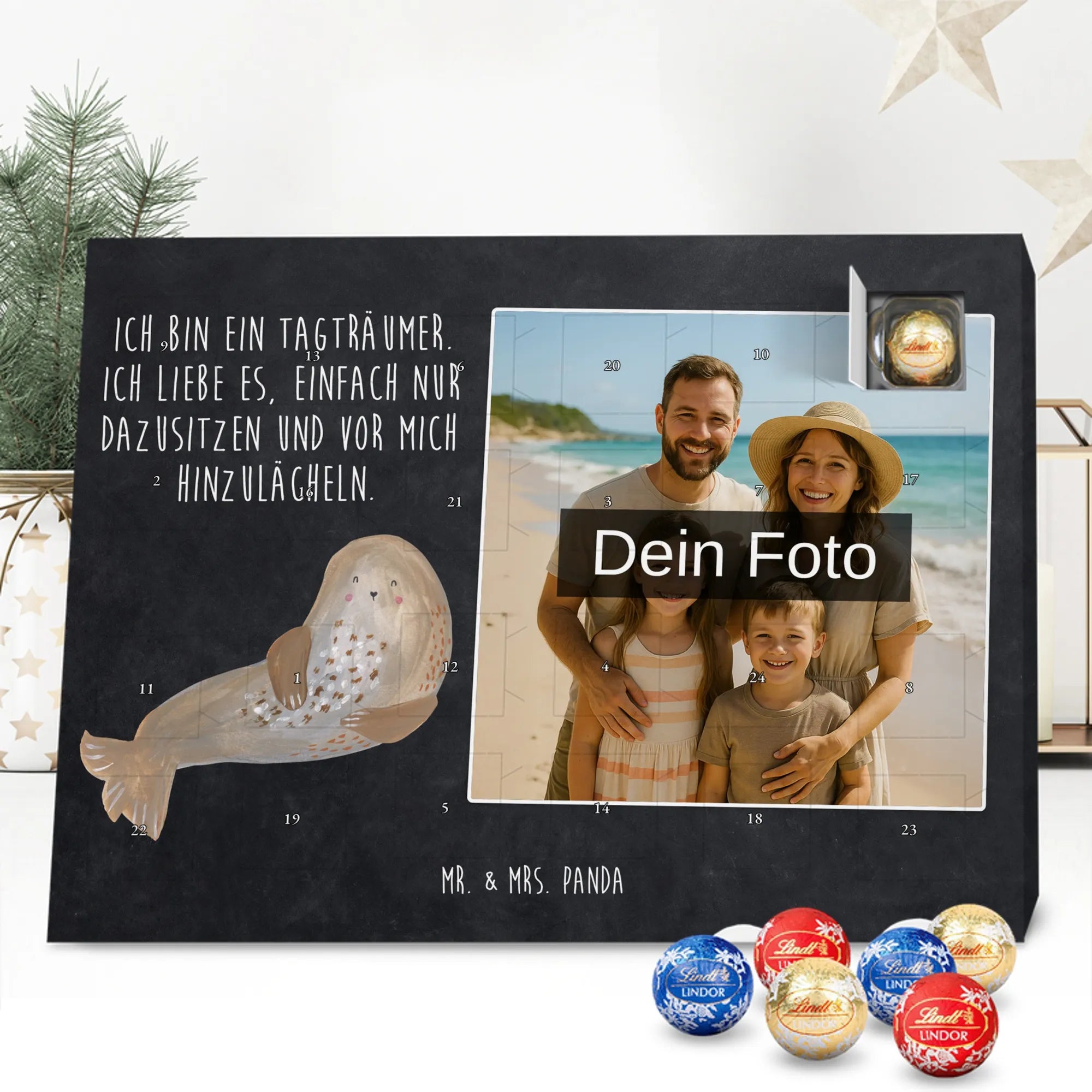 Wunderschöner Personalisierter Schoko Foto Adventskalender von Mr. & Mrs. Panda – perfekt zum Verschenken oder zum Verwöhnen. Dieser Adventskalender verbindet liebevolle Mr. & Mrs. Panda-Motive und Sprüche mit deinem persönlichen Foto auf der Vorderseite. Die hochwertige Verarbeitung mit seidenmatter Oberflächenveredelung sorgt für brillante Farben und eine edle Haptik, die man gerne anfasst. Bedruckte Seitenflächen und die stabile Ausführung machen den Kalender zum echten Hingucker in der Adventszeit. Bitte achte auf eine hohe Auflösung deines Fotos, damit das Druckergebnis klar und scharf wird, und wähle einen passenden Bildausschnitt, damit keine wichtigen Details abgeschnitten werden. Lade nur Bilder hoch, bei denen du die Rechte besitzt oder die Erlaubnis hast, besonders bei Fotos mit Personen. Wichtig: Die Fotos werden weder aufbereitet noch zugeschnitten – eine Rücknahme bei personalisierten Foto-Artikeln ist ausgeschlossen. Der Kalender kann aufgehängt oder aufgestellt werden, so wie es dir gefällt. Maße: 233 mm x 178 mm x 24 mm. Gefüllt mit Lindt Lindor Markenschokolade: 24 einzeln verpackte Markenschokoladen Kugeln in drei Sorten (Vollmilch, Feinherb, Weiße Schokolade). Zutatenhinweis: Kann Haselnüsse und Mandeln enthalten. Ein liebevoller, personalisierter Adventsmoment von Mr. & Mrs. Panda.