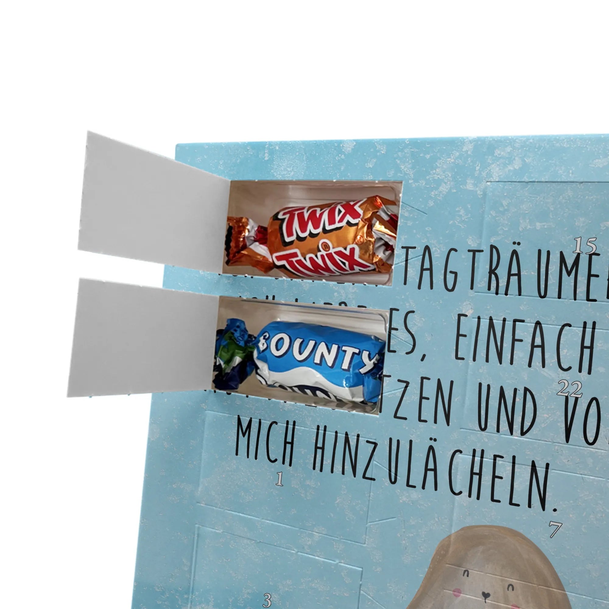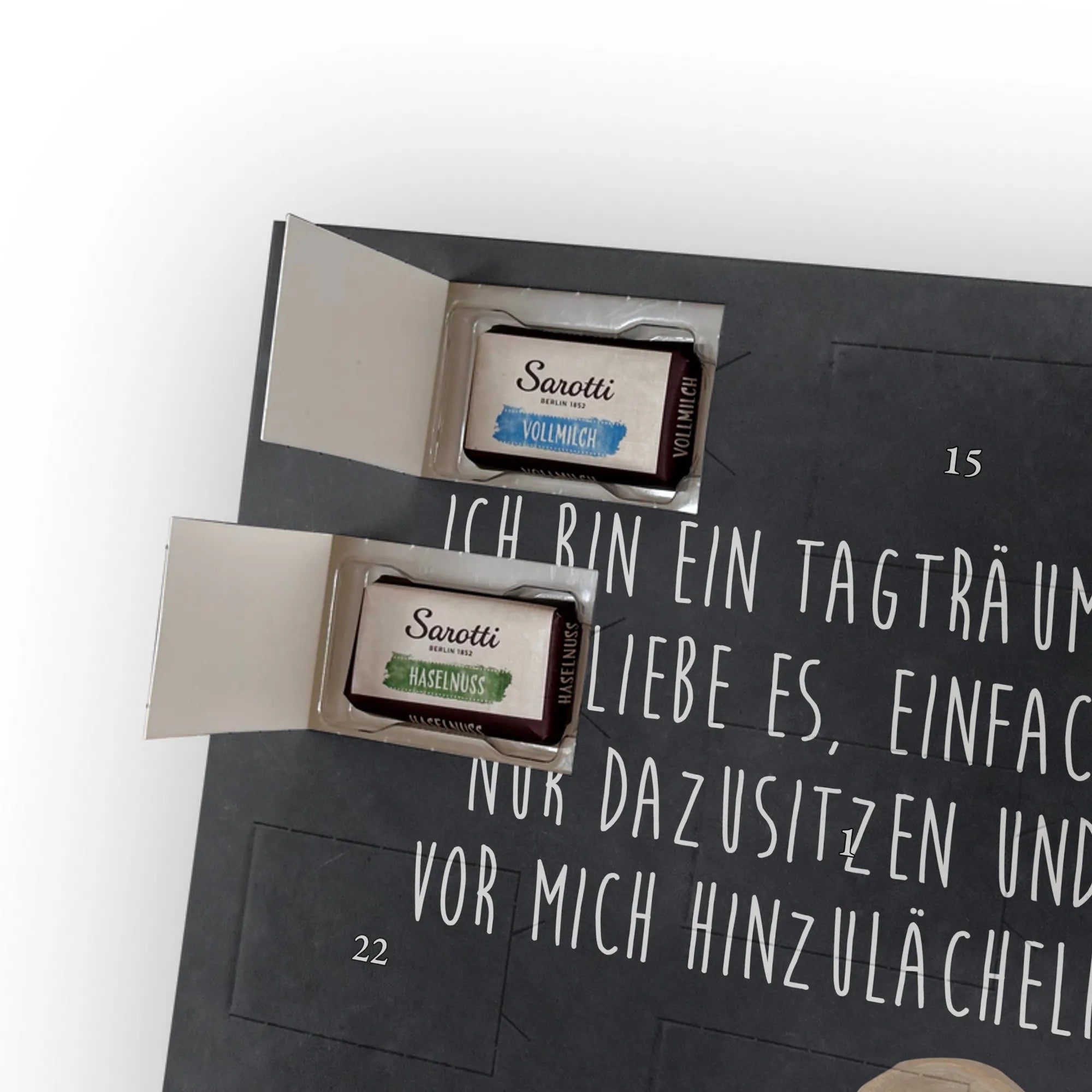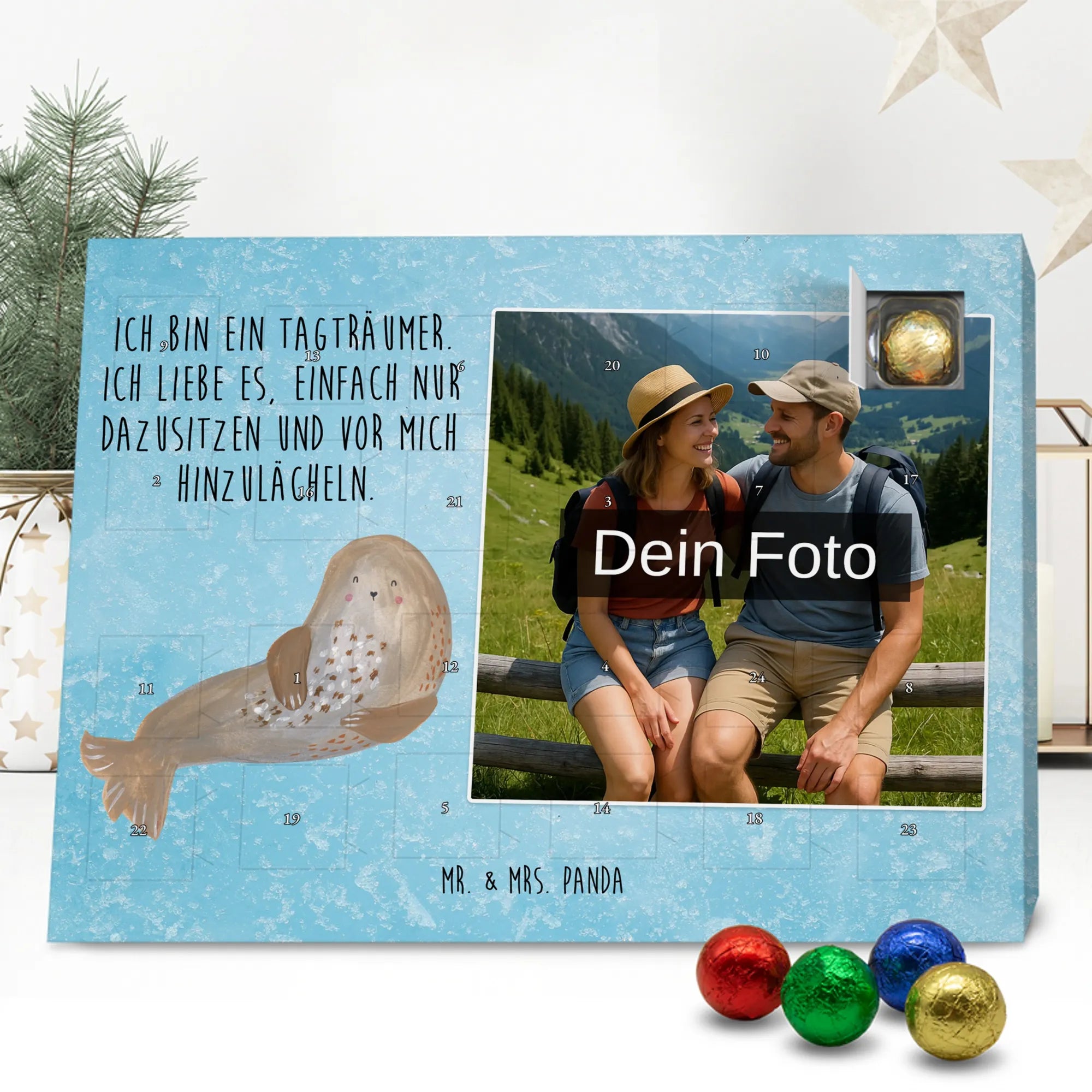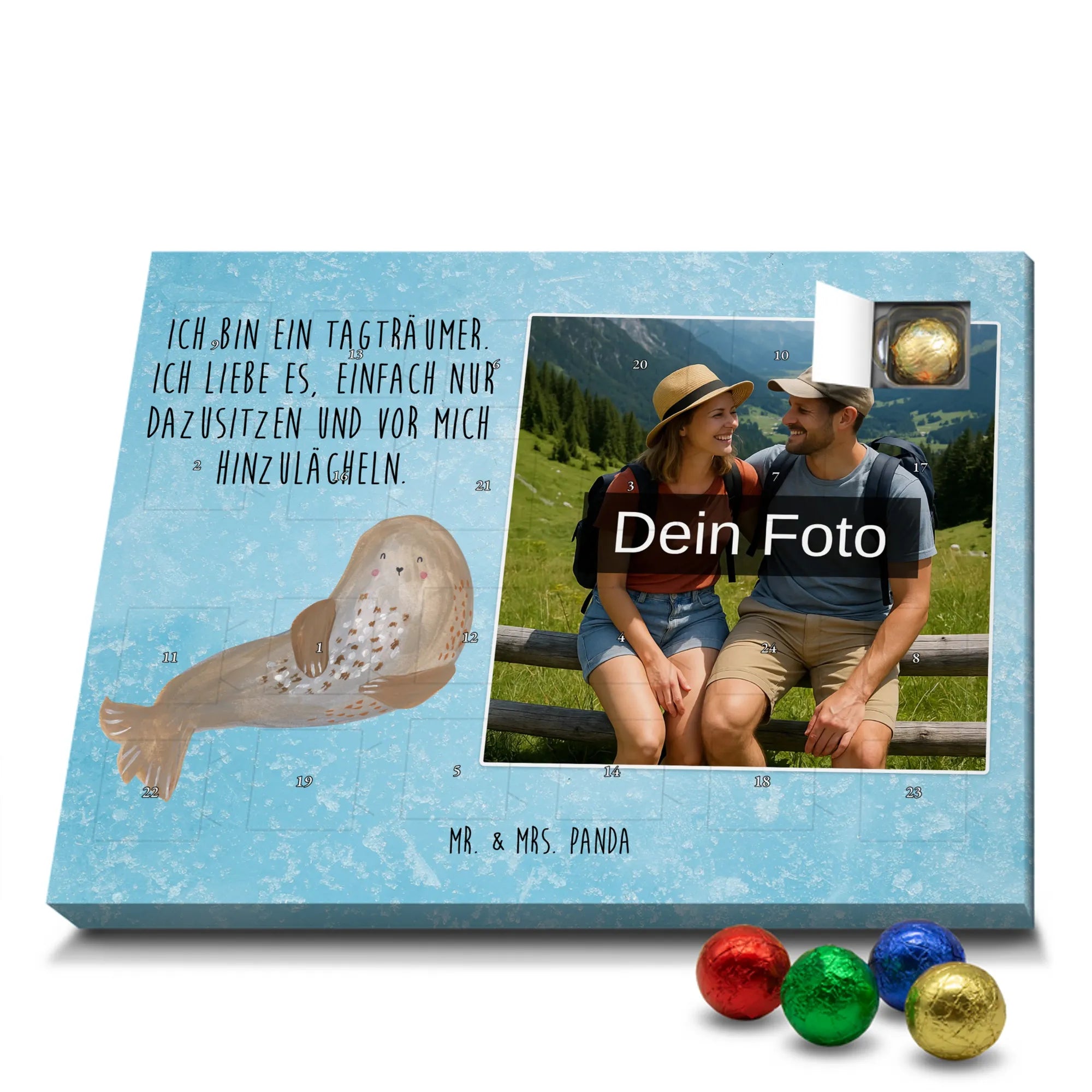 Liebevoller Foto Adventskalender personalisiert von Mr. & Mrs. Panda – der perfekte Begleiter durch die Adventszeit. Bedruckt mit unseren beliebten Motiven & Sprüchen, kannst du den Kalender mit einem persönlichen Foto versehen. Achte auf hohe Auflösung und einen passenden Bildausschnitt, damit das Motiv optimal zur Geltung kommt. Verwende nur Bilder, für die du die Rechte besitzt, um rechtliche Probleme zu vermeiden. Der Kalender bietet brillante Druckqualität, eine seidenmatte Oberflächenveredelung und bedruckte Seitenflächen. Maße: 233 mm x 178 mm x 24 mm. Besonderheit: Er lässt sich sowohl aufstellen als auch aufhängen. Bitte beachte: Die Fotos werden weder aufbereitet noch zugeschnitten, daher ist eine Rücknahme bei personalisierten Foto-Artikeln ausgeschlossen. Gefüllt mit MARKENNAMEN Schokolade und leckeren Schokoladenkugeln. Hinweis: Kann Spuren von Haselnüssen, Mandeln, Gluten und Soja enthalten. Kühl und trocken lagern. Schenke persönliche Vorfreude – jeden Tag ein kleines Highlight mit Schokolade und Erinnerungen.