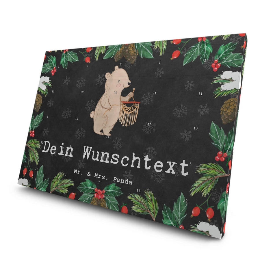Entdecke unseren wunderschönen, personalisierten Tee Adventskalender mit dem süßen Bär-Motiv "Makramee Medizin" von Mr. & Mrs. Panda! Dieser Kalender ist nicht nur ein festlicher Begleiter in der Vorweihnachtszeit, sondern auch das perfekte Geschenk für alle Hobby- und Sportliebhaber, die das Basteln mit Makramee lieben. Der Adventskalender ist mit 24 einzeln verpackten hochwertigen Teesorten befüllt, darunter Früchtetees, Schwarztees und Kräutertees. So kannst Du jeden Tag eine neue Teesorte genießen und Dich auf die Weihnachtszeit freuen.