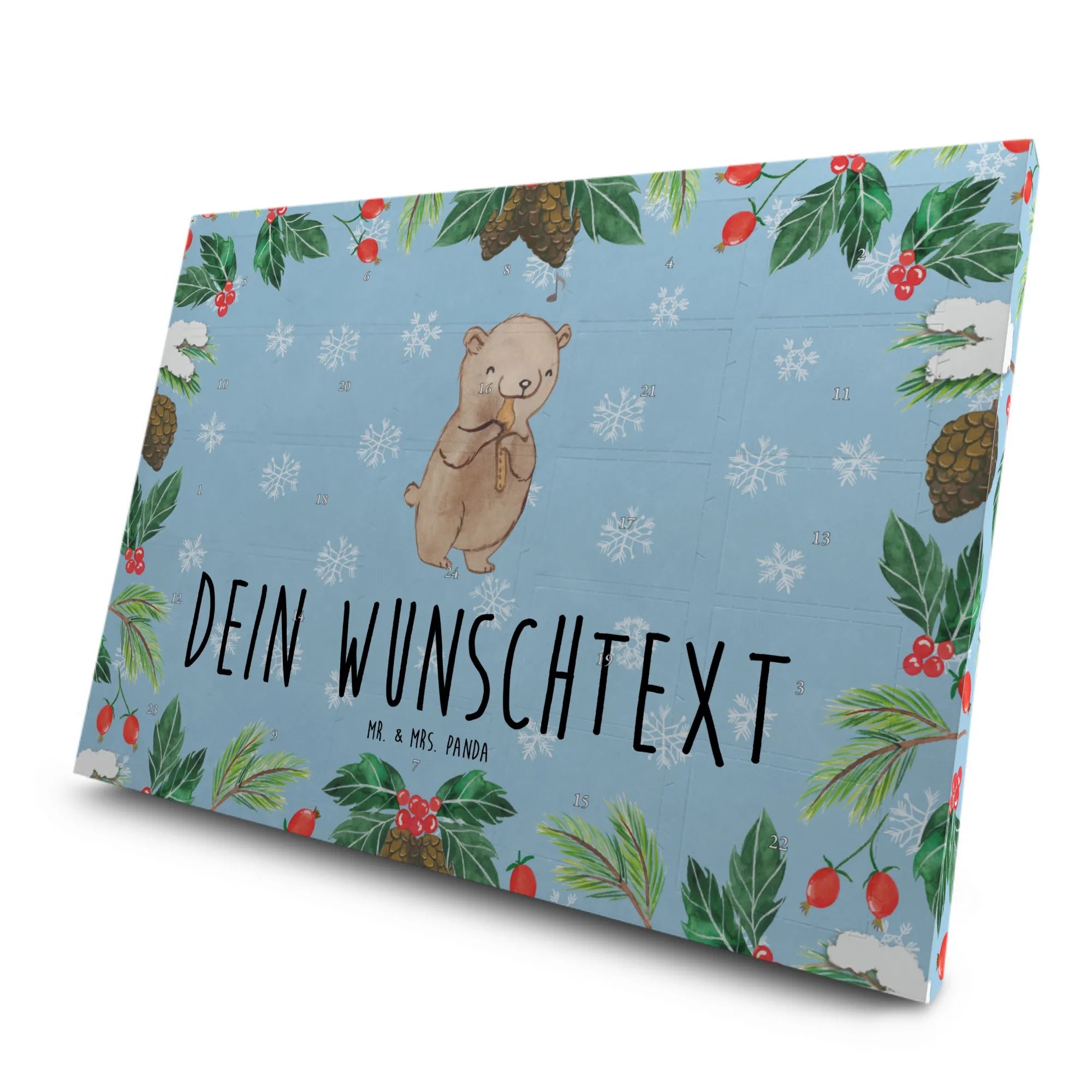 Der personalisierte Tee Adventskalender mit dem bezaubernden Motiv "Bär Blockflöte" von Mr. & Mrs. Panda ist das perfekte Geschenk für Musikliebhaber und kleine Musiker. Dieser Kalender vereint die Freude am Tee mit der Leidenschaft zur Musik.
