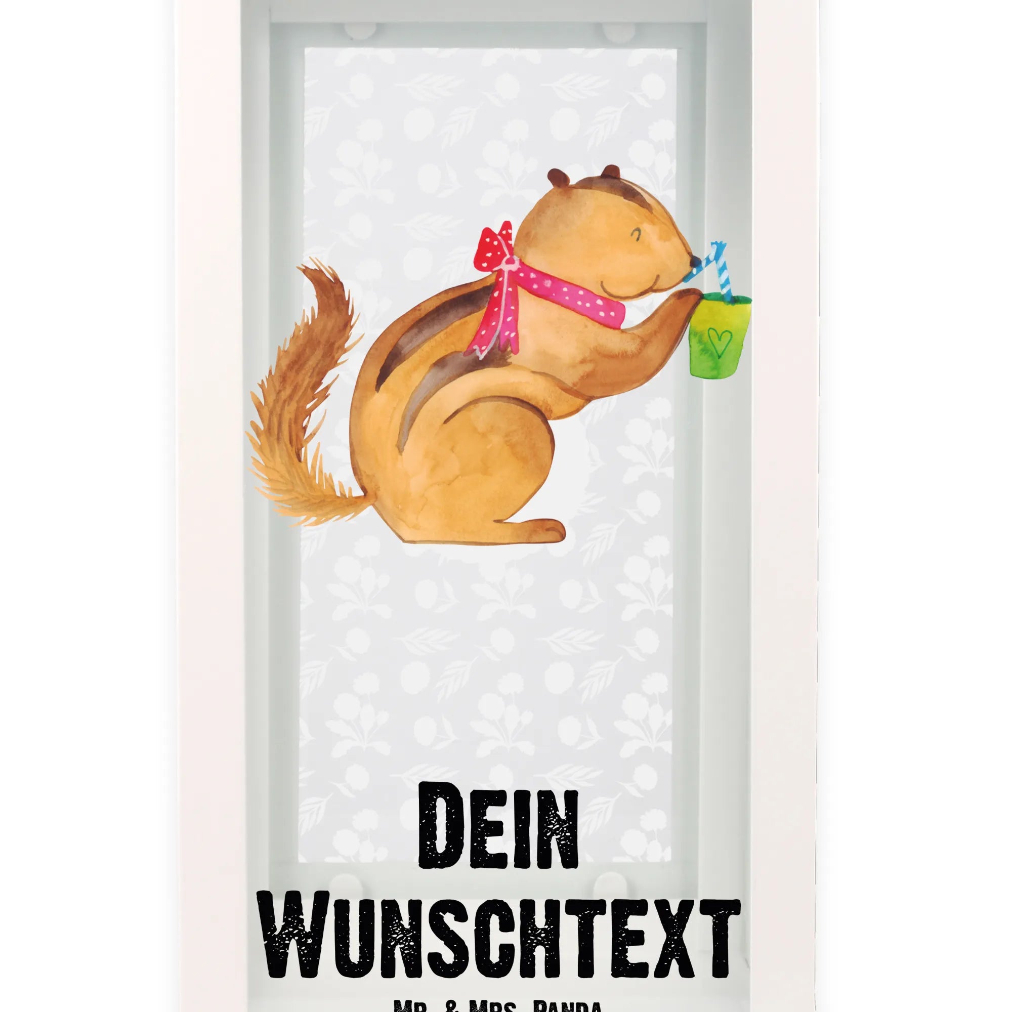 Die personalisierte Deko Laterne mit dem Motiv Eichhörnchen Smoothie aus der Small World Kollektion ist das perfekte Geschenk für alle, die eine Vorliebe für Tiermotive und gute Laune haben. Mit ihrem süßen Streifenhörnchen, das genüsslich an einem Smoothie schlürft, bringt diese Laterne ein Stück Freude in jedes Zuhause.
