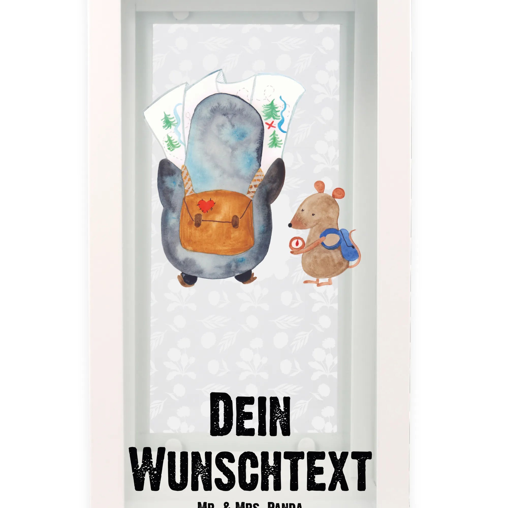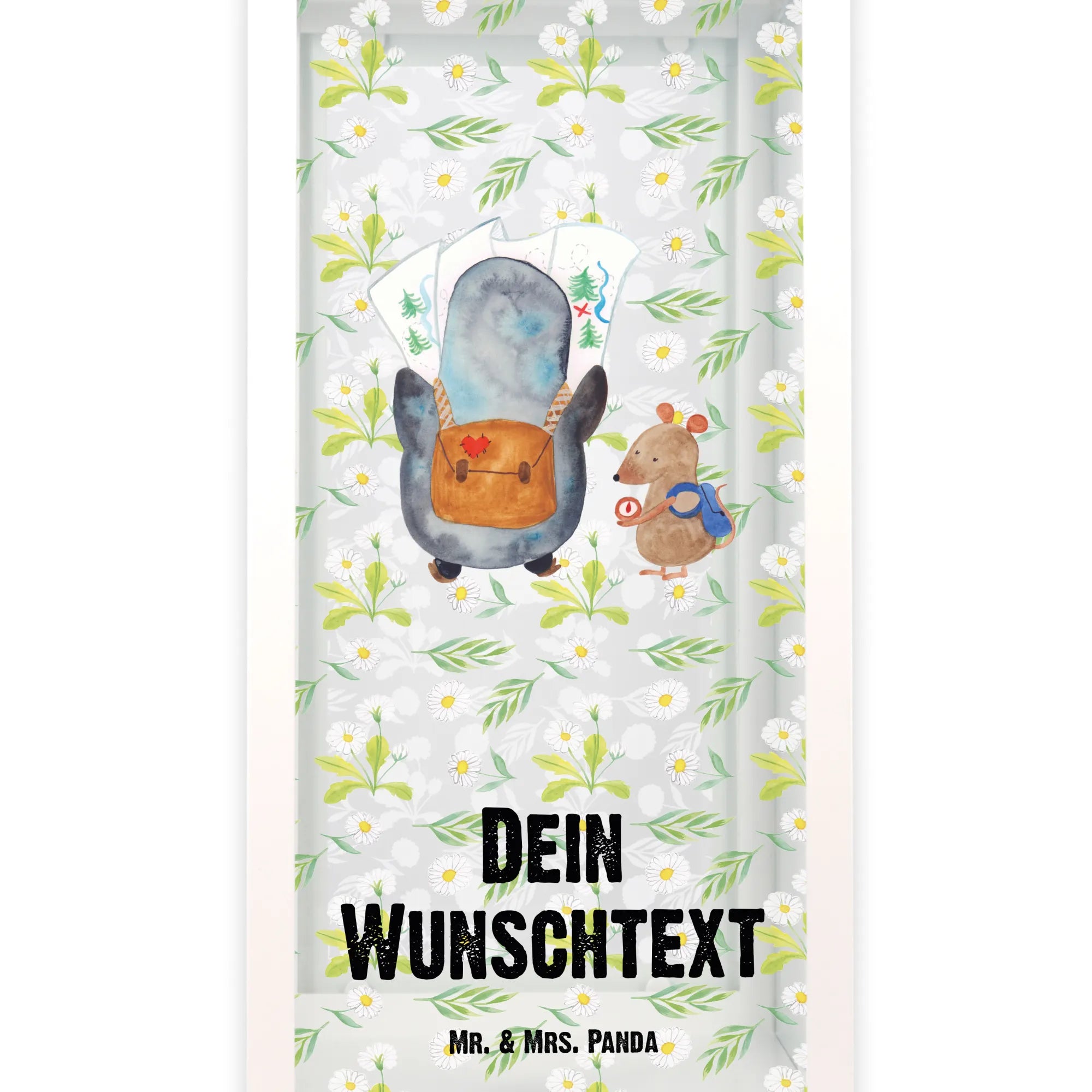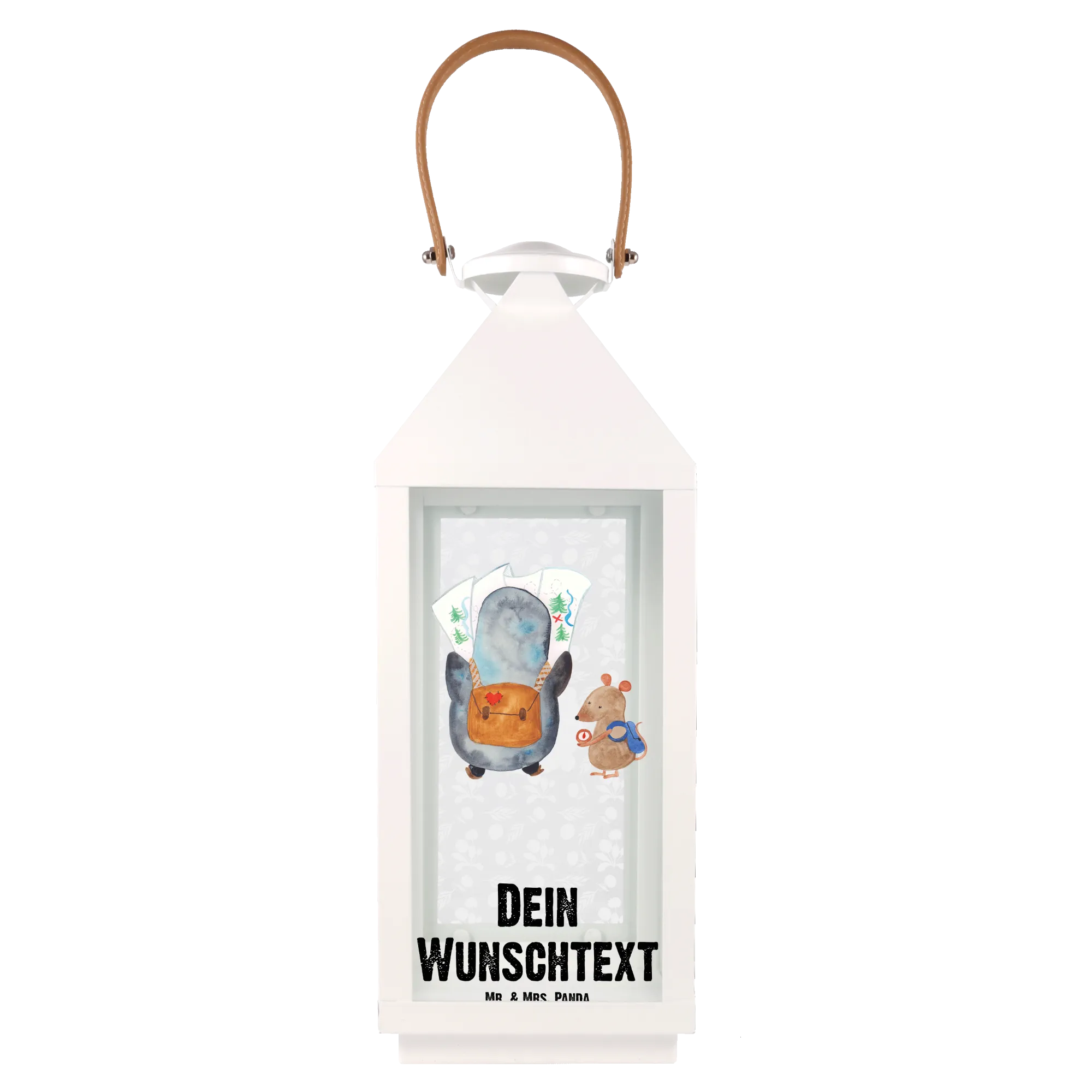 Die personalisierte Deko Laterne "Pinguin & Maus Wanderer" aus der Pinguin-Kollektion von Mr. & Mrs. Panda ist das perfekte Geschenk für alle Abenteuerliebhaber und Gartenenthusiasten.