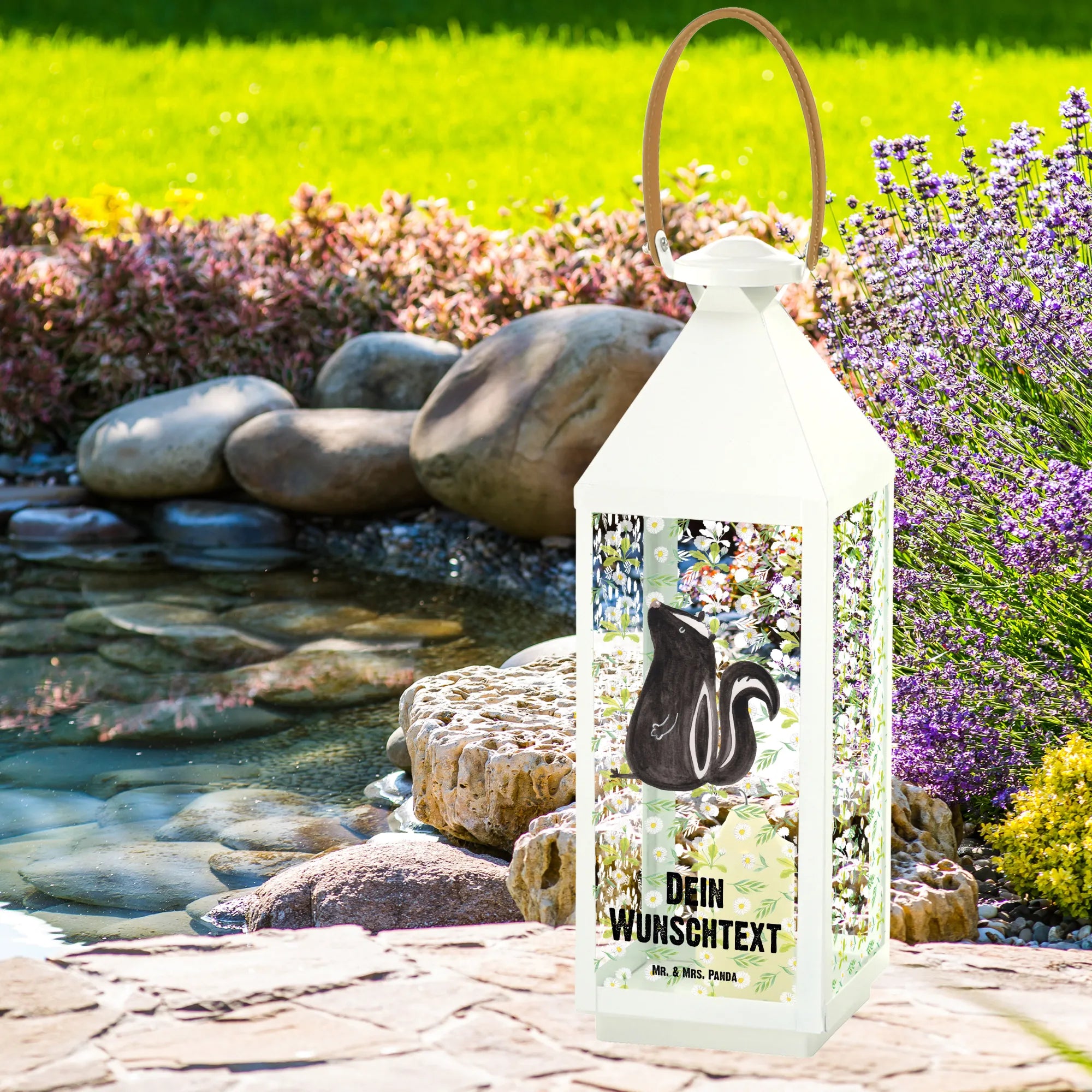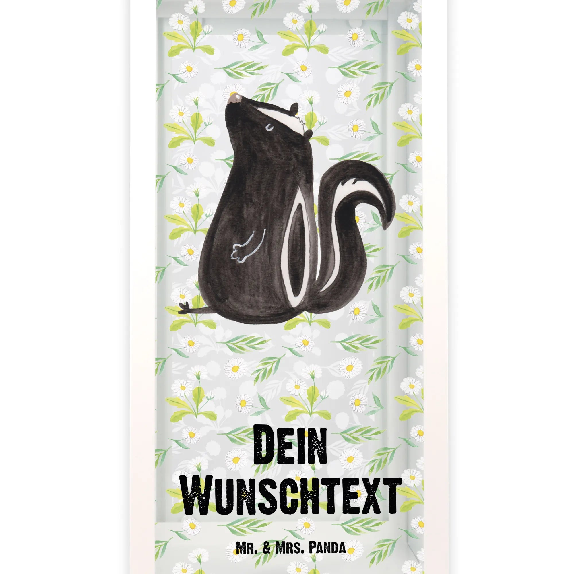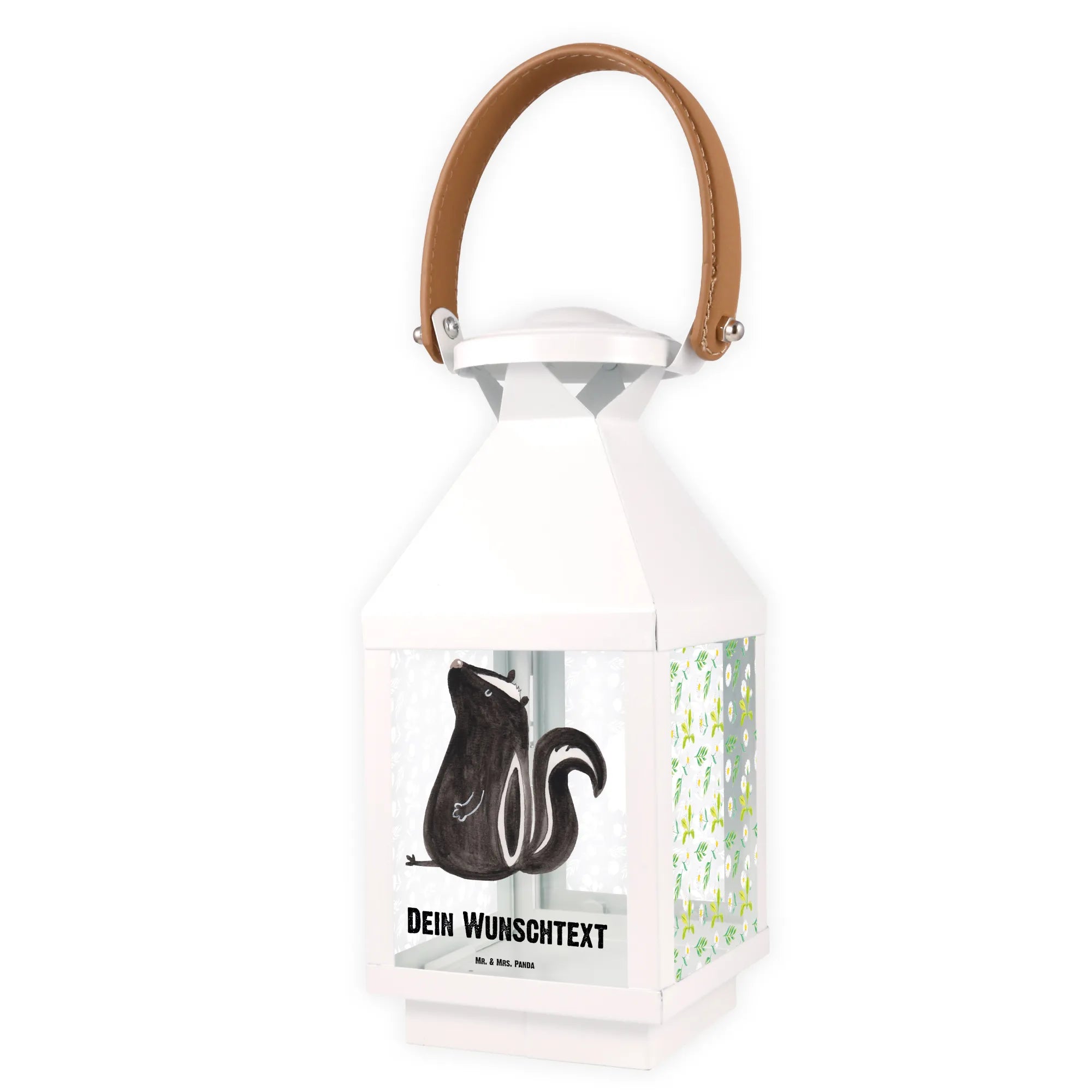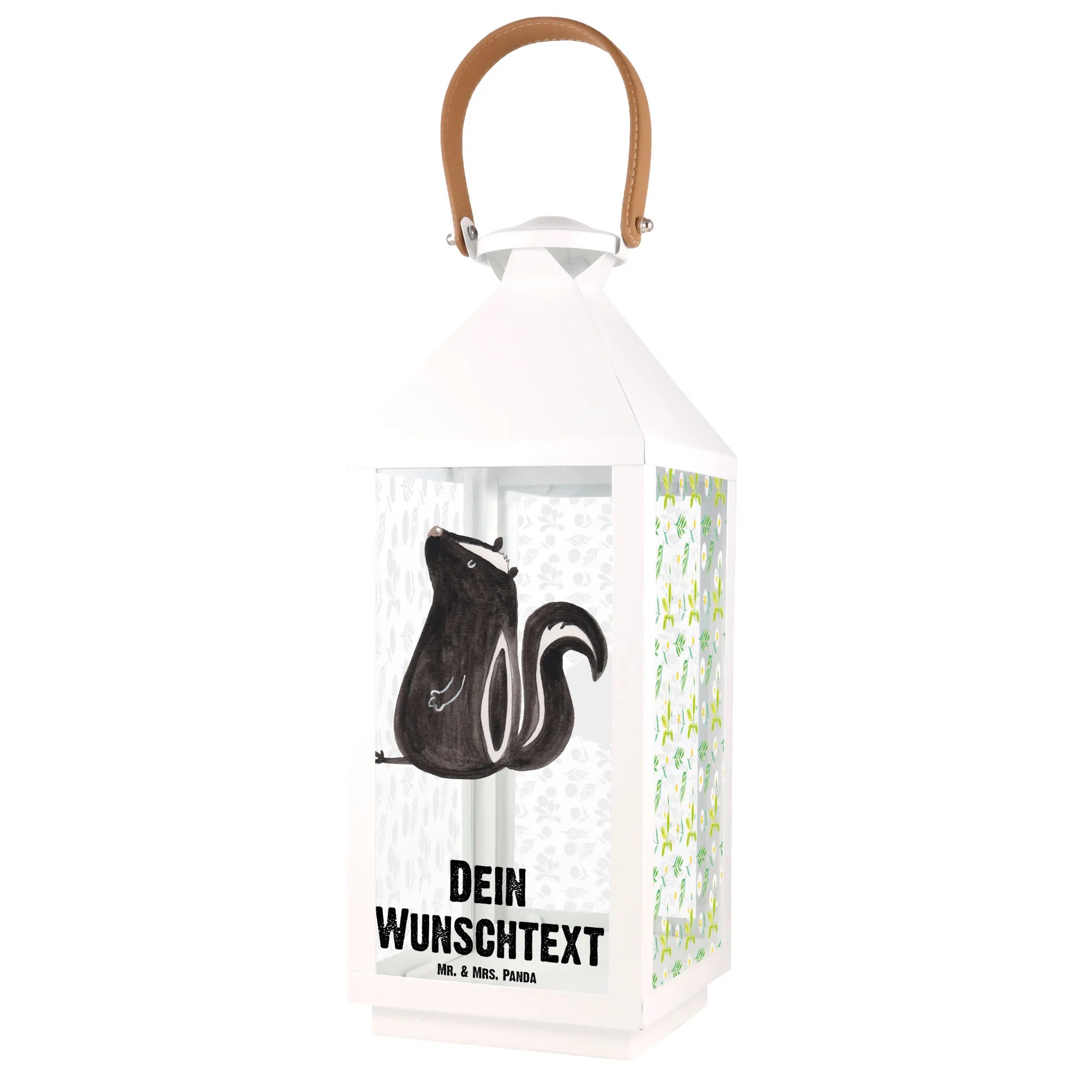 Die personalisierte Deko Laterne »Stinktier sitzend« aus der Stinktier-Kollektion von Mr. & Mrs. Panda ist das perfekte Geschenk für alle, die ihren Garten, Balkon oder ihre Terrasse liebevoll dekorieren möchten.