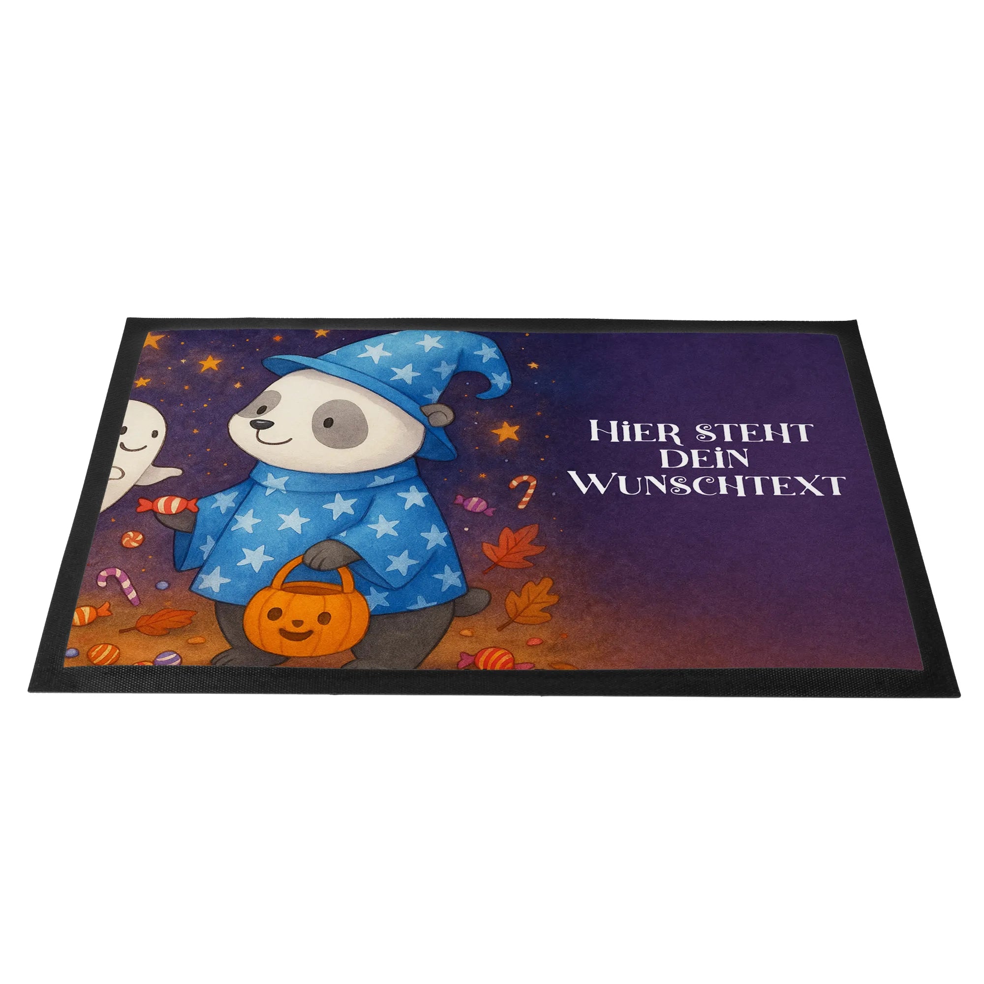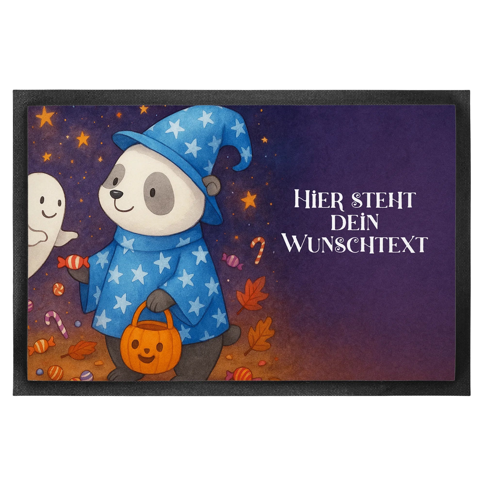 Die personalisierte Fußmatte „Panda Zauberer“ aus der Halloween Kollektion von Mr. & Mrs. Panda ist mehr als nur eine einfache Haustürmatte – sie ist ein kleiner Zaubermoment für jeden Tag. Der niedliche Panda in blauem Umhang und großem Sternen-Hut schenkt einem schwebenden Gespenst ein Bonbon, begleitet vom frechen Spruch „Gib mir Süßes, sonst gibt's Saures.“ Diese Fußmatte mit Namen lässt sich mit deinem Wunschtext bedrucken und wird so zum persönlichen Hingucker.