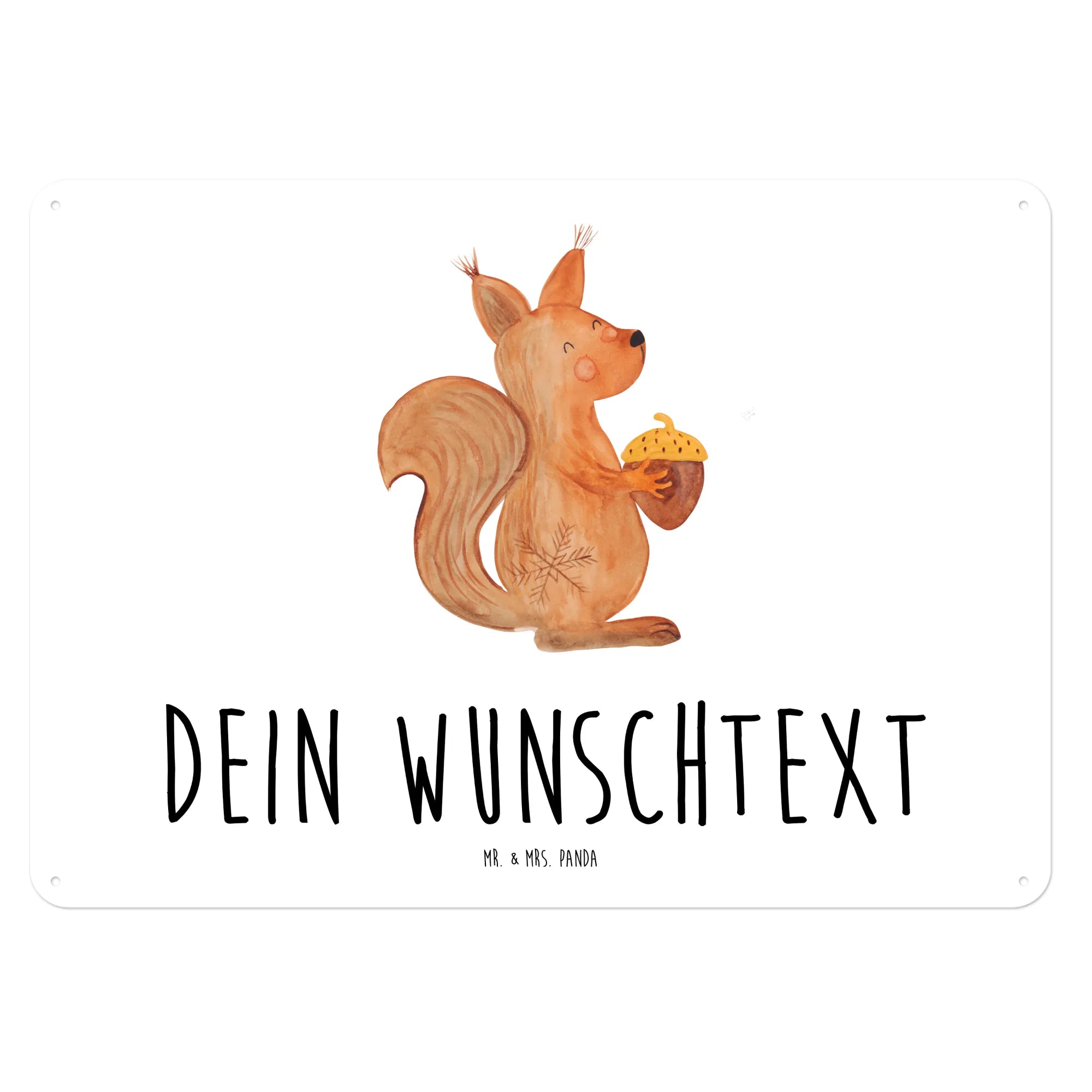 Das personalisierte Blechschild mit dem bezaubernden Eichhörnchen Weihnachten aus der Winter Kollektion von Mr. & Mrs. Panda ist nicht nur ein wunderbarer Blickfang, sondern auch das ideale Geschenk für die festliche Saison. Sein liebevoll gestaltetes Motiv bringt die strahlende Winterzeit direkt in dein Zuhause und verbreitet eine wohlige Atmosphäre. Auf dem Schild ist ein liebenswertes Eichhörnchen in warmen, erdigen Farben abgebildet. Es steht auf seinen beiden Beinen und hält glücklich eine Eichel. Die geschlossenen Augen und das sanfte Lächeln des Eichhörnchens vermitteln pure Zufriedenheit und machen es zum perfekten dekorativen Element für die Weihnachtszeit.