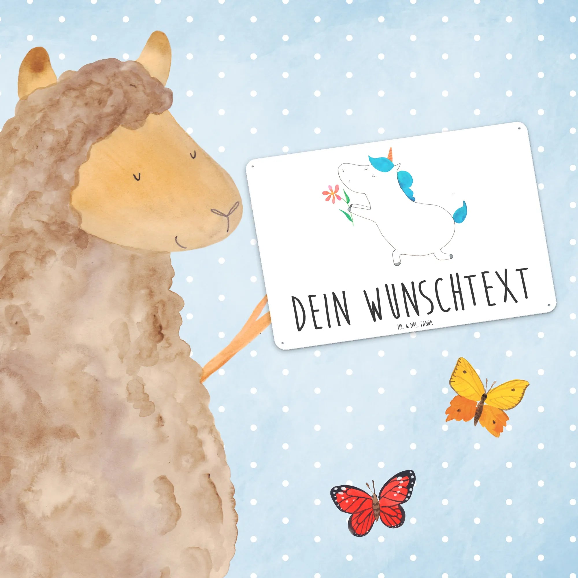 Das personalisierte Blechschild mit dem süßen Einhorn-Motiv "Einhorn Blume" aus der einzigartigen Einhorn-Kollektion von Mr. & Mrs. Panda ist das perfekte Geschenk für alle Einhornliebhaber. Mit einem zauberhaften Einhorn, das eine Blume präsentiert, verbreitet es Liebe und Magie in jedem Raum.