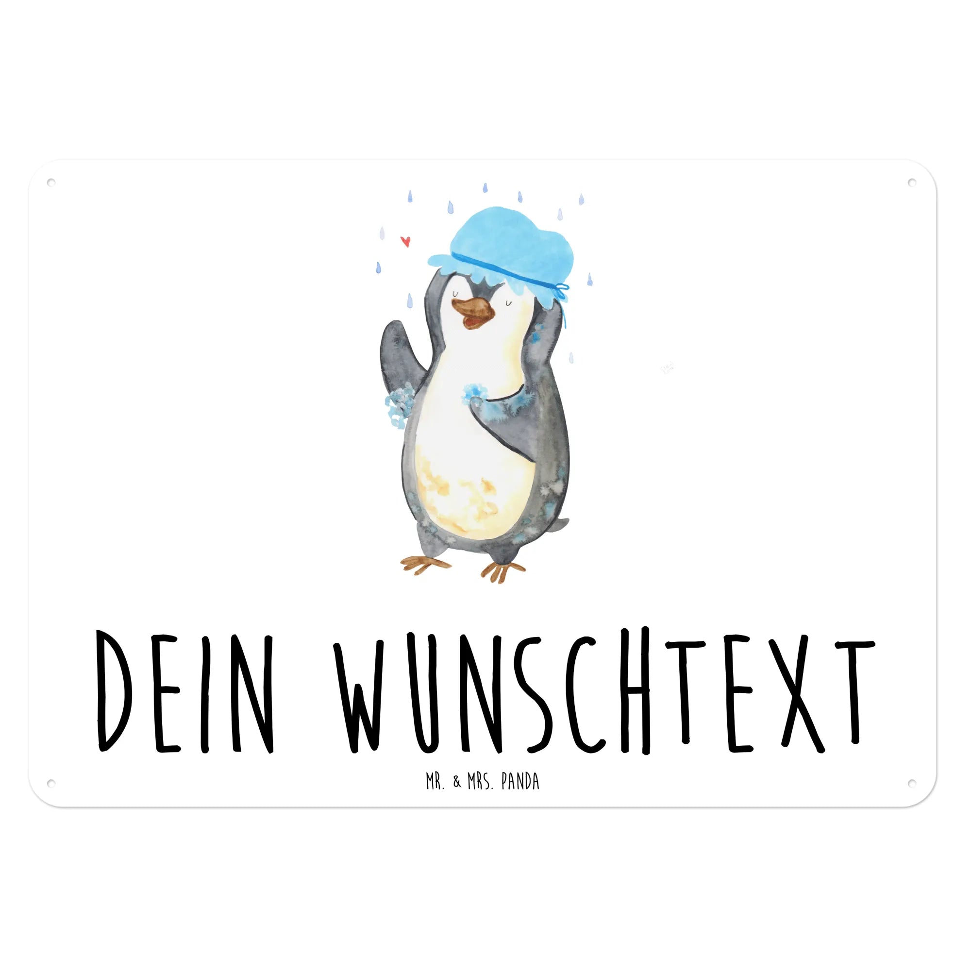 Das personalisierte Blechschild "Pinguin duscht" von Mr. & Mrs. Panda ist das perfekte Geschenk für alle, die Freude am Leben und einen fröhlichen Start in den Tag haben. Ob für Freunde, Familie oder als besondere Aufmerksamkeit für dich selbst – dieses Schild bringt sicher gute Laune. Das originelle Motiv zeigt einen niedlichen Pinguin, der fröhlich unter dem Wasserstrahl steht und mit einer Duschhaube ausgestattet ist. Der Pinguin zuckt über das schlechte Wetter hinweg und verspricht uns, dass man auch bei Regen Spaß haben kann.