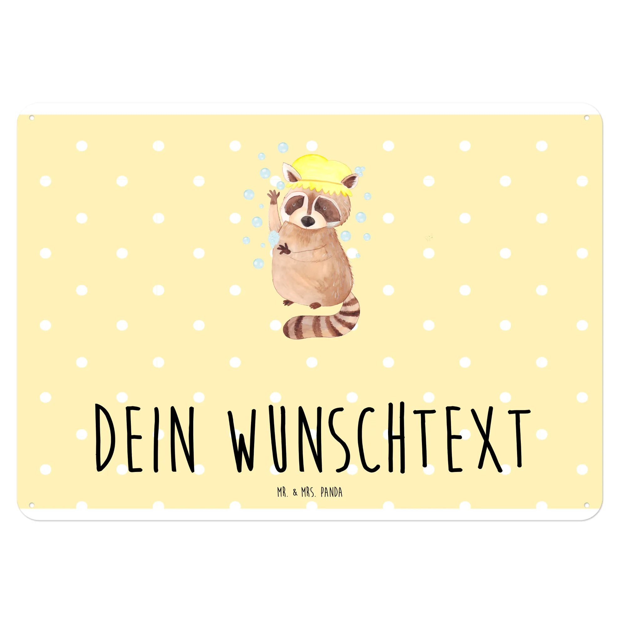 Entdecke das perfekte Geschenk für Tierliebhaber mit unserem personalisierten Blechschild im niedlichen Waschbär-Design. Dieses edle und langlebige Metallschild von Mr. & Mrs. Panda bringt deinen ganz persönlichen Touch in jeden Raum. Mit einem liebevoll handgezeichneten Waschbären, der sich fröhlich duscht, schafft es eine tolle Atmosphäre, die zum Tagträumen einlädt.
