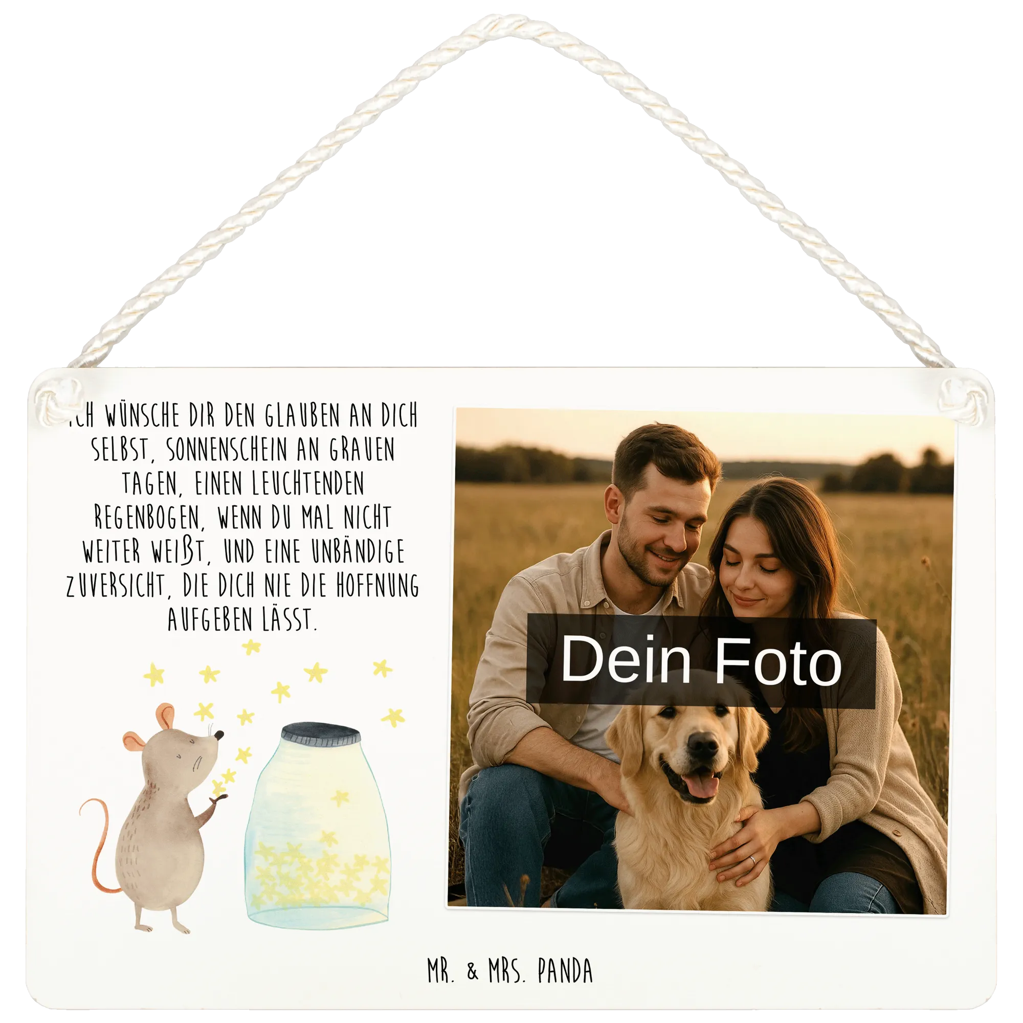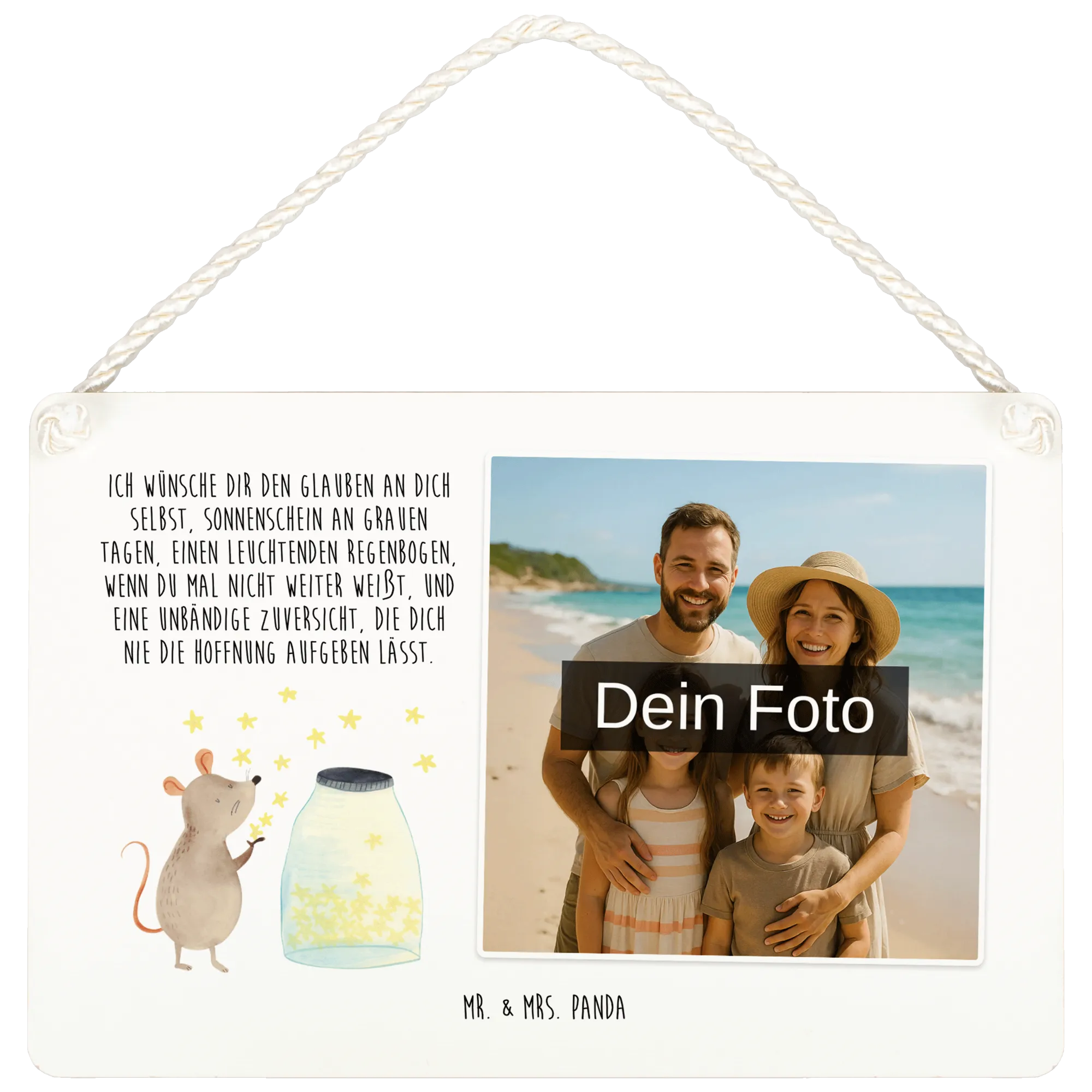 Verleihe deinem Zuhause einen persönlichen Touch mit dem schönen personalisierten Foto Deko Schild von Mr. & Mrs. Panda! Mit den Abmessungen von 210 mm x 148 mm ist es sowohl eine tolle Deko als auch ein gemütlicher Blickfang. Bedruckt mit zauberhaften Motiven und Sprüchen, kannst du dein Schild mit deinem Wunschfoto gestalten. Achte darauf, dass dein Bild in hoher Auflösung ist, um ein tolles Druckergebnis zu garantieren. Überprüfe auch den perfekten Bildausschnitt, damit alles klar und deutlich ist. Lade nur Fotos hoch, bei denen du die Rechte besitzt, besonders wenn darauf Menschen zu sehen sind. Gefertigt aus hochwertiger, beschichteter Holzfaser, ist es nicht nur schön, sondern auch langlebig. Die feine Kordel macht das Aufhängen einfach und sorgt für eine charmante Präsentation in deinem Zuhause!