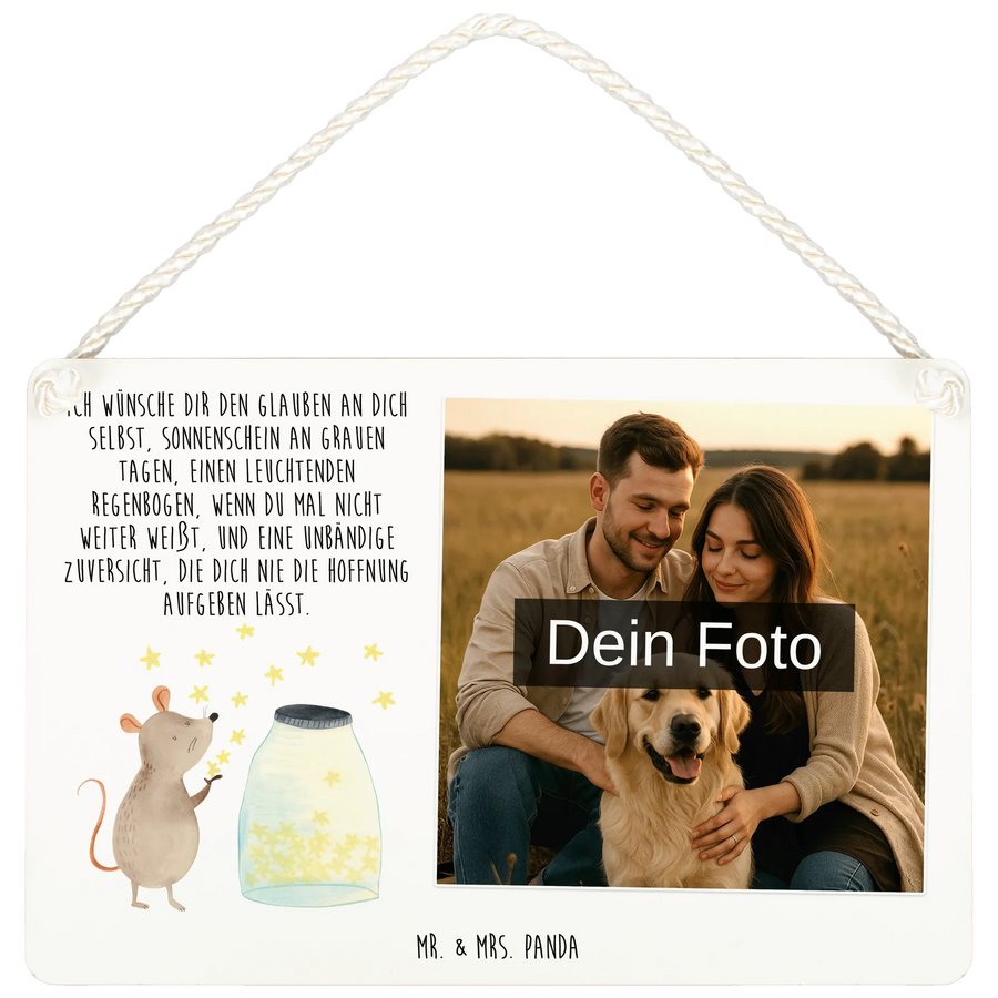 Mach dein Zuhause einzigartig mit unserem personalisierten Foto Deko Schild von Mr. & Mrs. Panda! Die Maße von 148 mm x 105 mm sorgen dafür, dass es sich überall harmonisch einfügt. Du kannst es nach deinen Wünschen mit deinem Lieblingsfoto und tollen Sprüchen von Mr. & Mrs. Panda gestalten. Sorge dafür, dass dein Bild in bester Qualität hochgeladen wird, damit das Endprodukt wirklich beeindruckt. Das langlebige Material bewahrt die Farben und sorgt für einen Blickfang an deiner Tür oder Wand. Ob als individuelles Geschenk oder einfach für die eigene Wohnung, dieses Schild ist immer eine gute Idee! Zudem macht die Kordel das Anbringen zum Kinderspiel und verleiht dem Schild einen stilvollen Touch.