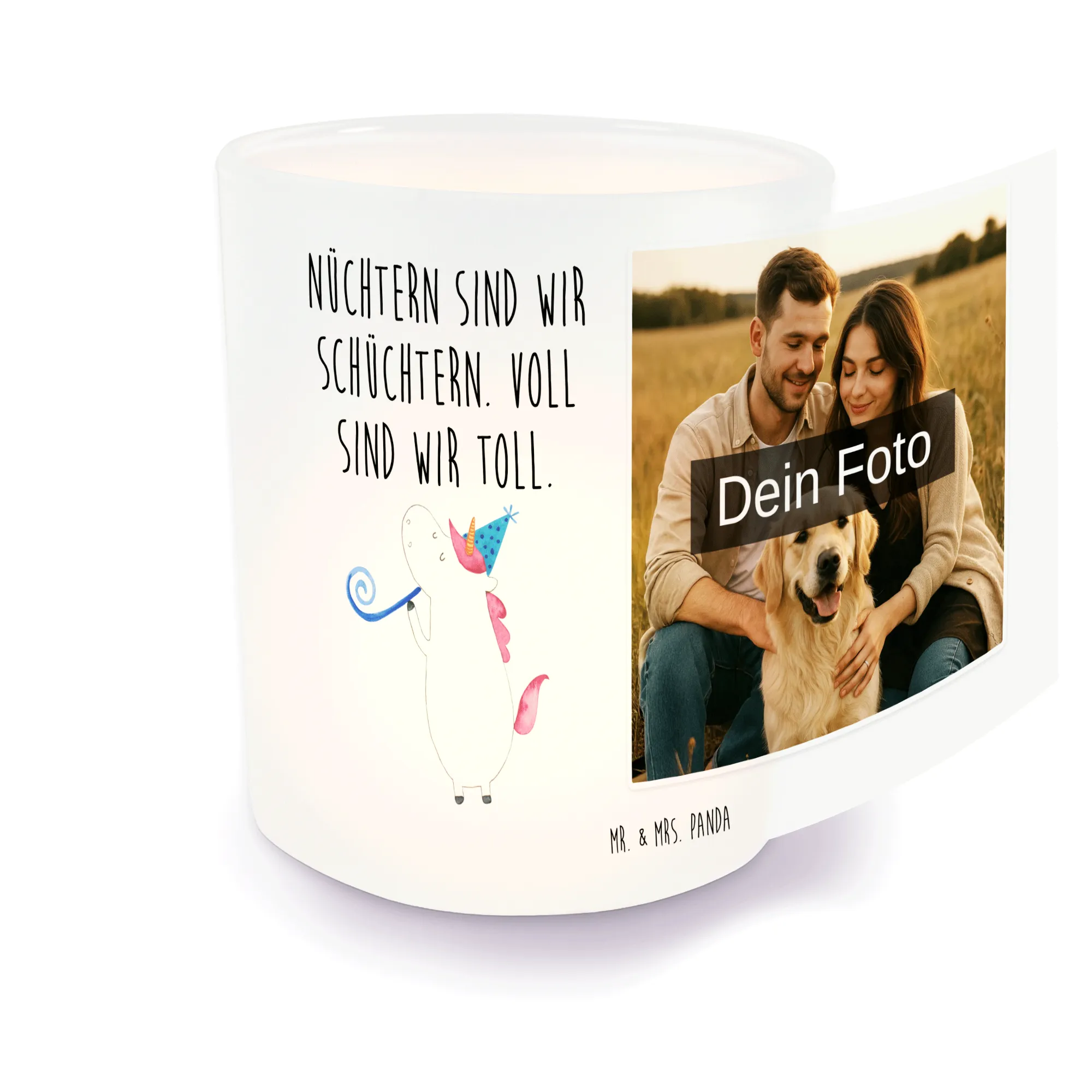 Bist du auf der Suche nach einem besonderen Geschenk? Unser personalisiertes Foto Windlicht von Mr. & Mrs. Panda ist die perfekte Wahl! Hergestellt aus satiniertem Glas, misst es 70 mm x 80 mm und verleiht jedem Raum einen besonderen Glanz. Du kannst dein Windlicht mit einem Wunschfoto ganz individuell gestalten. Achte darauf, das Foto in hoher Auflösung hochzuladen, damit alles klar und deutlich erscheint. Prüfe den Bildausschnitt, denn es wäre schade, wenn etwas Wichtigeres abgeschnitten wird. Ideal für Teelichter, schützt es sie hervorragend vor Wind und sorgt für eine romantische Stimmung überall. Verwöhne dein Windlicht mit sanfter Handwäsche, um seine Schönheit zu bewahren. Mach mit diesem Windlicht unvergessliche Momente erlebbar!