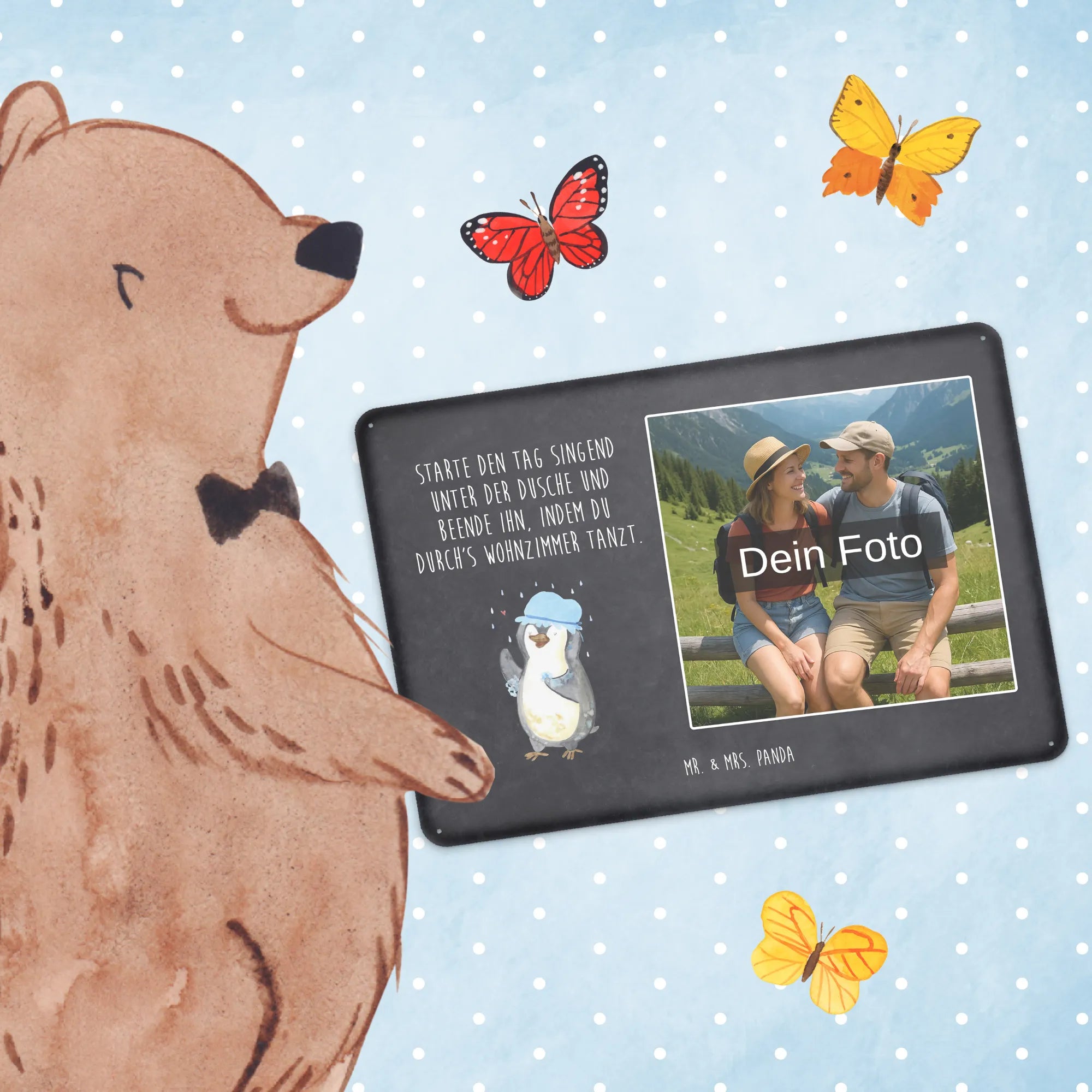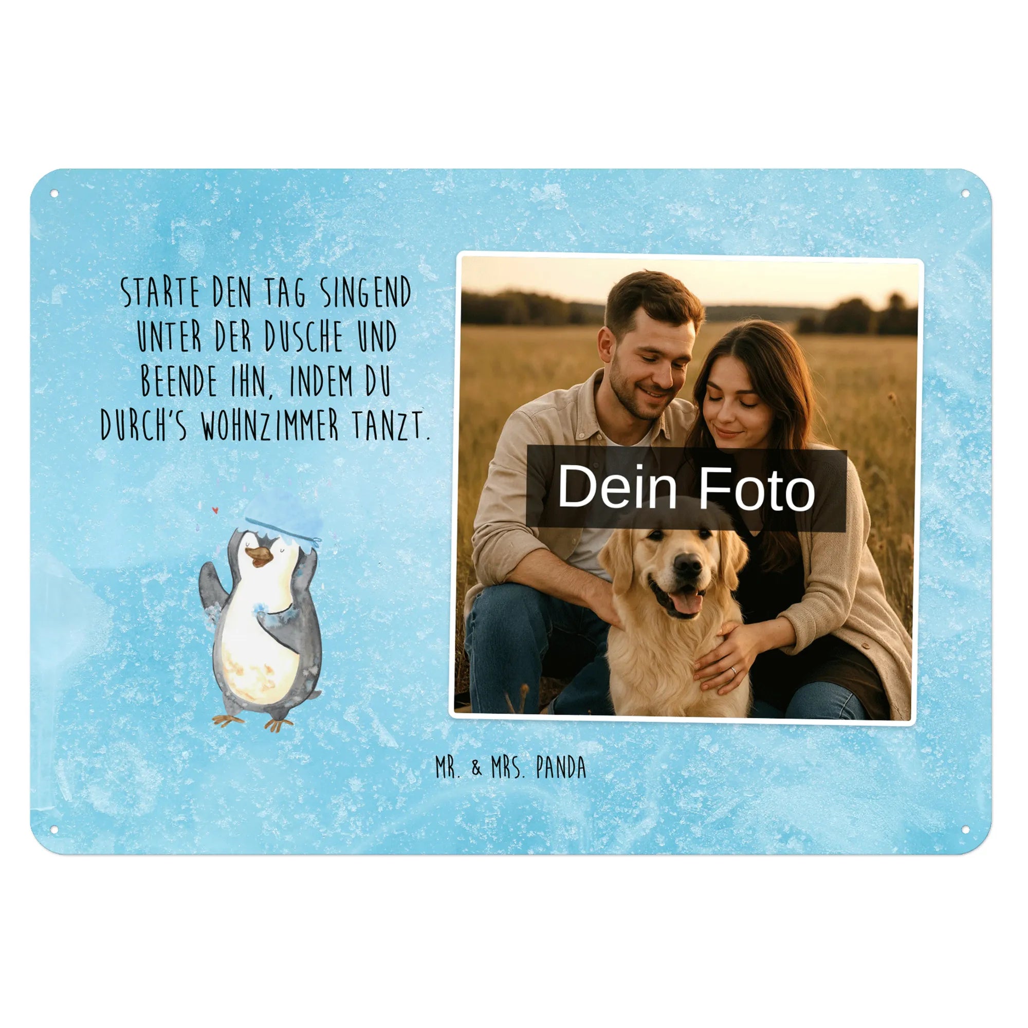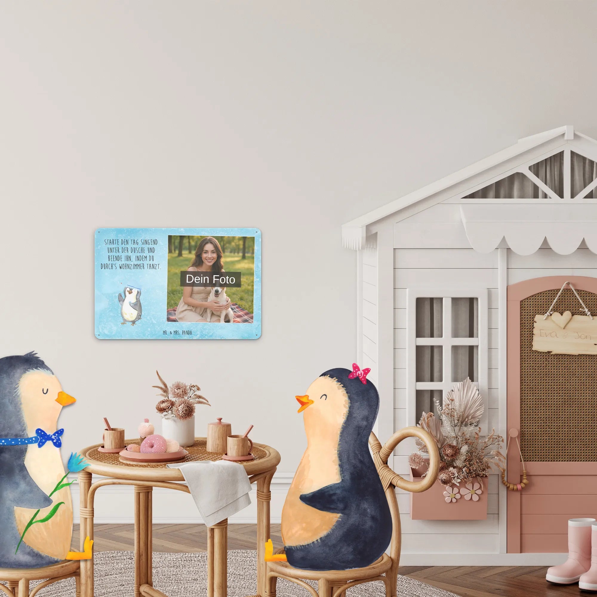 Personalized Photo Metal Sign Penguin have a shower - DIN A6 - Eisblau