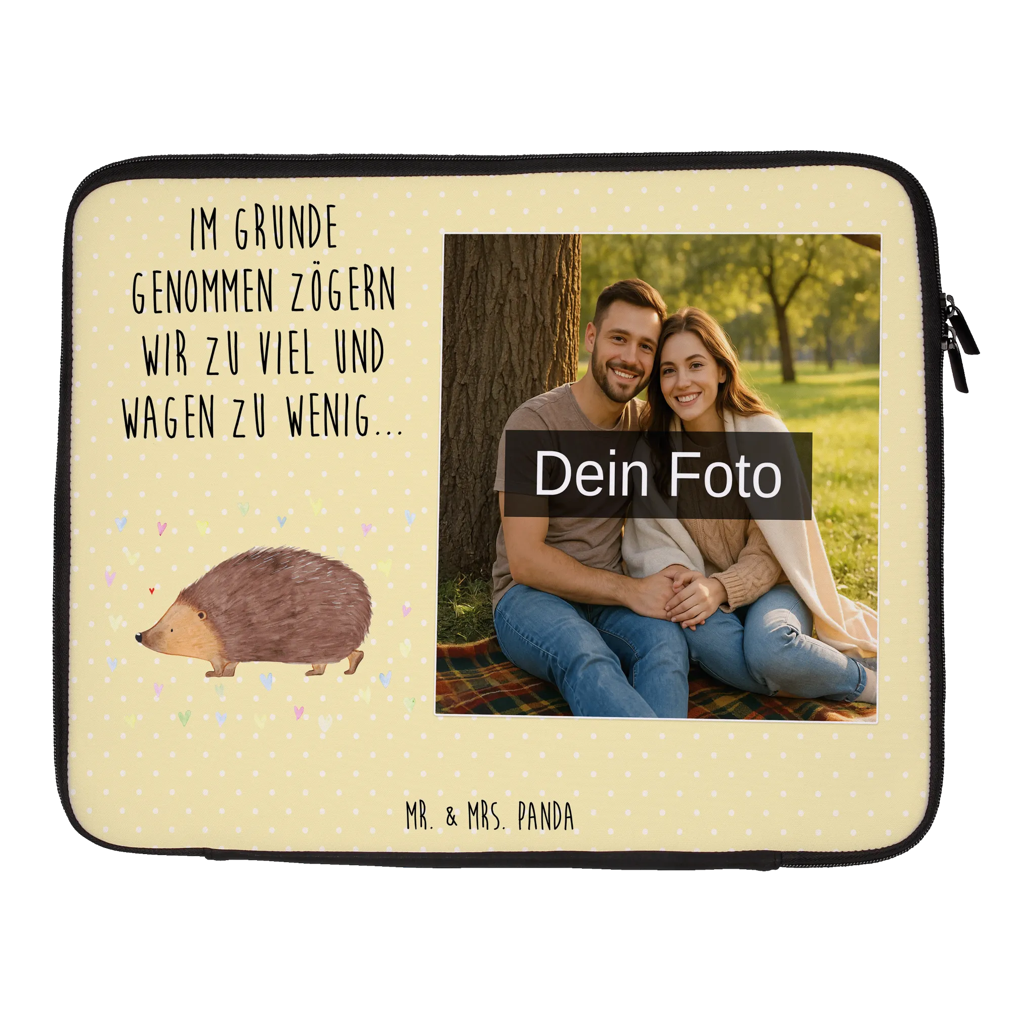 Entdecke unsere personalisierte Foto Notebook Tasche von Mr. & Mrs. Panda! Diese leichte und wunderschöne Tasche ist der perfekte Begleiter für dein Notebook oder Laptop. Mit den Maßen 360 mm x 270 mm x 30 mm bietet sie genügend Platz und ist aus wasserabweisendem Neopren gefertigt, das sich sanft anfühlt und gleichzeitig strapazierfähig ist. Die Front- und Rückseite sind liebevoll mit süßen Motiven und Sprüchen gestaltet, die von Mr. & Mrs. Panda stammen. Du kannst sie mit deinem eigenen Wunschfoto personalisieren! Achte darauf, ein hochauflösendes Bild zu wählen, um eine klare Druckqualität zu gewährleisten. Unser robuster Reißverschluss sorgt dafür, dass alles sicher verstaut ist, während der leichte Zugriff von beiden Seiten das Handling zum Kinderspiel macht. Diese Notebook Tasche bietet besten Schutz vor Kratzern, Staub und anderen Beschädigungen und ist ideal für unterwegs. Pflege sie ganz einfach mit einem feuchten Tuch, denn sie ist nicht waschmaschinenfest. Hebe dich von der Masse ab und mache dein Notebook zu einem Unikat mit unserer einzigartigen personalisierten Foto Notebook Tasche! Perfekt als Geschenk für Freunde oder für dich selbst.