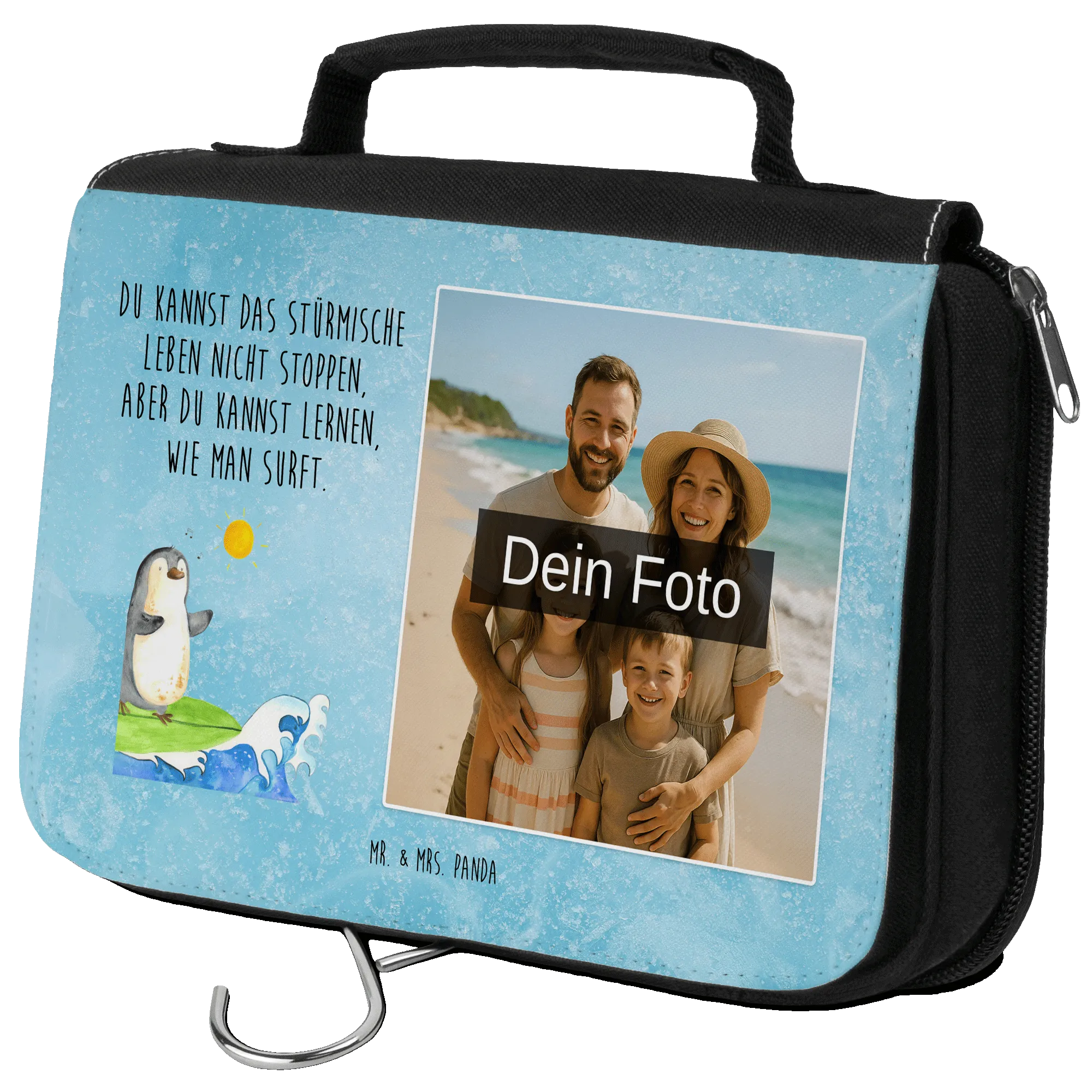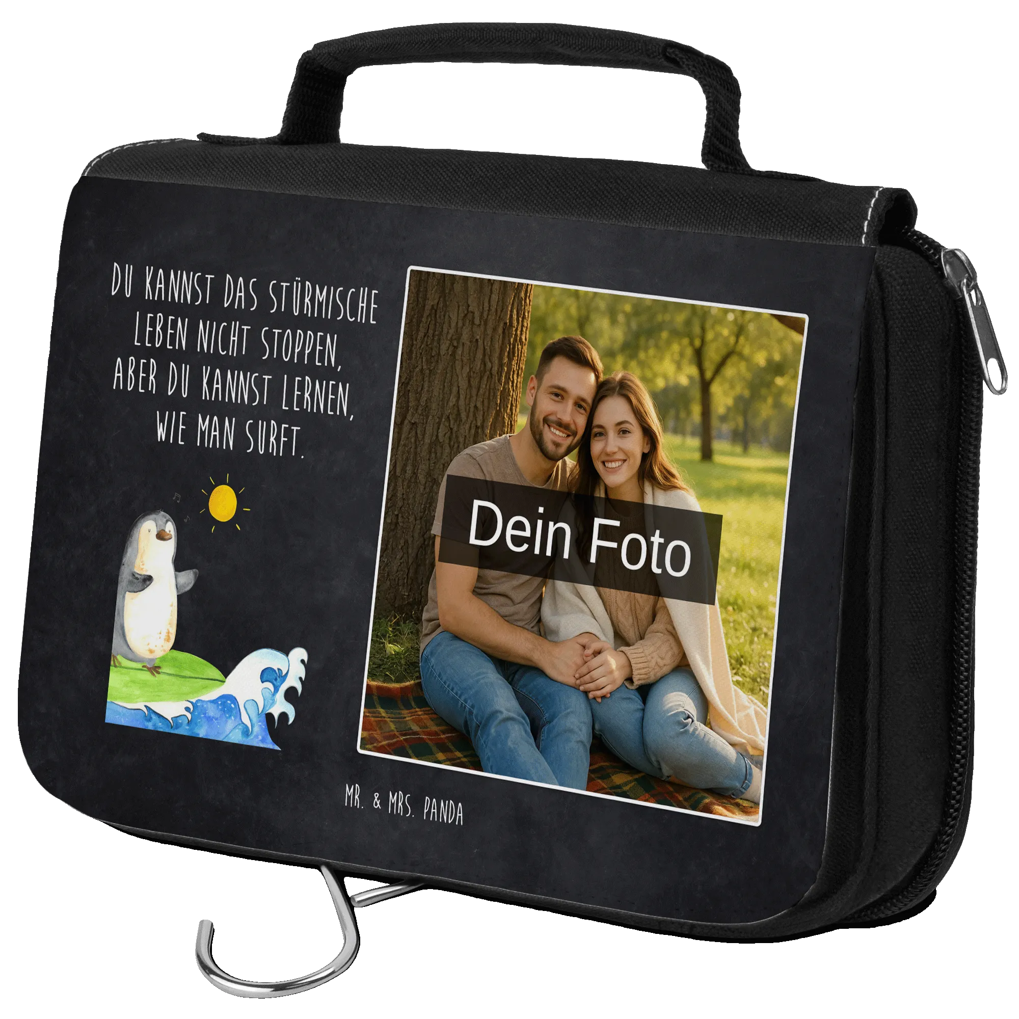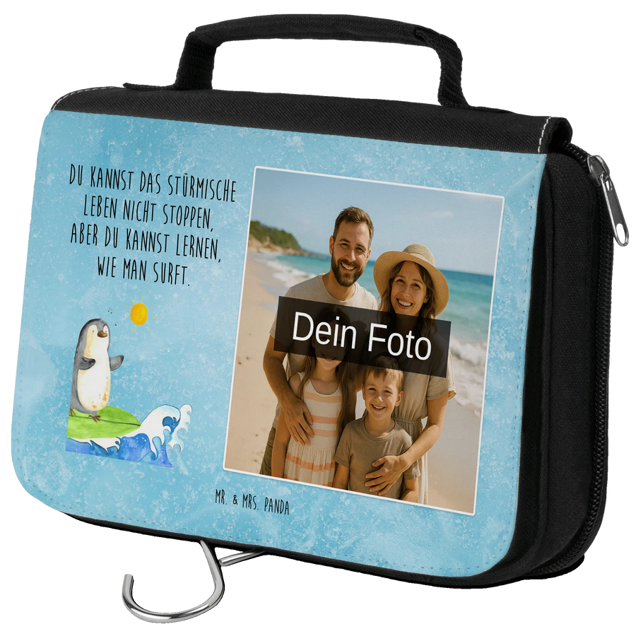 Personalisierter Foto Kulturbeutel Pinguin Surfer – Mr. & Mrs. Panda