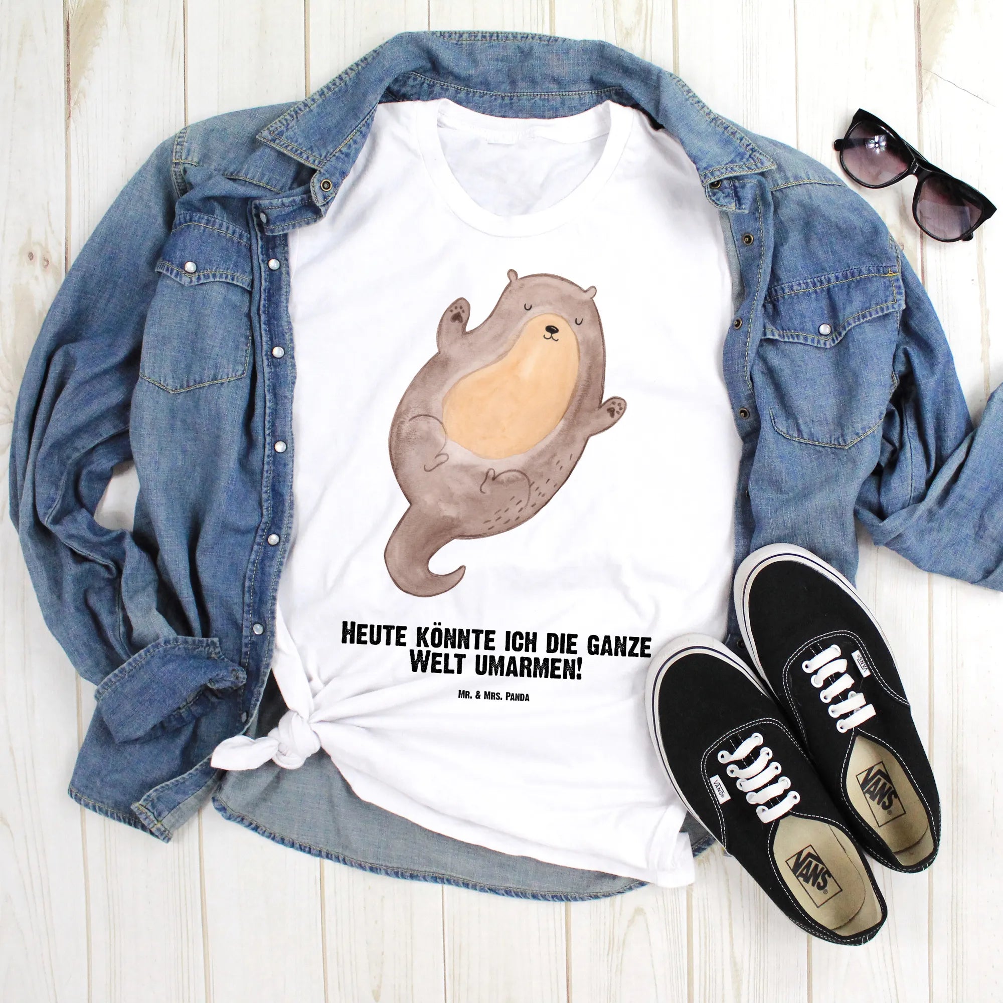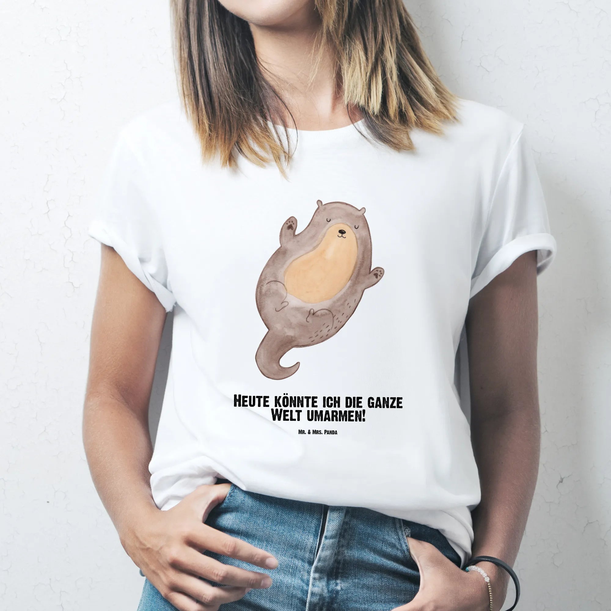 Imagine a delightful little otter floating on its back, arms spread wide, ready to embrace the world with joy. This charming motif captures the essence of that carefree feeling, inviting us to celebrate life to the fullest. With the loving slogan, 'Today, I feel like I could hug the whole world,' this adorable otter brings a smile to your face and warmth to your heart. Just like this otter, let’s open our arms to life’s beautiful possibilities and swim joyfully through each day, cherishing the small moments that fill our hearts with happiness.