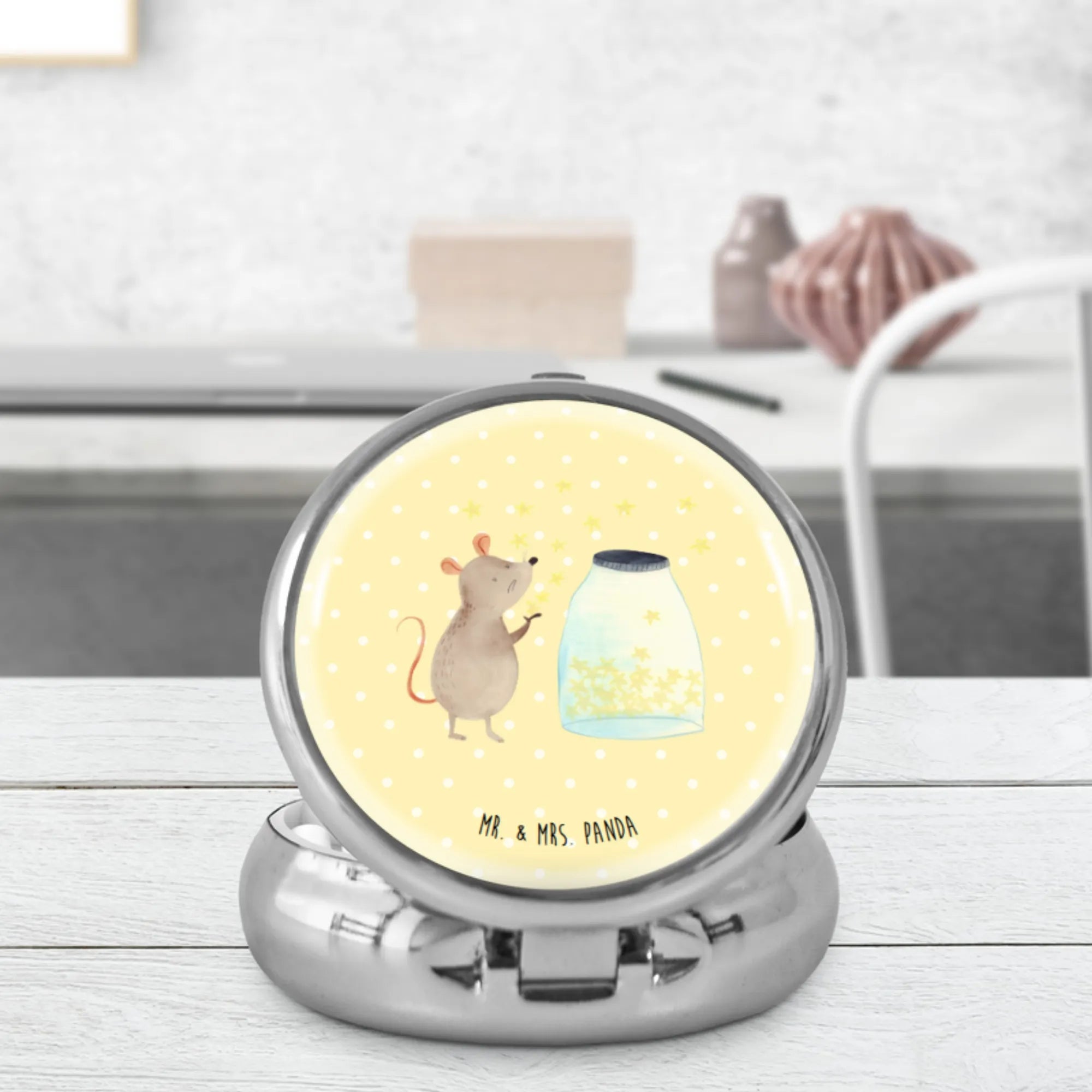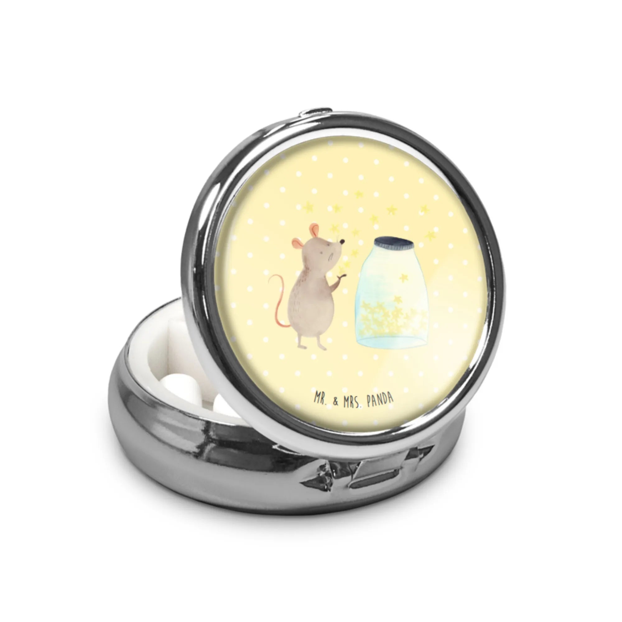 Mr. & Mrs. Panda Pillendose „Maus Sterne“ – eine kleine, liebevolle Tablettenbox aus der beliebten Small World-Kollektion. Auf pastellgelbem Hintergrund sitzt eine niedliche Maus vor einem Glas voller funkelnder Sterne und lässt sie in die Welt hinausfliegen. Ein Motiv, das von Hoffnung, Träumen und zarten Momenten erzählt.