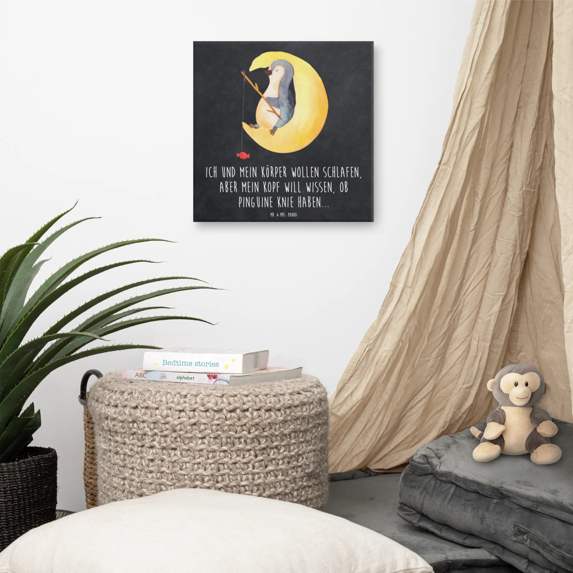 Picture a quaint penguin, snuggled up on a crescent moon, serene under the twinkling stars. With a fishing rod in hand, he's casting for something sweet, his little heart filled with dreams. This delightful motif plays on the contrast of restful slumber and the flurry of nighttime thoughts. A playful nod to insomnia, the saying, 'My body just wants to sleep...while my brain simply has to obsess over whether penguins have knees,' perfectly encapsulates the struggle we all face when trying to unwind. As the world quiets down, our minds often buzz with curious inquiries, and this motif serves as a gentle reminder that it's okay to have those moments. Ideal for your bedroom or guest room, it adds a sprinkle of whimsy while letting you embrace the quirky nature of our nightly thoughts.