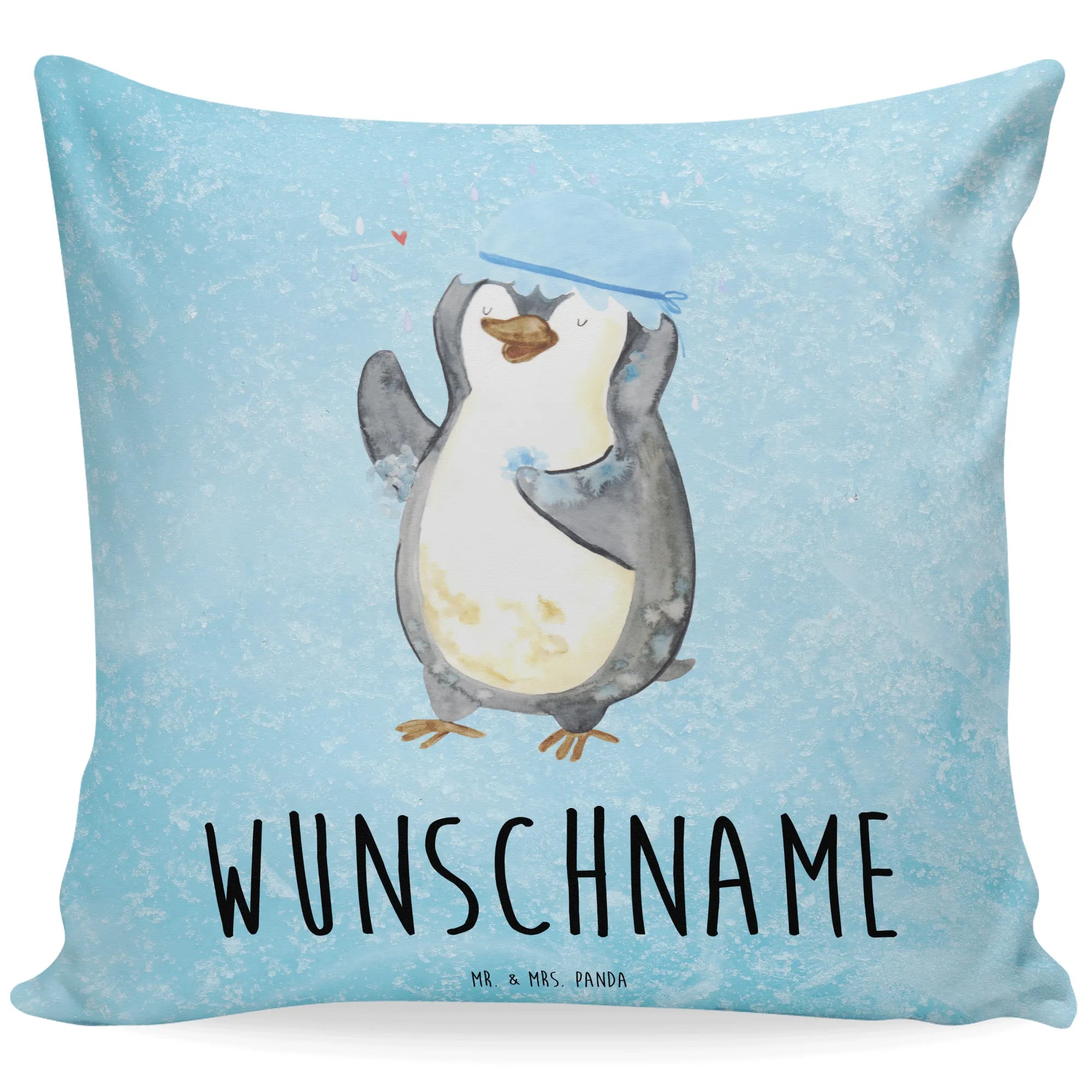 Personalised cushion Penguin have a shower