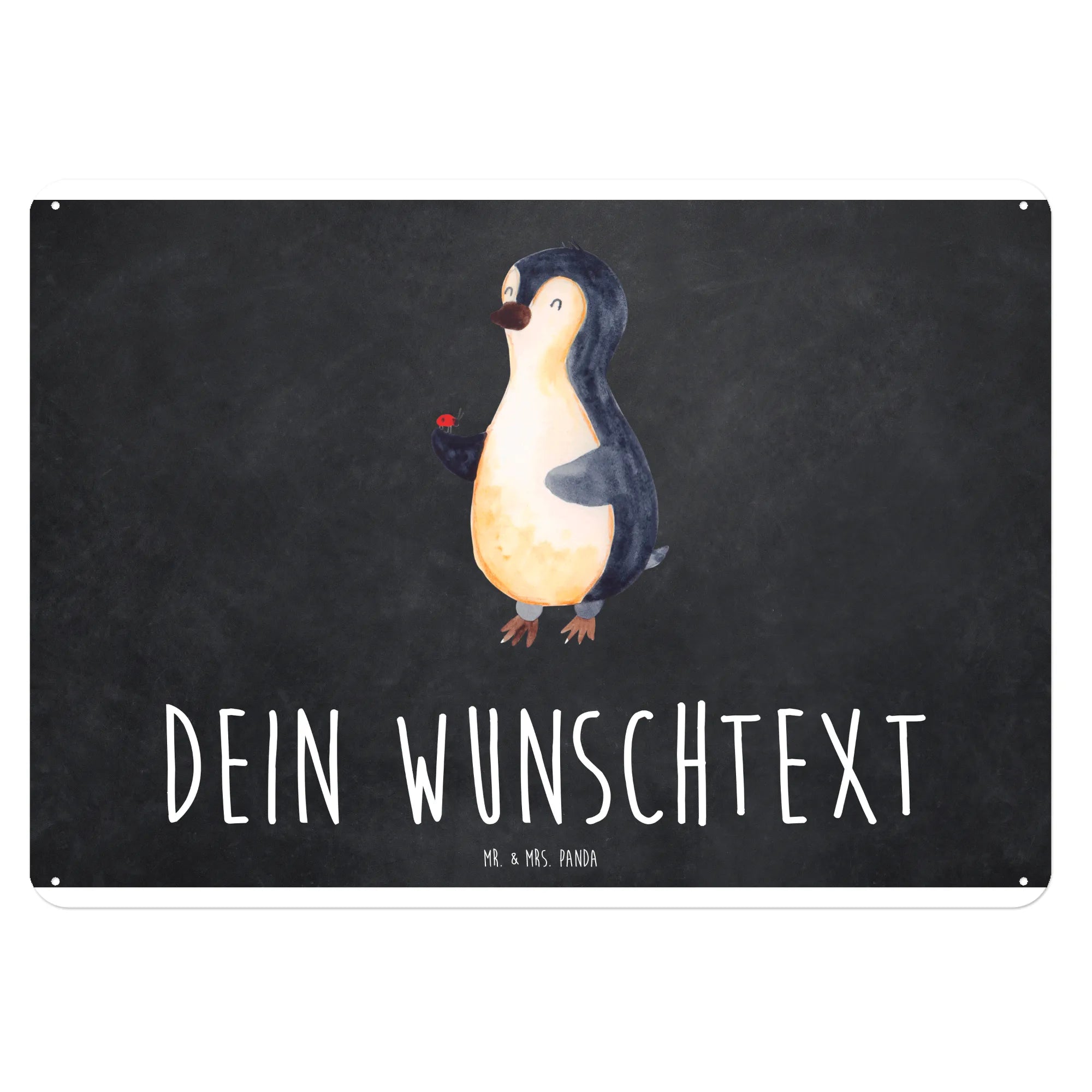 Das personalisierte Blechschild mit dem süßen Pinguin und dem fröhlichen Marienkäfer von Mr. & Mrs. Panda ist das perfekte Geschenk für alle, die Freude, Liebe und Glück in ihr Zuhause bringen möchten.