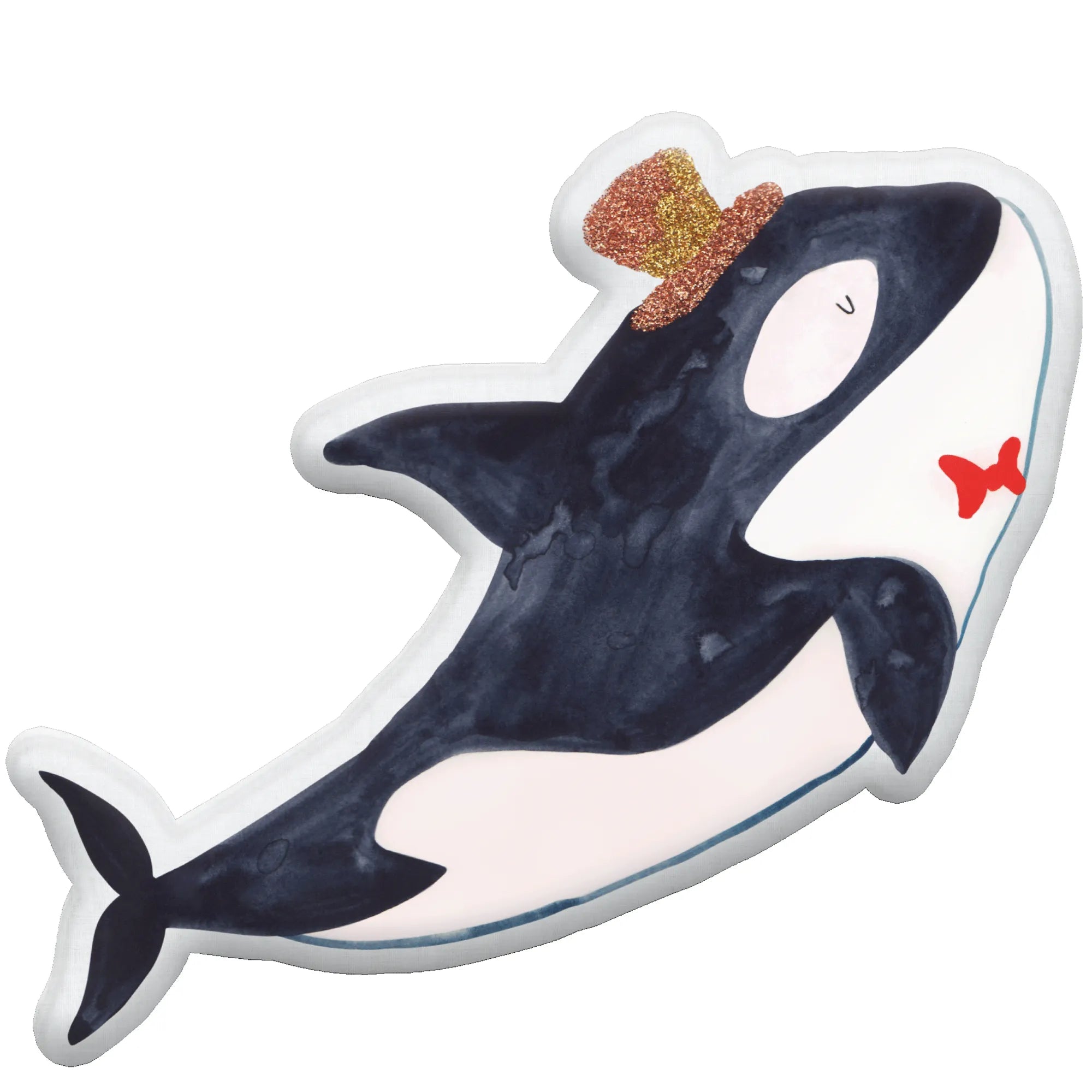 Der freundliche Orca sitzt auf einem weißen Hintergrund und trägt stolz seinen kleinen Zylinder, verziert mit einer bunten Blumenakzentuierung. Das Aquarell-Design ist liebevoll von Mrs. Panda erstellt worden und strahlt gleichzeitig Freude und Wärme aus. Ob für dein eigenes Zuhause oder als Geschenk für einen besonderen Menschen – dieses Kissen ist immer eine hervorragende Wahl.
