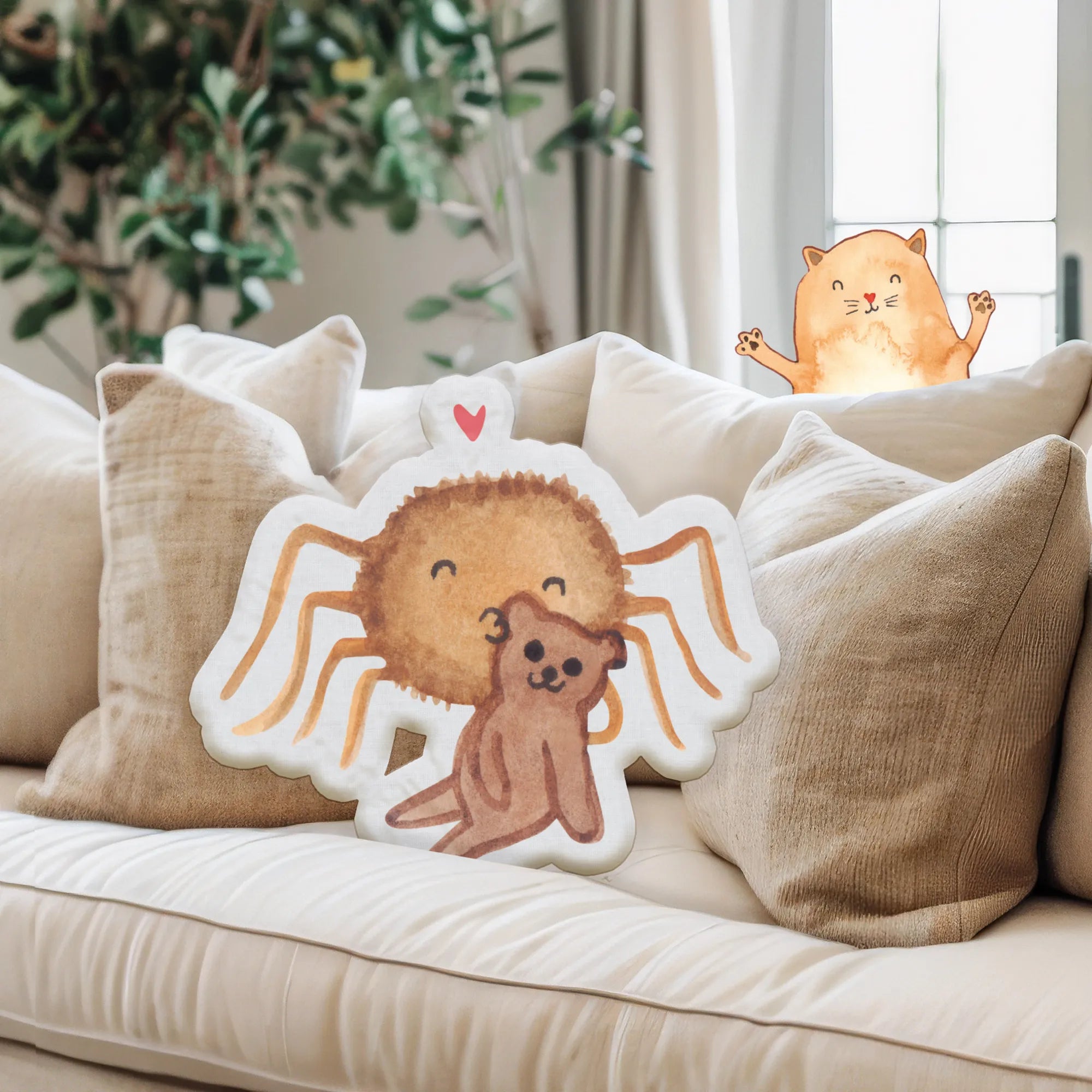 Picture this soft, plush pillow featuring the heartwarming motif of Spider Agathe, a sweet little spider cradling her teddy bear with affectionate delight. With her eyes twinkling with joy and a little heart beside her, Agathe personifies warmth and sincerity, making it a heartfelt expression of love and gratitude.