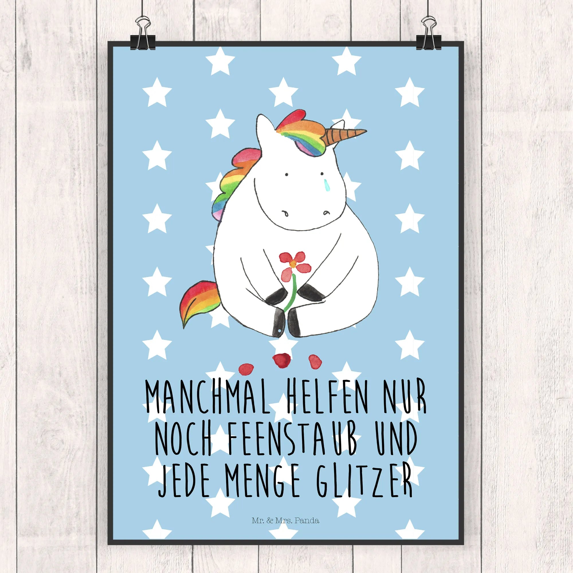 Captured in a moment of deep reflection, our sweet unicorn motif presents a tender glimpse into sadness, beautifully adorned with a sparkling tear. This image conveys that even the most enchanting creatures have their difficult days. The saying 'Manchmal helfen nur noch Feenstaub und jede Menge Glitzer' expresses a heartfelt sentiment that resonates with anyone who has faced grief. With blooming flowers encircling our unicorn, it serves as a symbol of hope and healing through friendship and love. This touching illustration encourages us to embrace our feelings and seek the comfort of those we cherish. Remember, it’s okay to feel vulnerable; those moments can lead to a stronger bond with our loved ones. Let this lovely motif be a reminder that sharing our struggles can help us rediscover joy and sprinkle a little magic back into our lives.