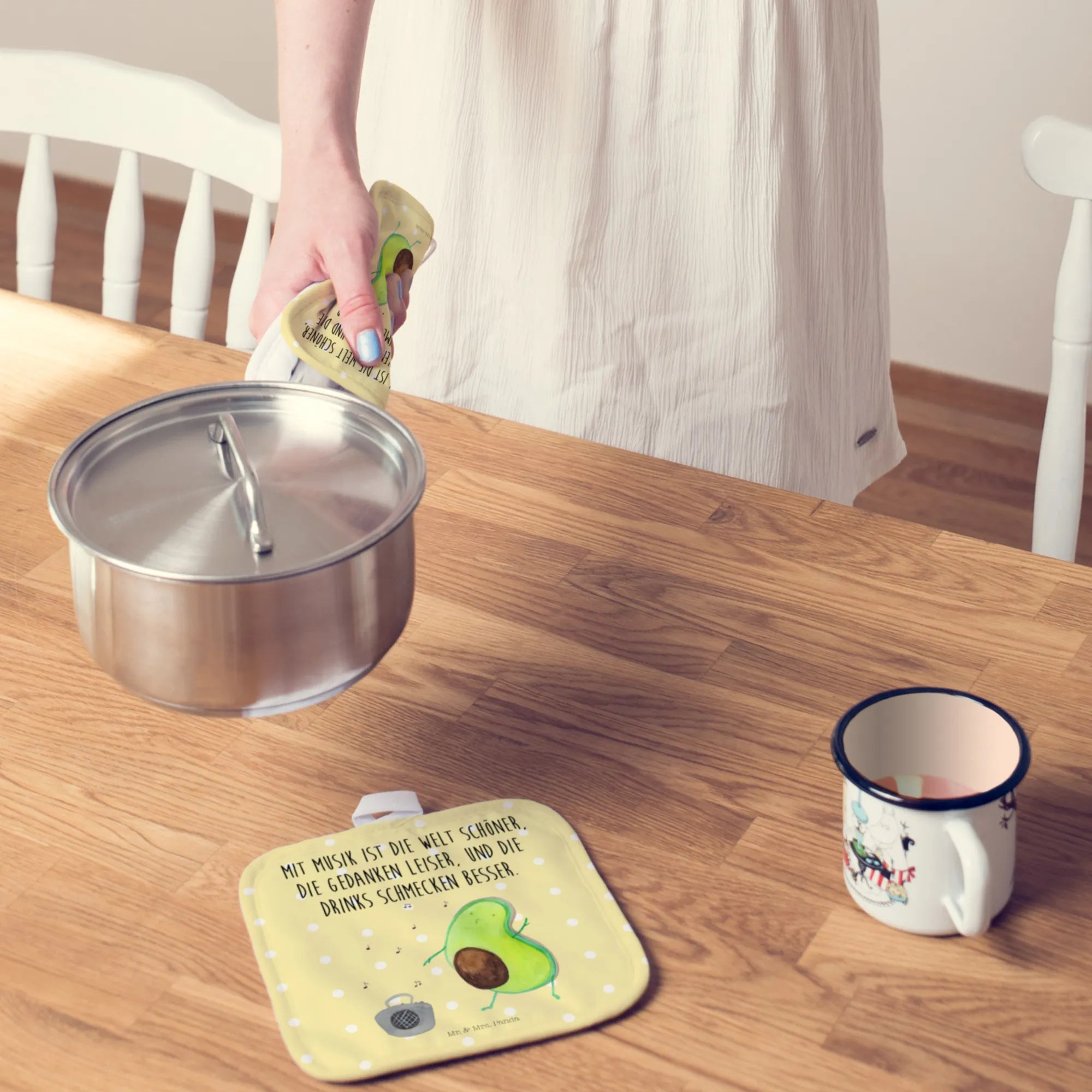The Avocado collection is all about optimism and positive energy. Each product, including our delightful pot holders, is lovingly crafted with hand-drawn designs that are meant to brighten your day. This particular pot holder showcases an adorable avocado grooving in front of a ghettoblaster, radiating joy and reminding you that cooking can be a happy, dance-filled experience.