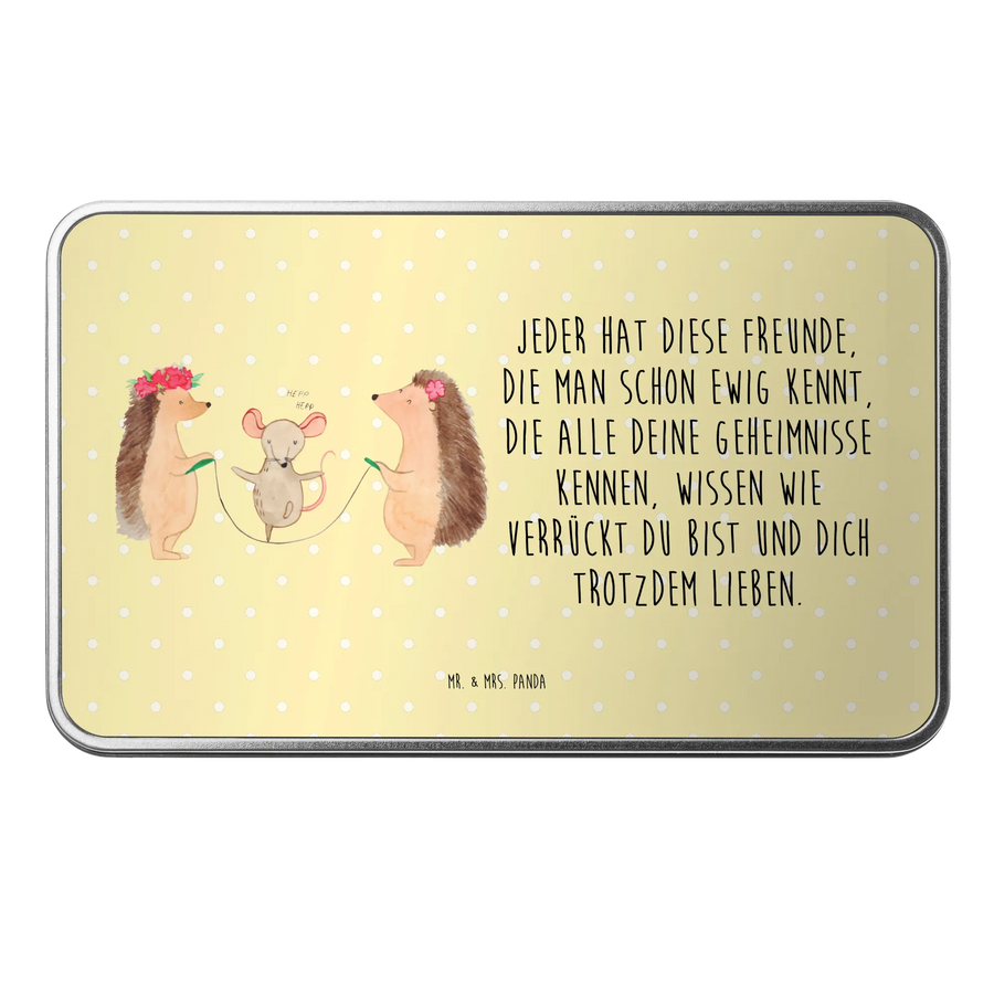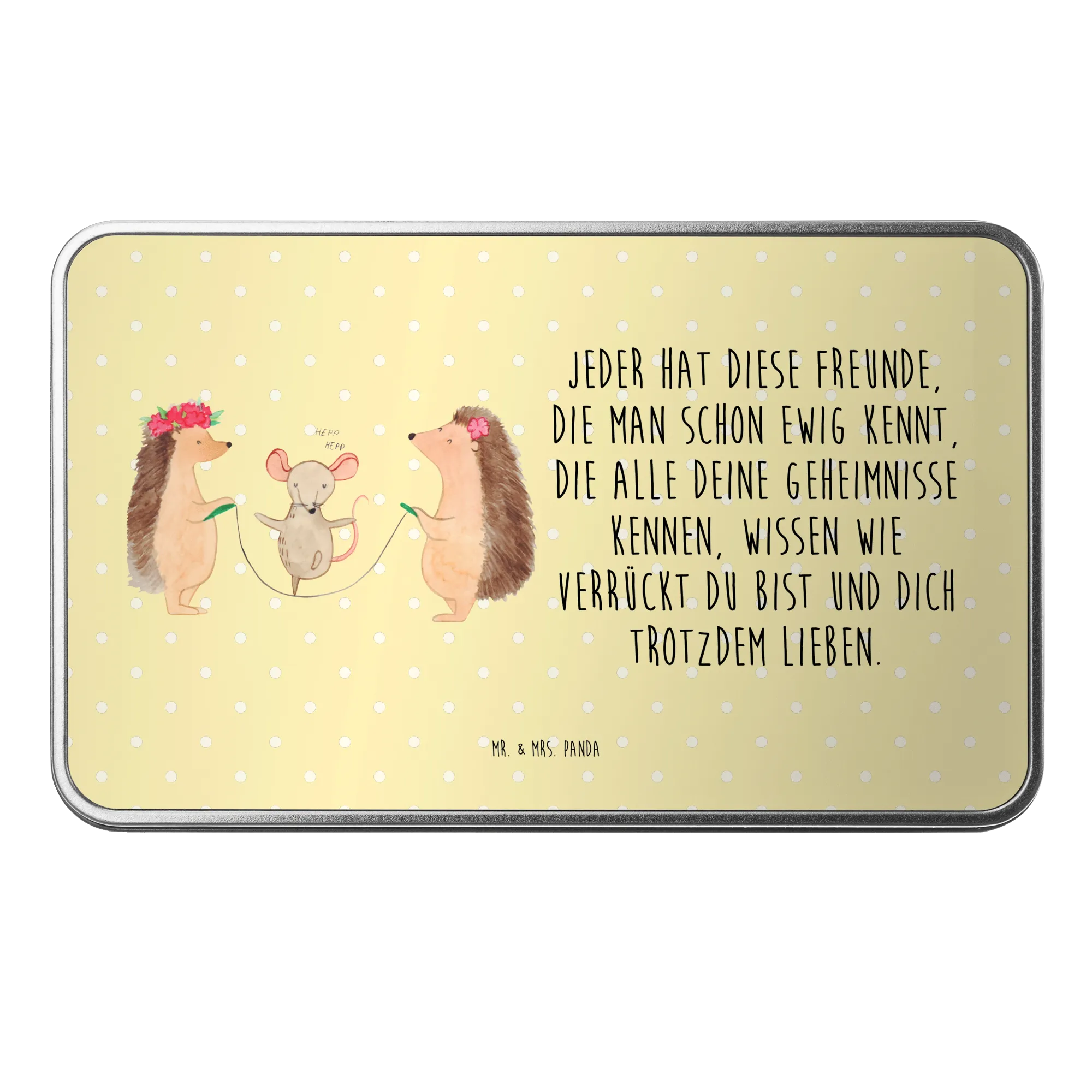Metal tin Hedgehog skipping storage box, tin box, lock-up box, tins, cookie tin, storage tin, aluminium tin, Tin can, lunch box, metal box, container, small animals, cute, funny, cute animal motives, hand drawn, small world, funny sayings, good mood, happy, gifts, gift ideas, special gifts, animal lover, card, kindergarten, rope skipping, children, hedgehog, mouse