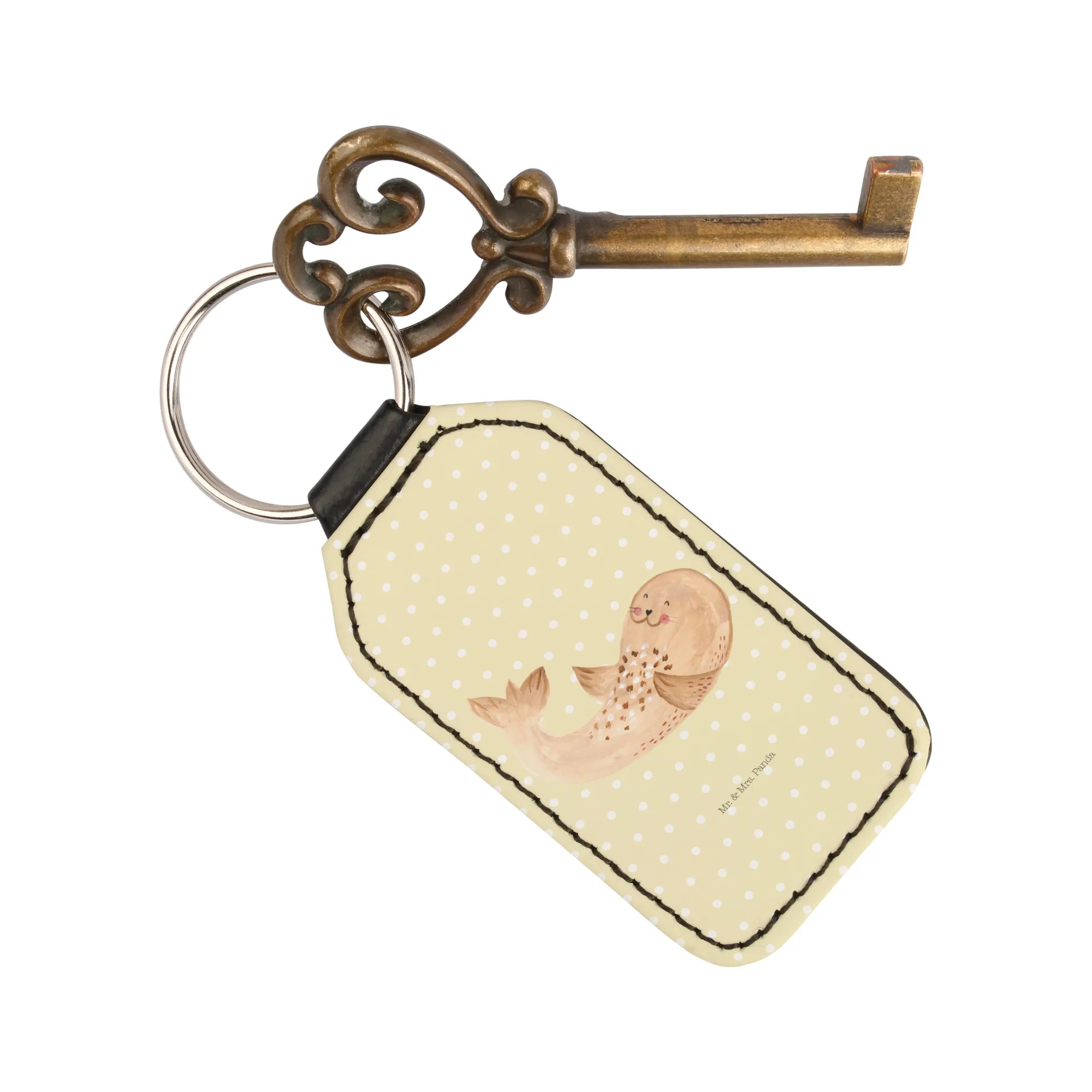Dieser niedliche, rechteckige Schlüsselanhänger zeigt eine gemütlich liegende Robbe auf warmem Pastellgelb und bringt sofort gute Laune in deinen Alltag. Die liebevoll gezeichnete Robbe erinnert an Strandspaziergänge und faule Stunden am Meer – perfekt für alle, die Nordsee- oder Ostsee-Feeling immer bei sich tragen möchten.