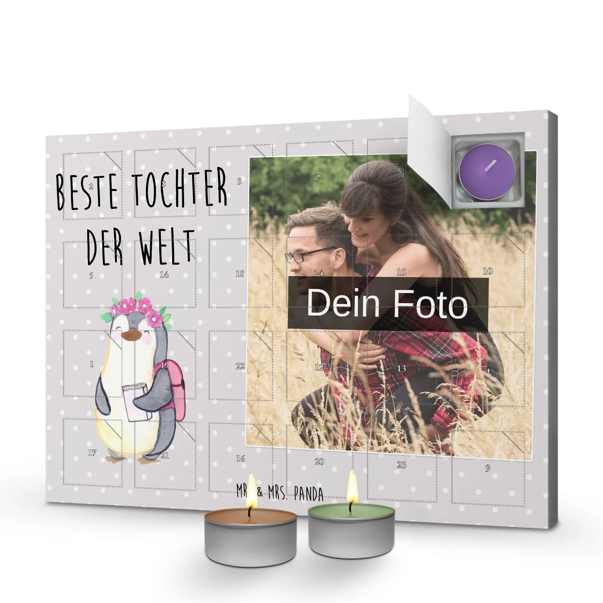 Der personalisierte Duftkerzen Foto Adventskalender 'Pinguin Beste Tochter der Welt' von Mr. & Mrs. Panda ist das perfekte Geschenk für all die wunderbaren Töchter da draußen. Egal ob zum Geburtstag, zur Geburt oder einfach als Dankeschön für die kleinen und großen Glücksmomente im Leben – dieser Adventskalender zaubert mit seinen liebevollen Designs und herzlichen Sprüchen ein Lächeln ins Gesicht deiner Tochter. Der süße Pinguin mit Blumen auf dem Kopf und einem Rucksack auf dem Rücken wird sofort die Herzen der Beschenkten erobern.