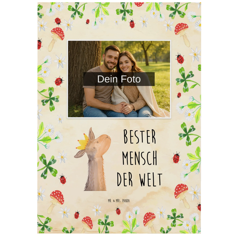 Unsere personalisierte Foto Postkarte „Lama Bester Mensch der Welt“ aus der Beziehungen-Kollektion von Mr. & Mrs. Panda verbindet ein zuckersüßes Lama-Motiv mit deiner eigenen Fotografie und dem fröhlichen Spruch „Bester Mensch der Welt“. So entsteht ein Geschenk, das Herz zeigt und gleichzeitig stilvoll aussieht.
