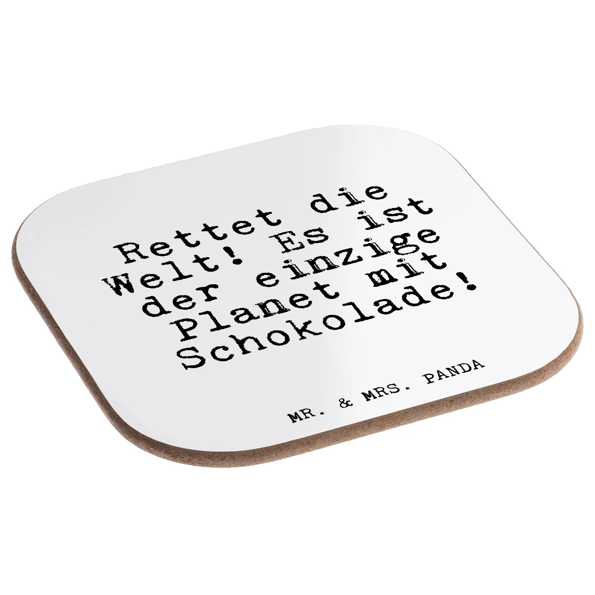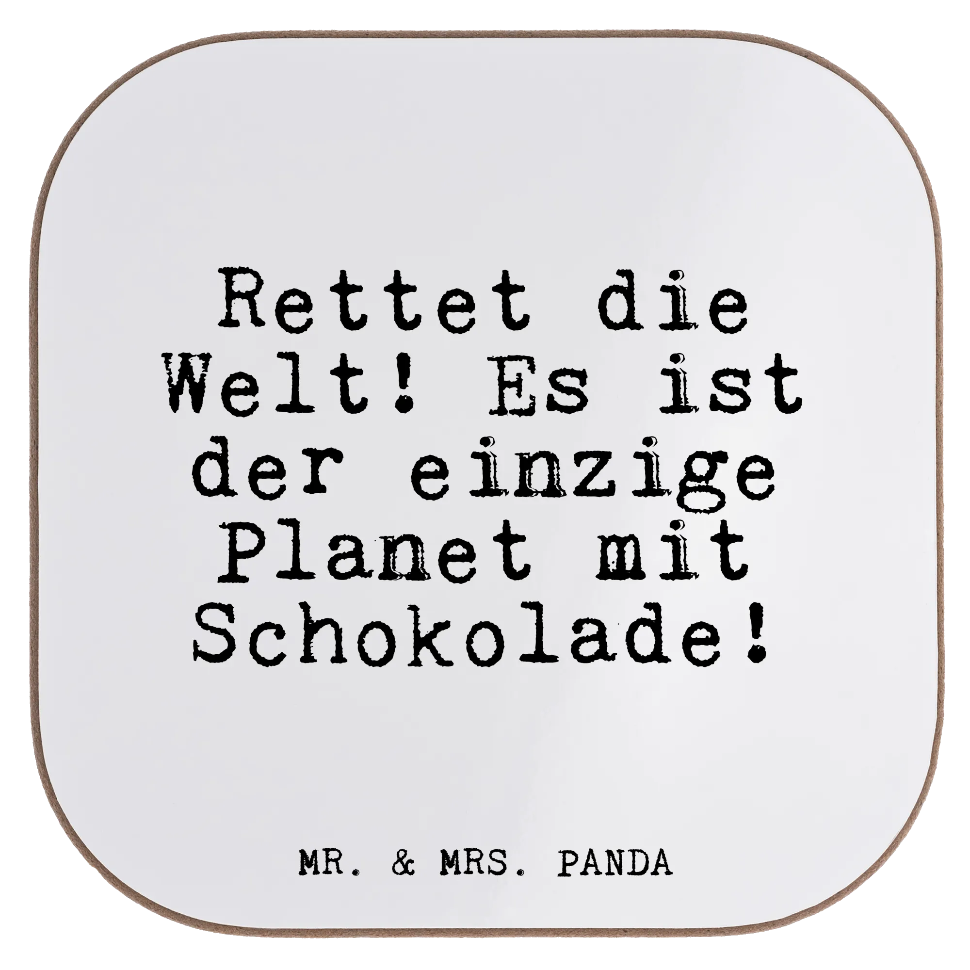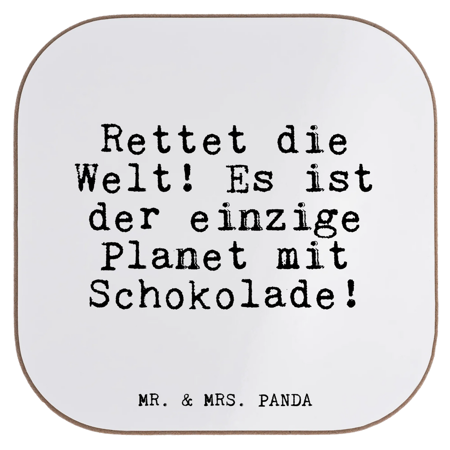 Ein wunderschöner quadratischer Untersetzer von Mr. & Mrs. Panda: bedruckt mit dem frechen Spruch „Rettet die Welt! Es ist der einzige Planet mit Schokolade!“. Dieser Design Untersetzer vereint Humor und praktische Funktion – perfekt als Glasuntersetzer, Tassenuntersetzer oder Becheruntersetzer.