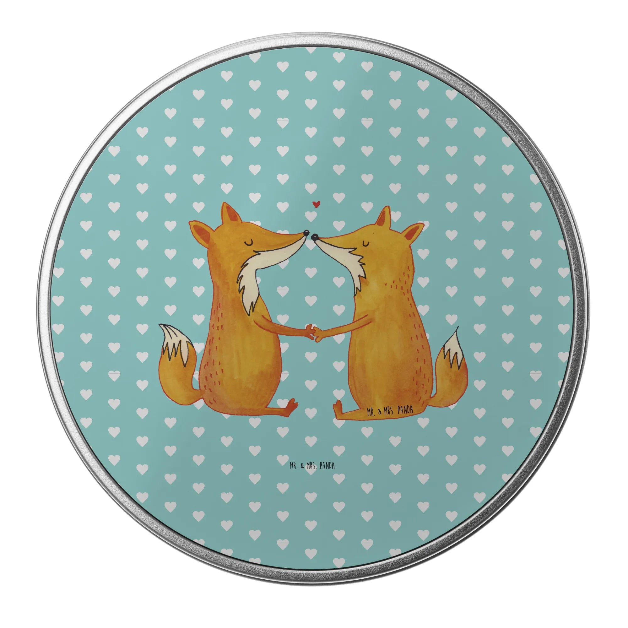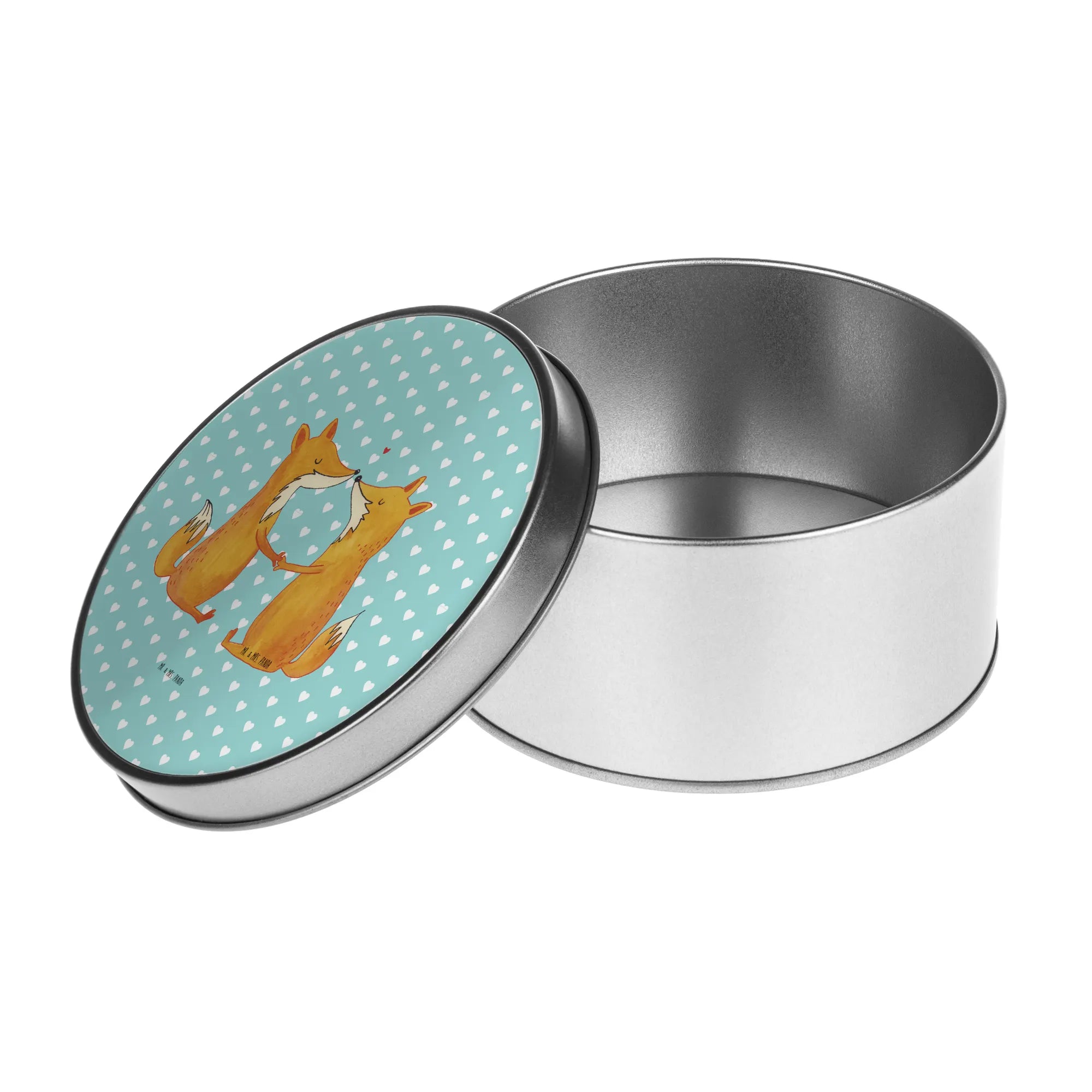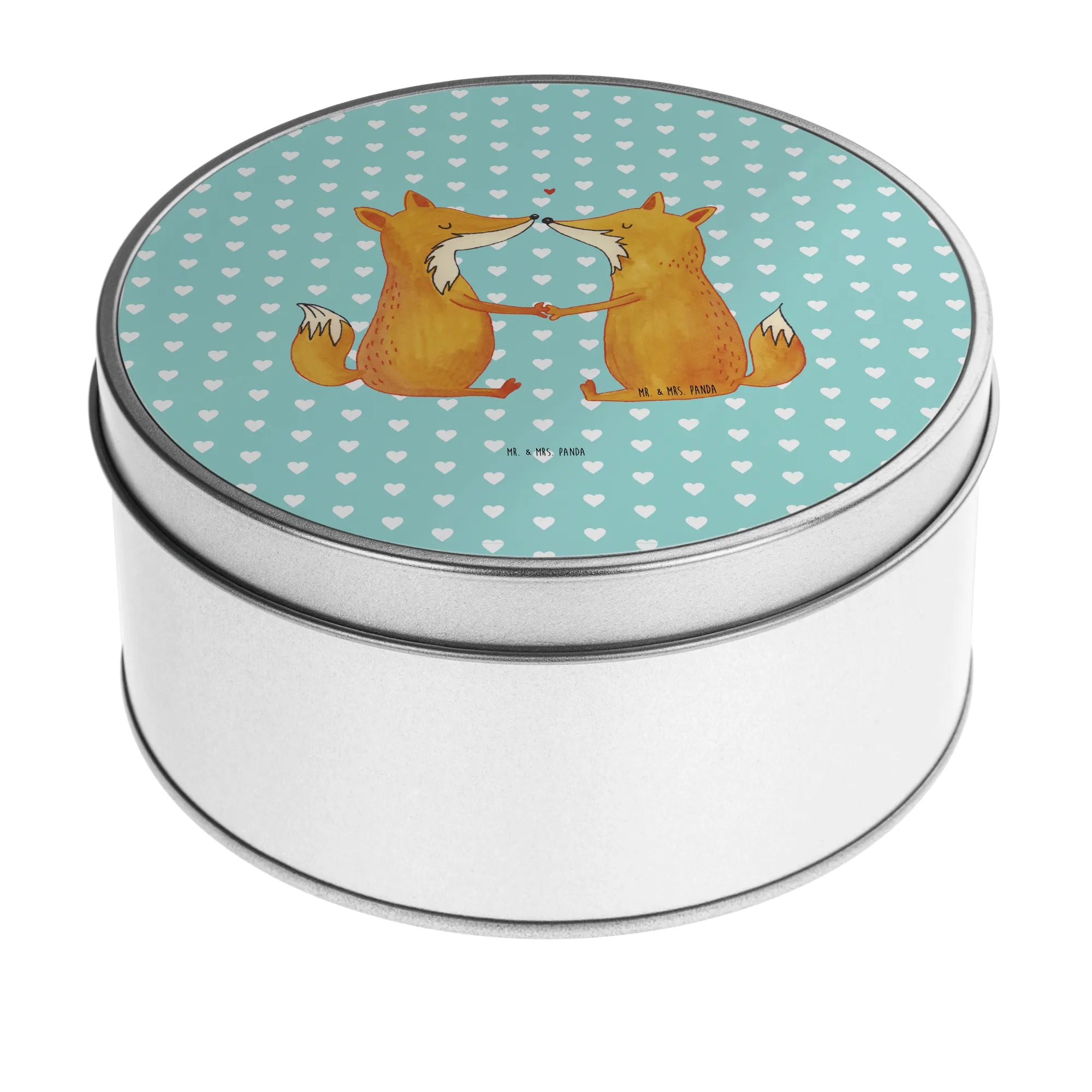 Introducing the delightful Round Tin featuring the enchanting "Foxes in Love" design from Mr. & Mrs. Panda! This beautifully crafted tin is more than just a storage solution; it is a heartfelt gift perfect for lovers, couples, and anyone wishing to remind someone special of their affection. Its charming motif encapsulates the essence of love, showcasing two adorable foxes holding hands across a stunning pastel turquoise background. This timeless design is ideal for any occasion—be it a wedding, anniversary, Valentine’s Day, or simply as a proof of love to your partner, girlfriend, boyfriend, fiancée, husband, or wife.