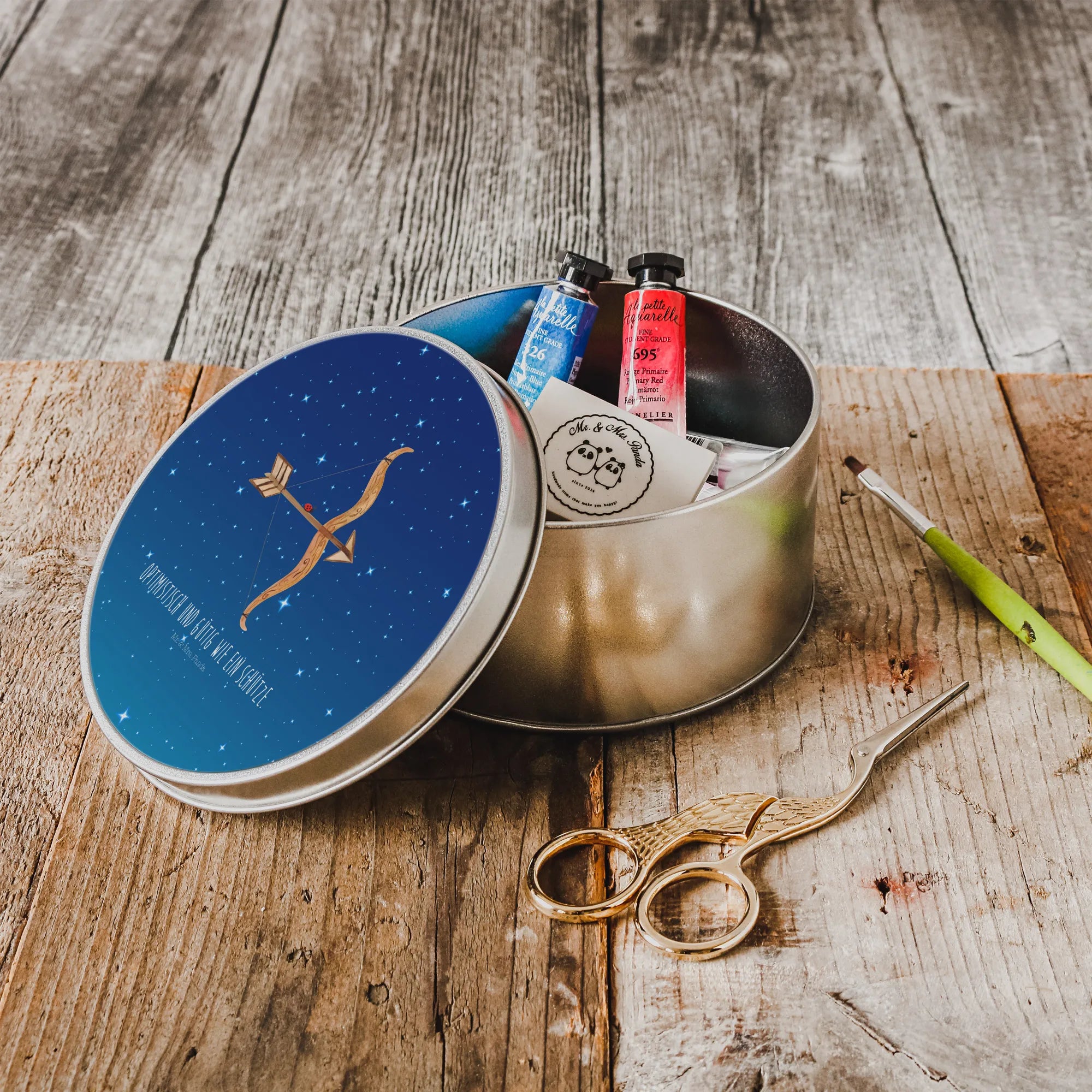 What makes this tin truly special is its stunning design, showcasing the Sagittarius motif, which depicts the spirited nature of this zodiac sign. Sagittarius, represented by the archer, is known for its optimistic and kind-hearted traits. The inscription "Optimistisch und gütig wie ein Schütze" adds a personal touch, beautifully encapsulating the essence of Sagittarius individuals. When you gift this tin, you’re not just giving a storage solution; you’re sharing a piece of the zodiac that celebrates the joyful and adventurous spirit of November and December birthdays.