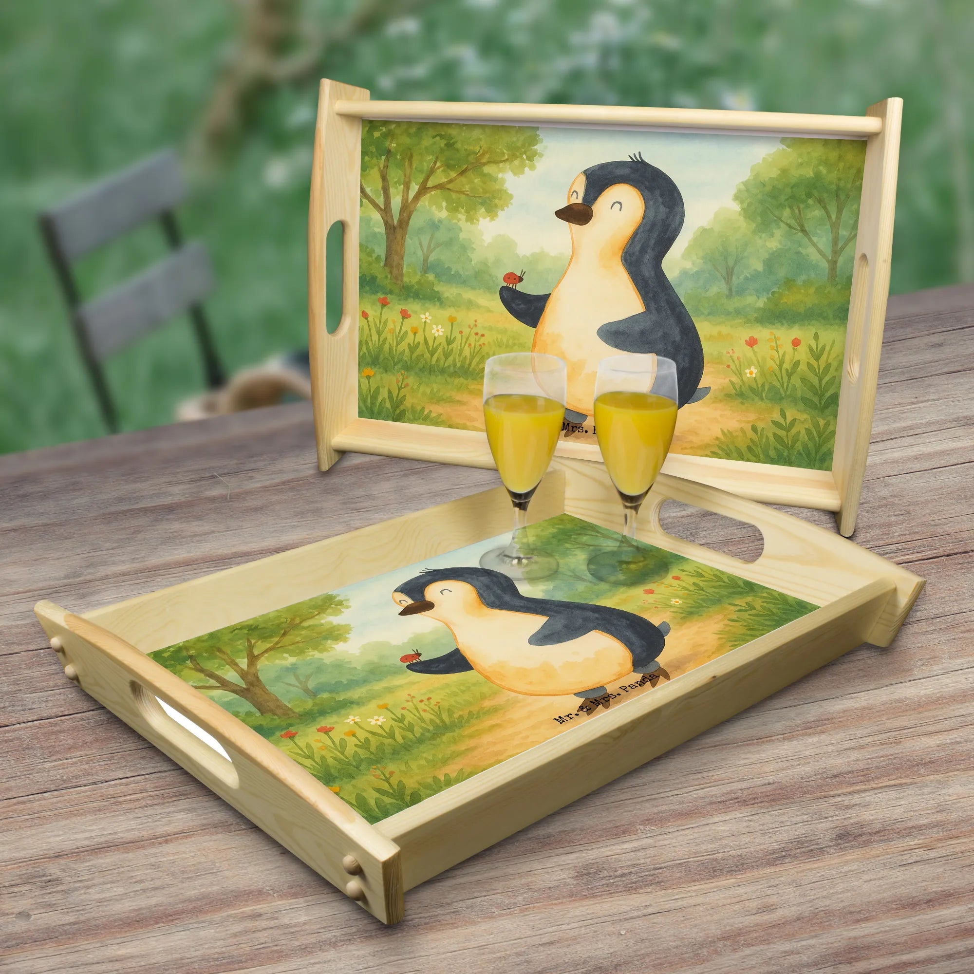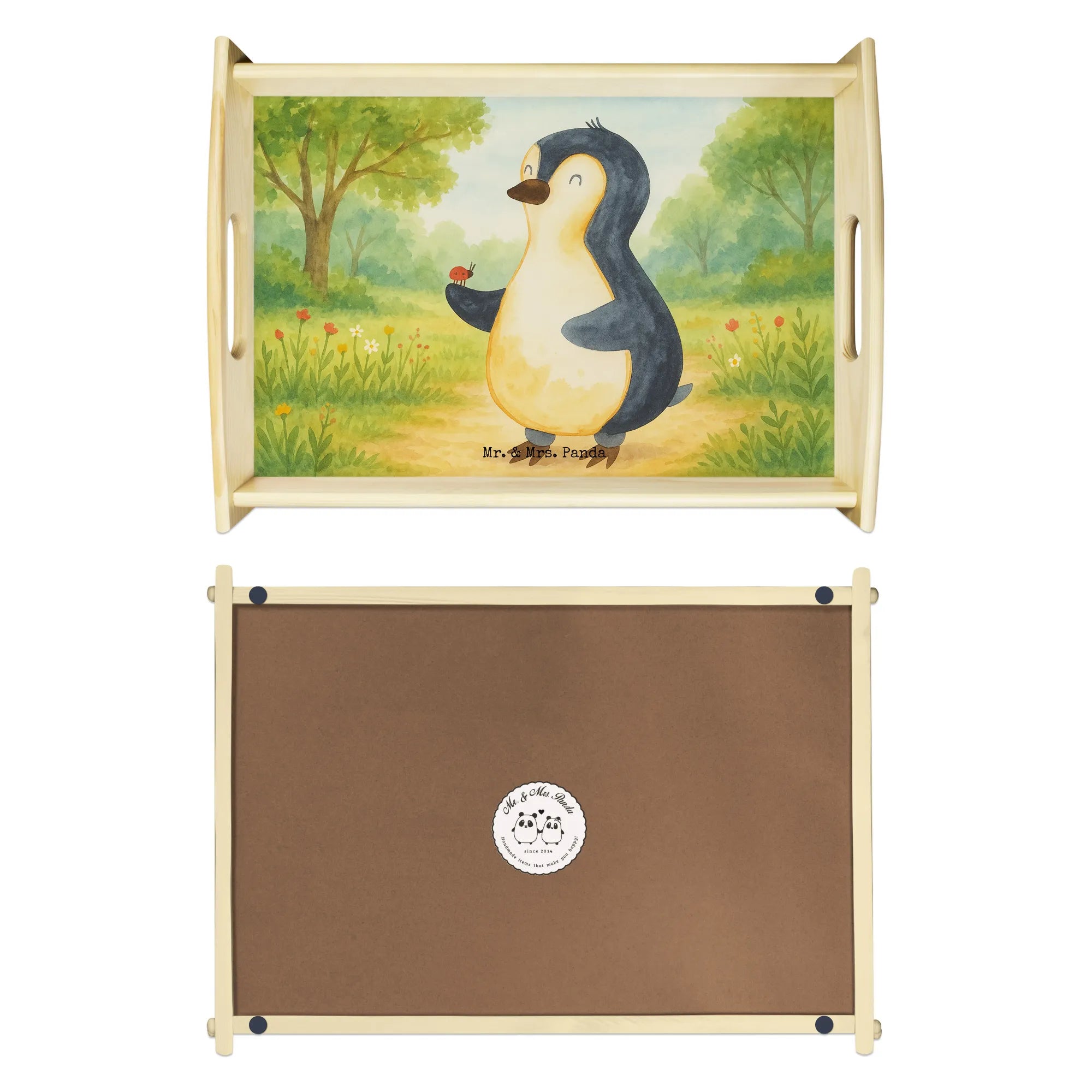 Das einzigartige Serviertablett von Mr. & Mrs. Panda wird dein Frühstücksbuffet zum Erlebnis machen! Mit seinen großzügigen Maßen von 480 mm x 480 mm x 65 mm und einem Gewicht von 925 g ist es die perfekte Kombination aus Funktionalität und Stil. Aus hochwertigem, lasiertem Echtholz gefertigt, verzückt das Tablett mit einem strahlenden Druck, der für gute Laune sorgt. Ob im Bett oder auf dem Sofa, die seitlichen Griffmulden garantieren ein angenehmes Handling. Die spezielle Anti-Rutsch Beschichtung sorgt dafür, dass alles sicher an seinem Platz bleibt. Dank der kratzfesten Oberfläche ist das Tablett sehr pflegeleicht – einfach mit einem feuchten Tuch und etwas Spülmittel abwischen. Bitte nicht einweichen! Denke daran, dass die Anfertigung wegen der hohen Qualität etwas Zeit in Anspruch nimmt.
