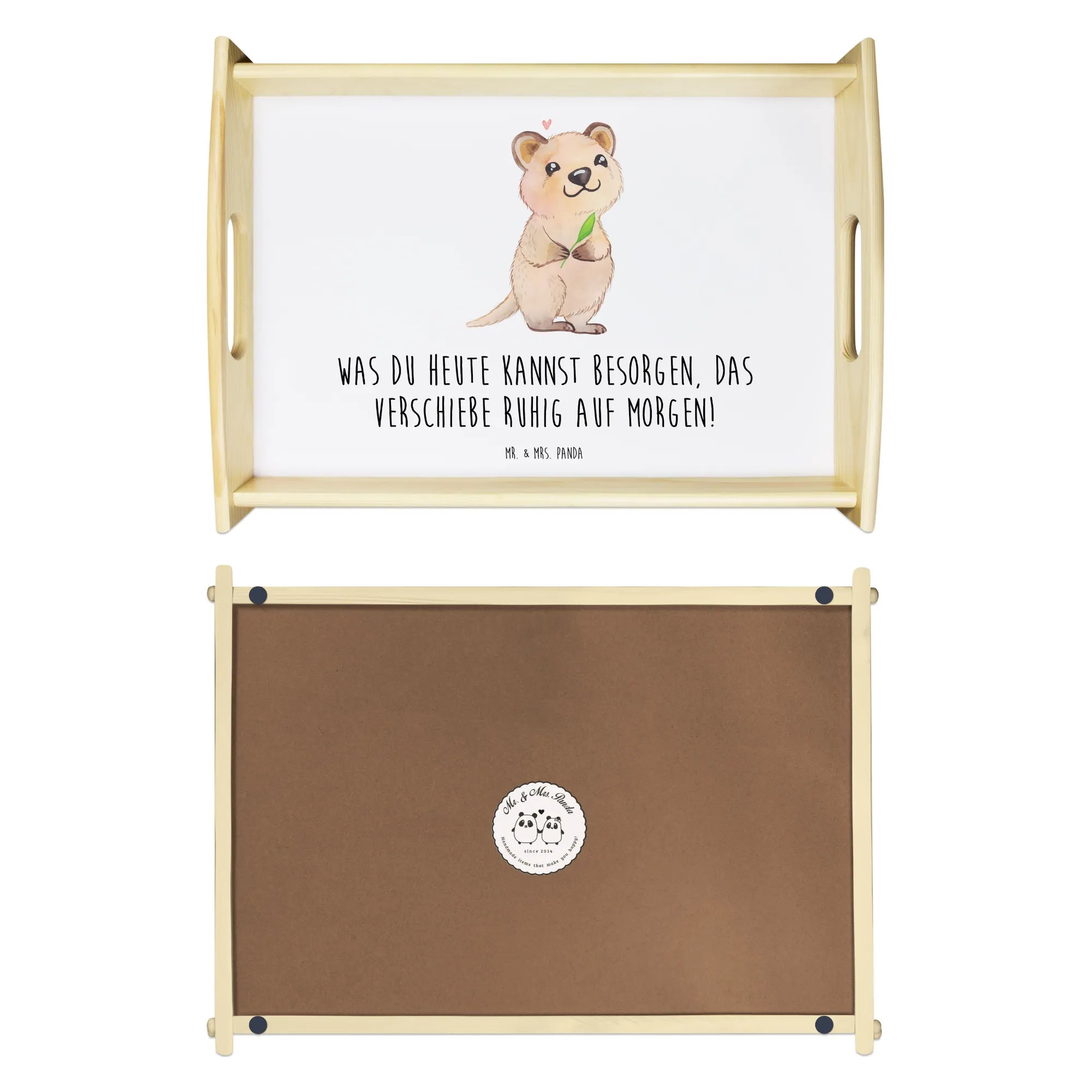Introducing the enchanting Mr. & Mrs. Panda Serving Tray, a delightful addition to your home that blends style and functionality. Measuring 480 mm (19 inches) in length and width, with a height of 65 mm (3 inches), this wooden tray is perfect for those lazy Sunday breakfasts in bed or cozy dinners on the couch. Made from beautifully lacquered solid wood, its sturdy construction ensures durability, while the scratch-resistant surface keeps it looking pristine. The stunning designs and heartfelt quotes printed on the tray bring warmth and charm to your living space. It features convenient side handles for easy transportation and anti-slip pads on the bottom for added stability and safety. Caring for your tray is simple; just wipe it with a damp cloth and a bit of dish soap—just remember, no soaking! Please note that due to the intricate manufacturing process, this item may take a little longer to ship. Treat yourself or a loved one to this one-of-a-kind serving tray, ideal for entertaining or simply enjoying life's little pleasures.