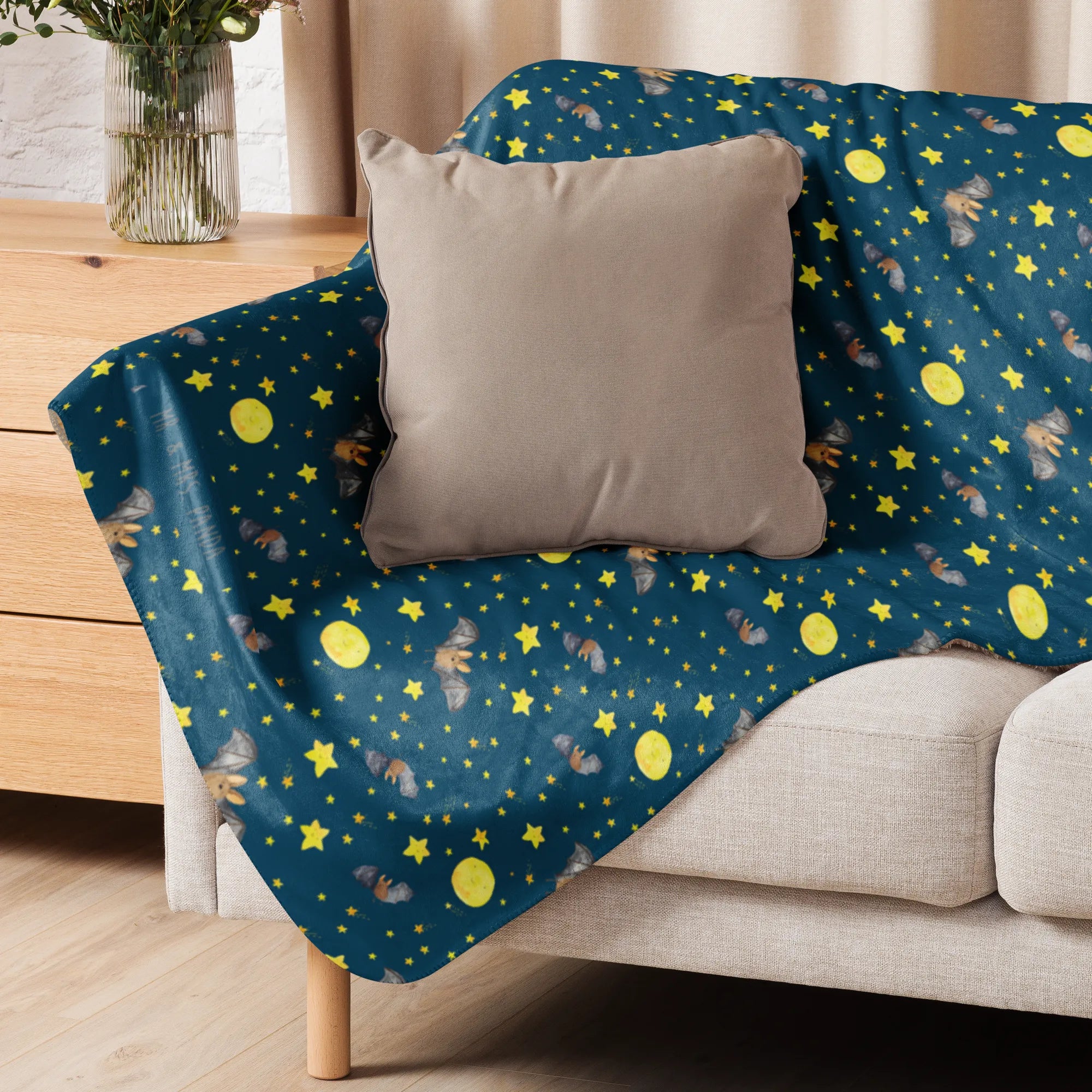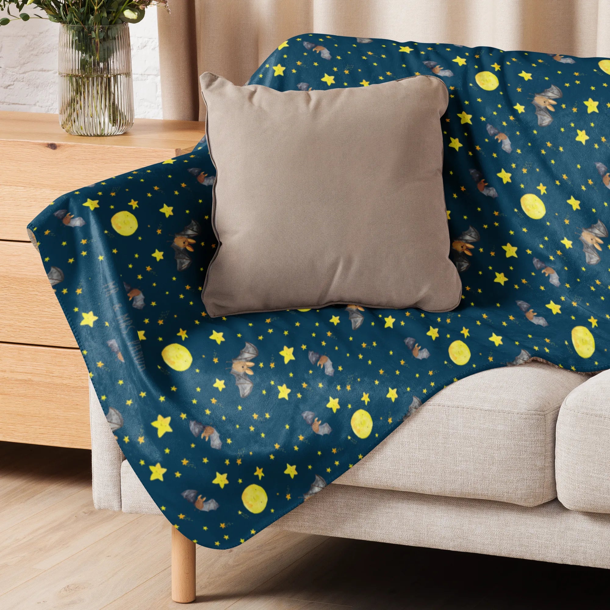 With its strikingly vibrant blue background and the hand-drawn design of our cute little bat soaring through the night sky, it’s a perfect addition to any animal lover's collection. This blanket serves not just for snuggling, but also as an eye-catching throw for your couch or bed, adding a splash of color and cheer to your décor.