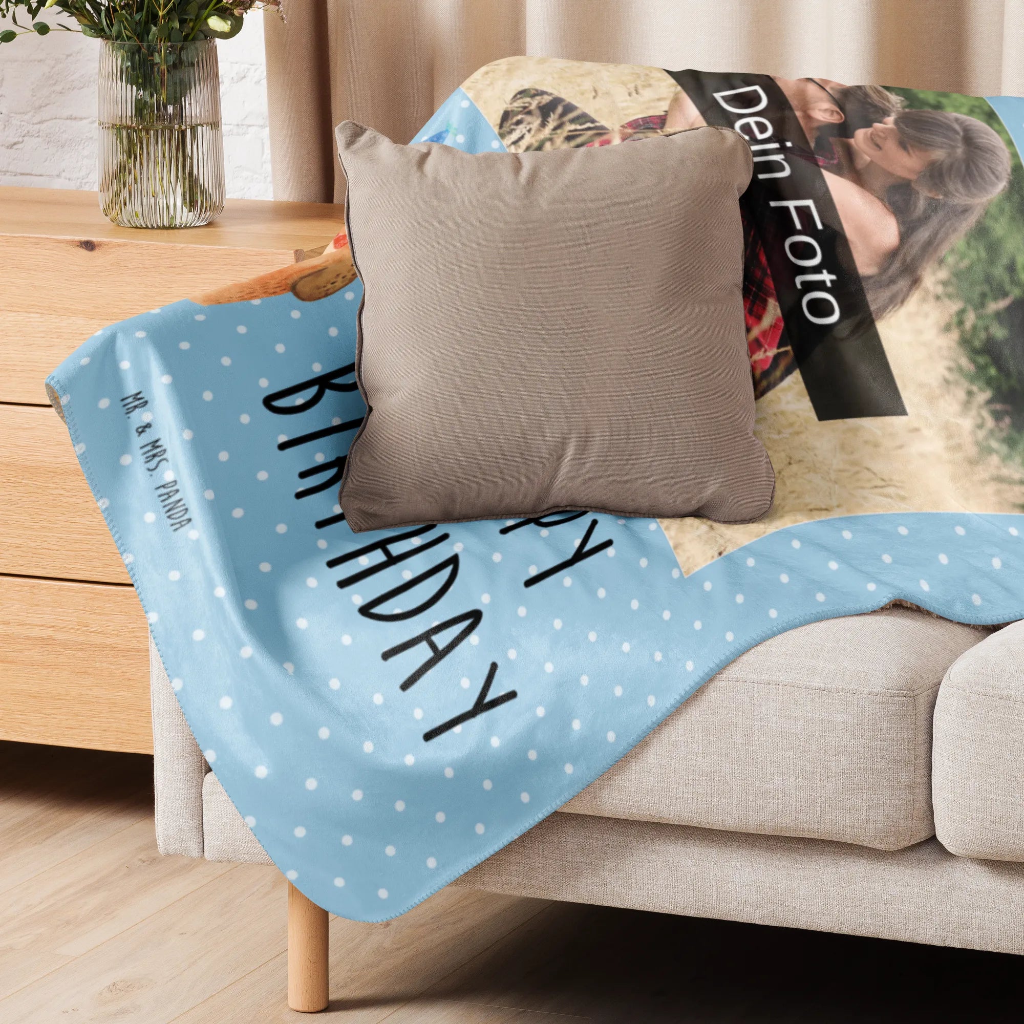 Discover unparalleled coziness with our Sherpa photo cuddle blanket. This customizable blanket combines high-quality printing with an incomparably soft fabric made from ultra-soft polyester fibers. Snuggle up while enjoying the vibrant colors and cute designs of Mr. & Mrs. Panda along with your favorite photo. Our blanket, perfect as a throw or for relaxing hours on the couch, offers not only unmatched warmth but also a personalized experience.