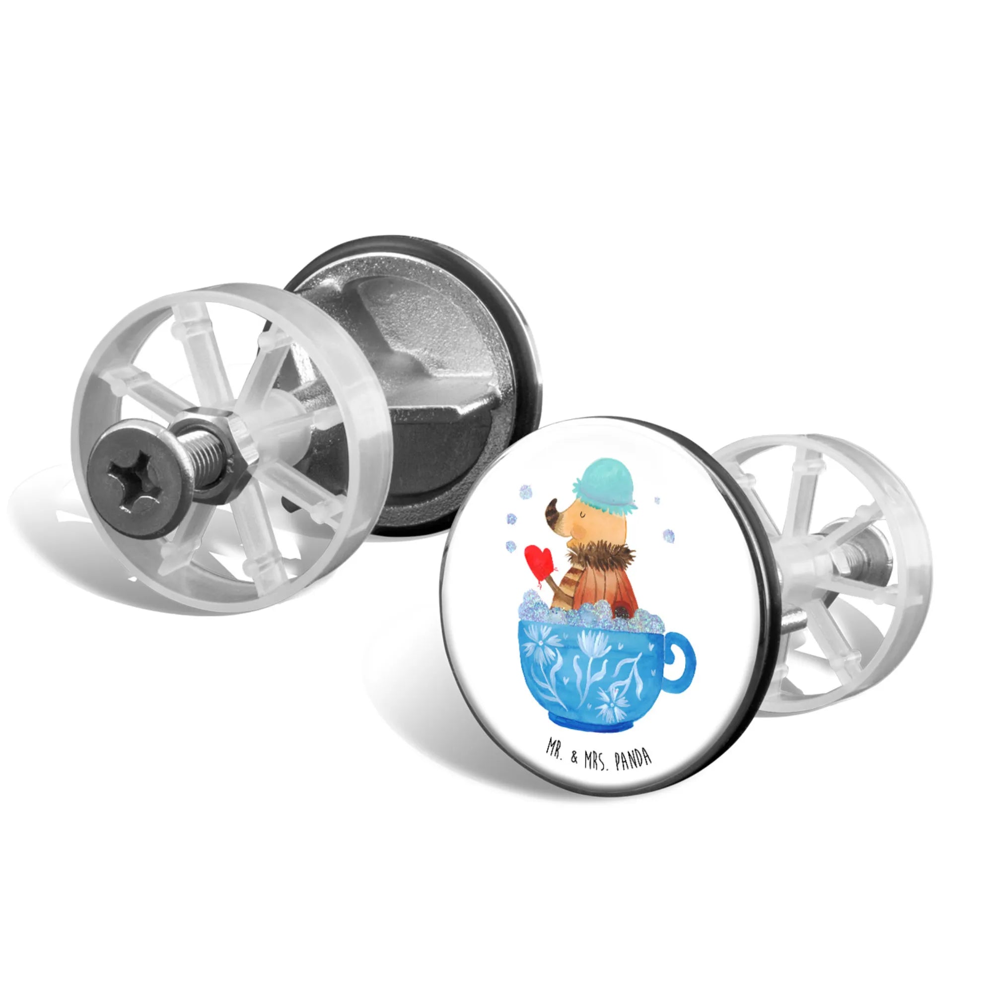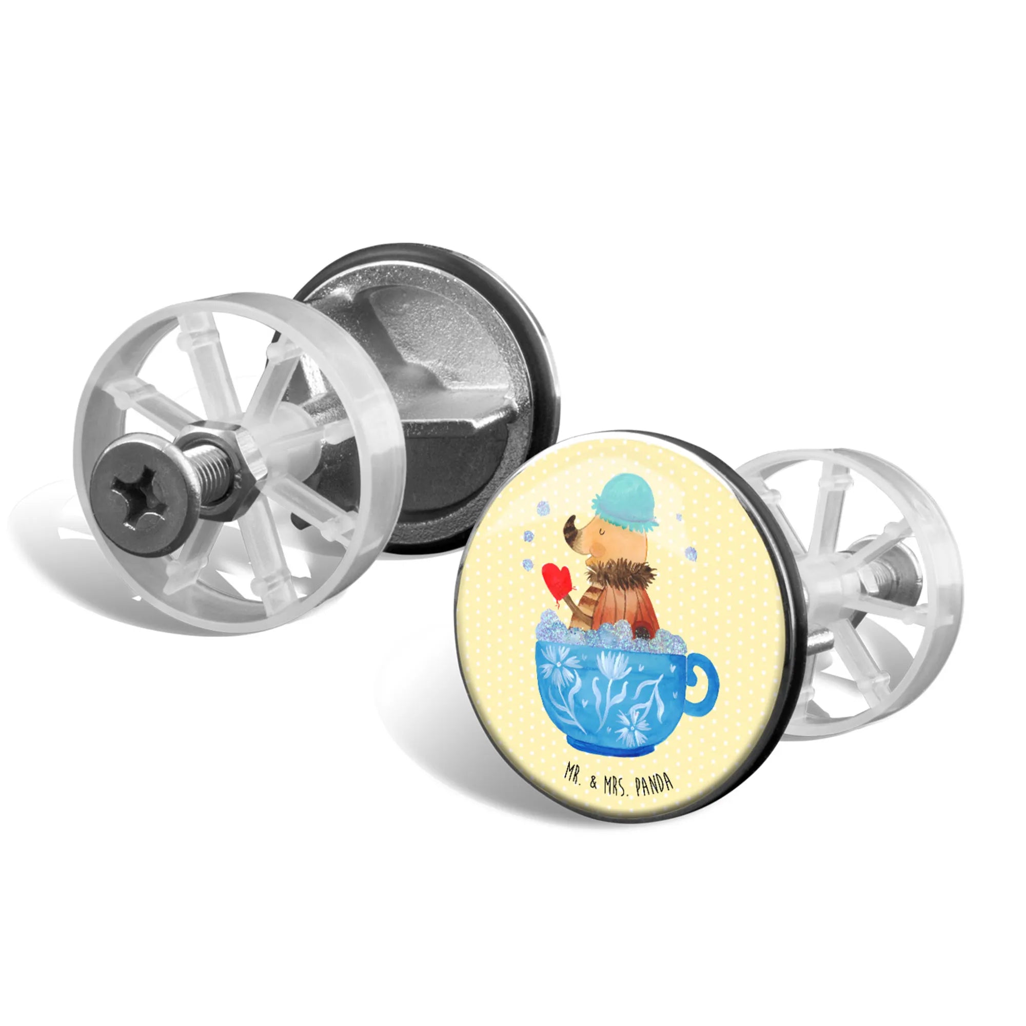 Introducing the charming Sink Plug by Mr. & Mrs. Panda! This magnificent sink stopper measures 72 mm in height and 40 mm in diameter, making it the perfect fit for any standard sink. Made from quality chrome-plated material, it boasts a beautiful design featuring delightful panda art and inspirational quotes. Not only does it look great, but it also features a unique integrated hair catch, so your drain stays clear and unclogged. The surface is designed with a sturdy coating for longevity and ease of use. Maintaining this charming accessory is simple; just rinse under warm water and avoid harsh cleaning agents to keep it shining. Upgrade your bathroom with this cute and functional washbasin accessory today!