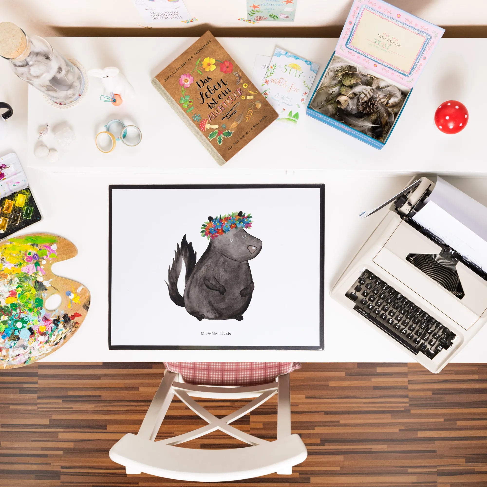 In a world where wild meets whimsical, our Skunk Flower Girl captures the essence of playful charm. With a vibrant floral crown resting atop her head, she embodies the spirit of nature's beauty. This lovely skunk reminds us to embrace our uniqueness, celebrating every quirk and quality. Her slogan, "Ich trage Träume im Herzen, Sonnenschein im Bauch und Blumen auf dem Kopf," speaks volumes about living authentically and loving fiercely. Just like her, we should carry dreams in our hearts and let sunshine fill our very souls, all while sporting a crown of flowers that represents our inner joy. Let's practice yoga with this quirky skunk, breathing in positivity and exuding love and laughter. Her wild spirit teaches us to live boldly, love deeply, and laugh heartily, as every moment matters.