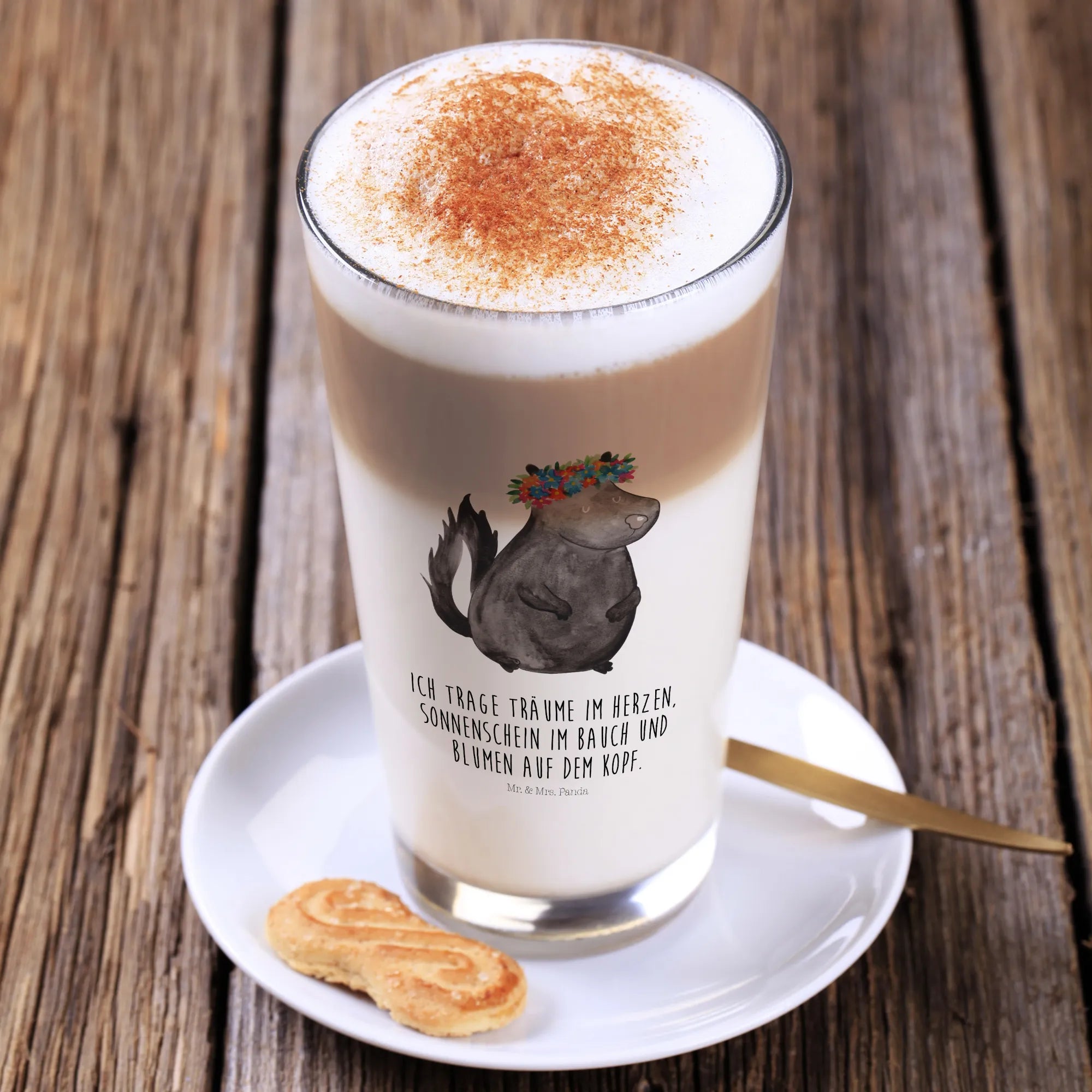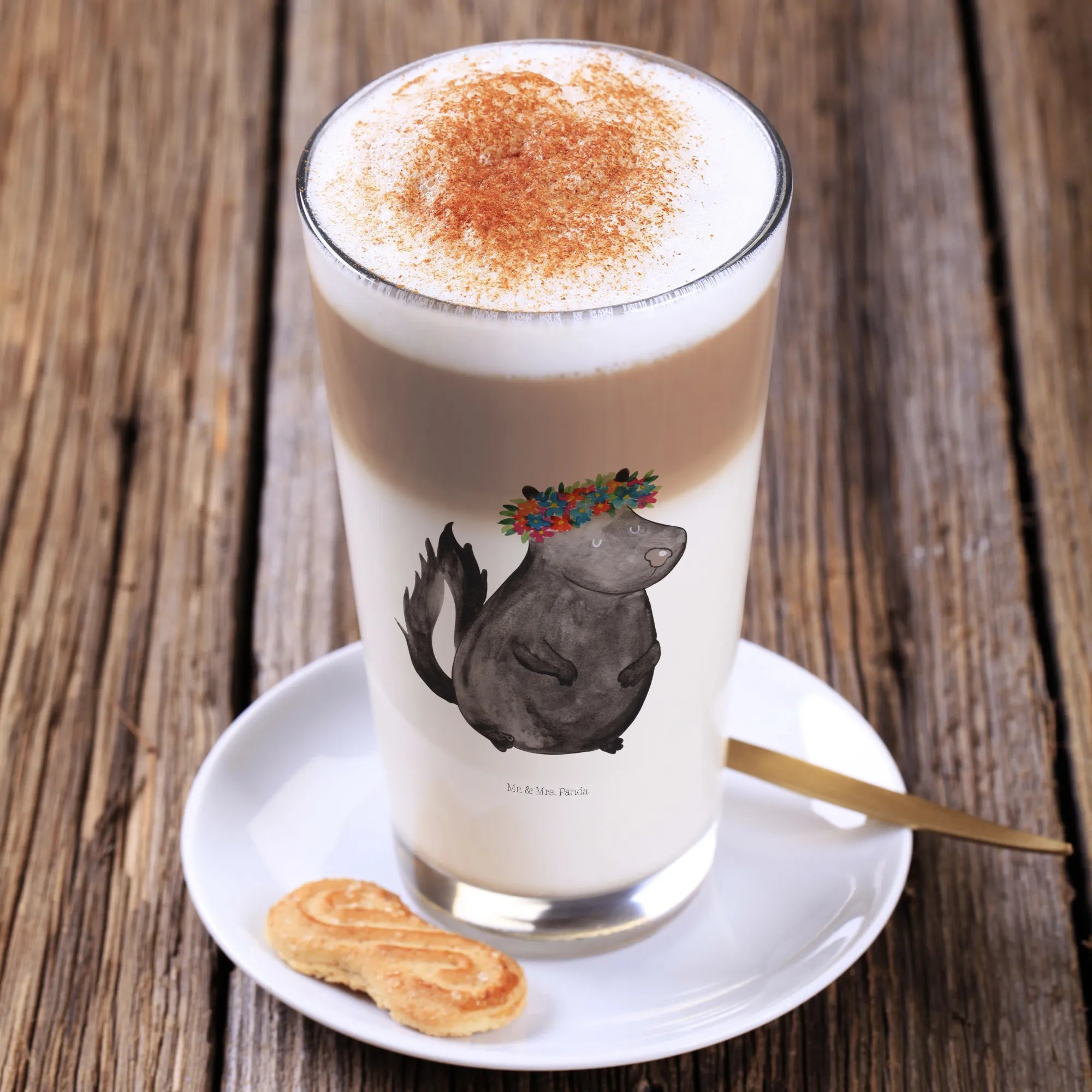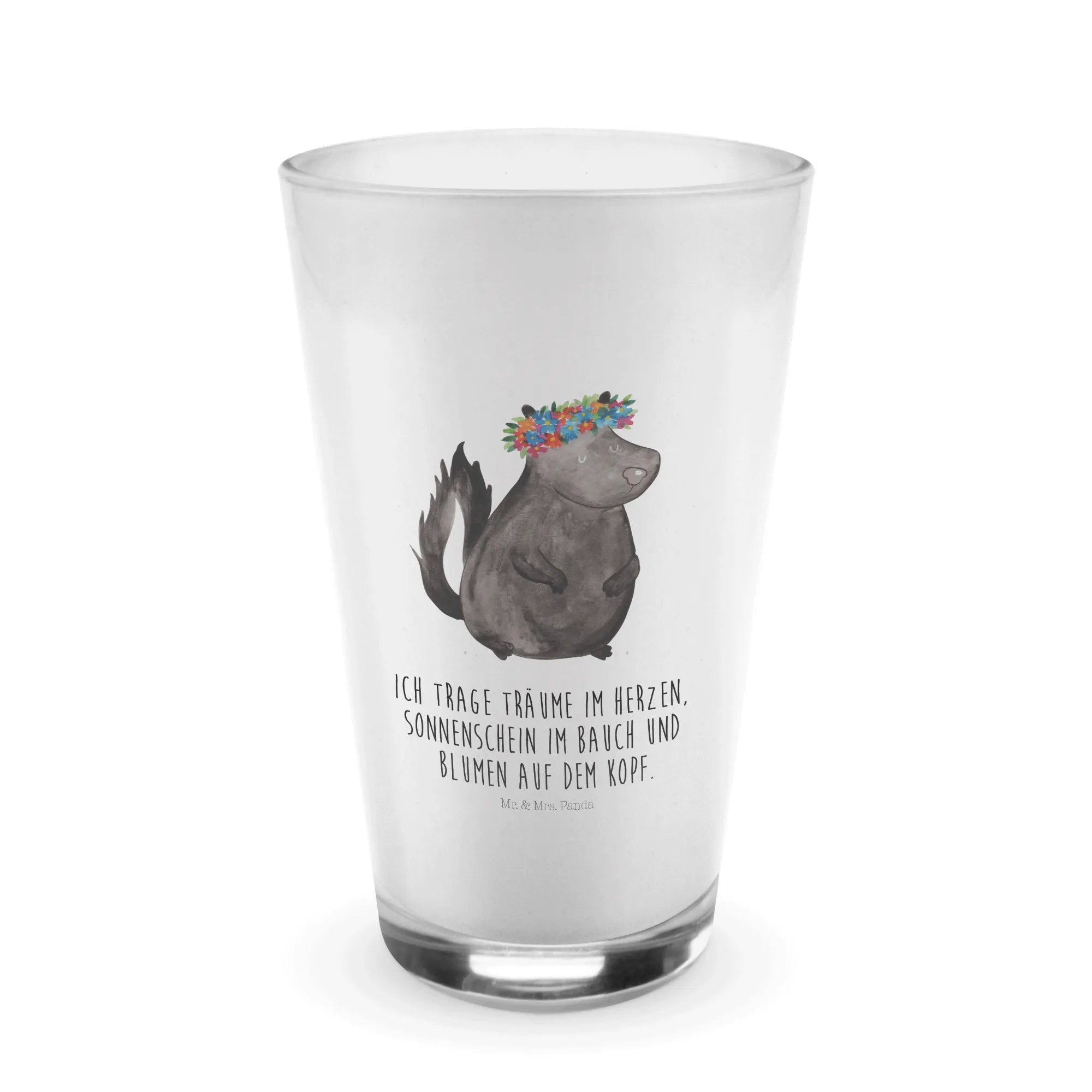 Introducing the delightful Mr. & Mrs. Panda Cappuccino Glass featuring our charming Skunk flower girl design, a whimsical creation crafted with love and care. This exquisite glass is perfect for enjoying a steaming latte macchiato or anything from your favorite coffee creations to refreshing cocktails! With a sturdy design and a beautiful matte finish, each glass is not just a drinking vessel but a lovely addition to your home decor.