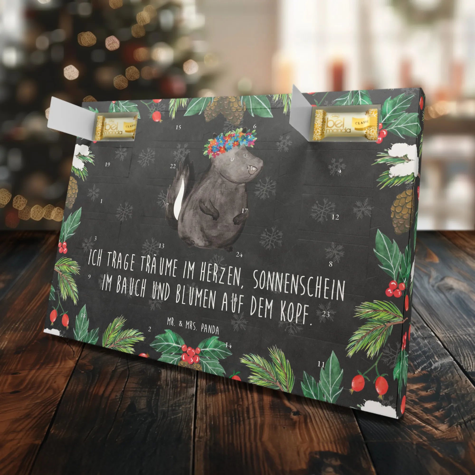 Das süße Stinktier, geschmückt mit einem bunten Blumenkranz, ist ein absoluter Hingucker und lässt die Herzen von Groß und Klein höher schlagen. Dieser Adventskalender ist nicht nur dekorativ, sondern auch eine wahre Gaumenfreude! Er ist gefüllt mit 24 einzeln verpackten Edelmarzipan Pralinés, die aus hochwertigen Zutaten wie 29% Mandeln und feinstem Kakao hergestellt werden. Hier vereinen sich Genuss und Design auf wundervolle Weise!