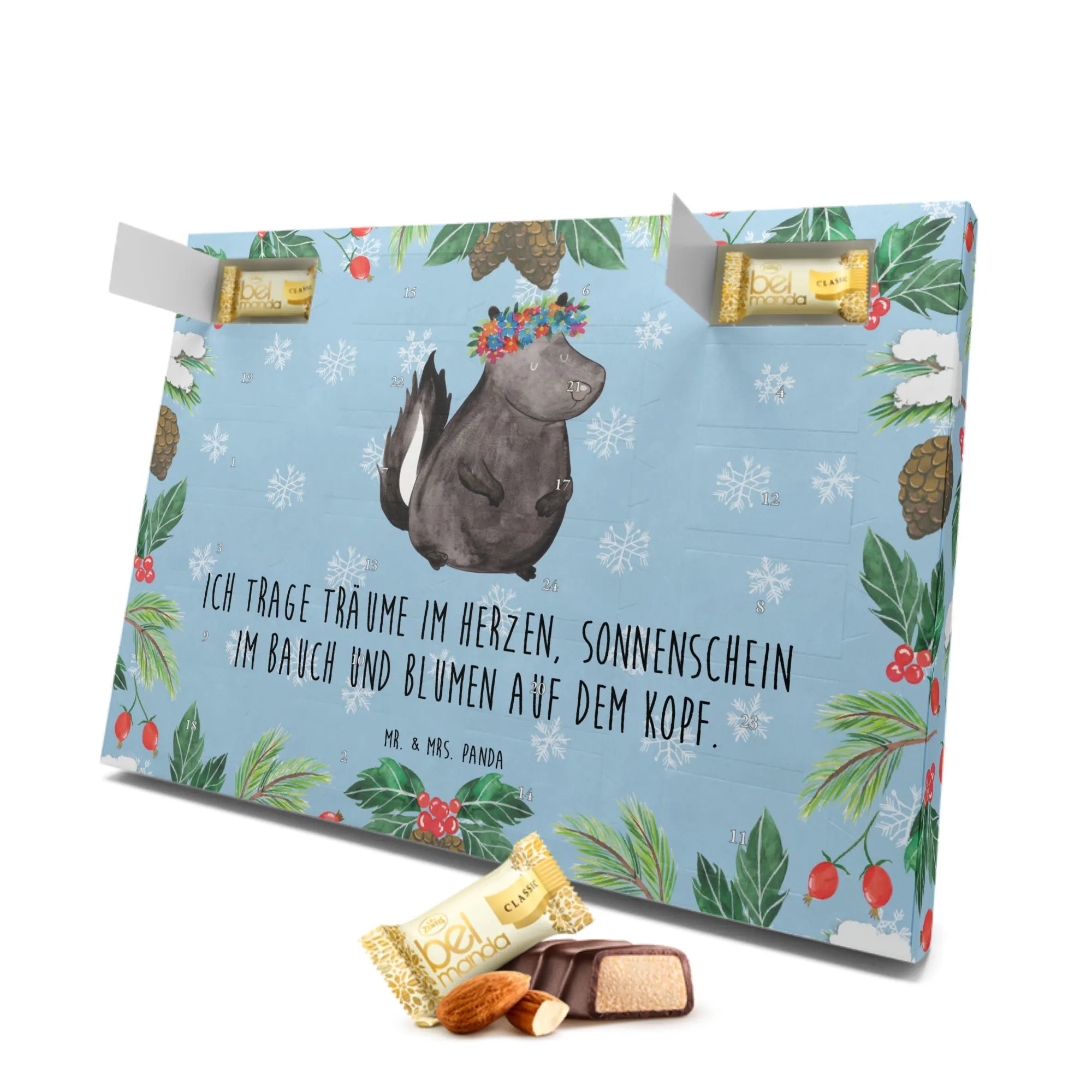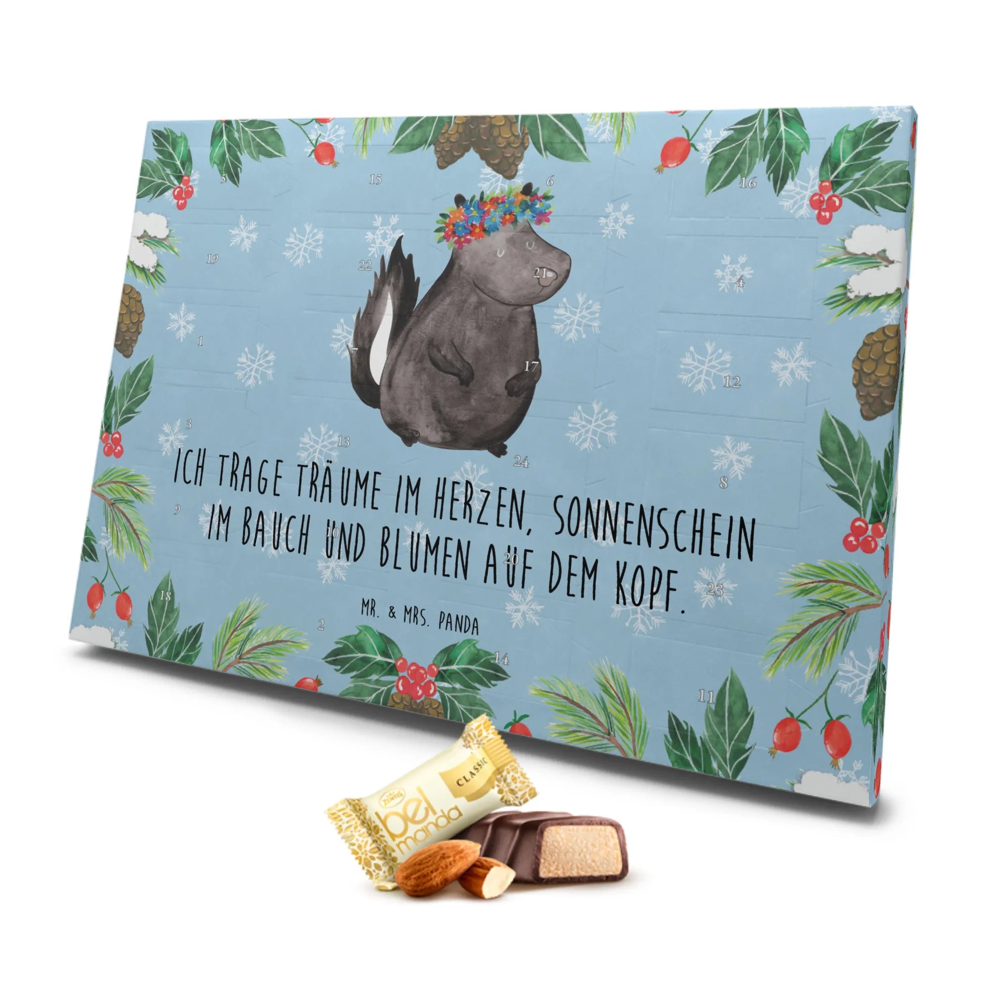 Der wunderschöne Marzipan Adventskalender mit dem einzigartigen Motiv "Stinktier Blumenmädchen" aus der Stinktier-Kollektion von Mr. & Mrs. Panda ist das perfekte Geschenk für alle Naturliebhaber und Freunde von süßen Überraschungen zur Adventszeit. Mit seinem liebevoll gestalteten Design bringt dieser Adventskalender Freude und Licht in den Dezember.