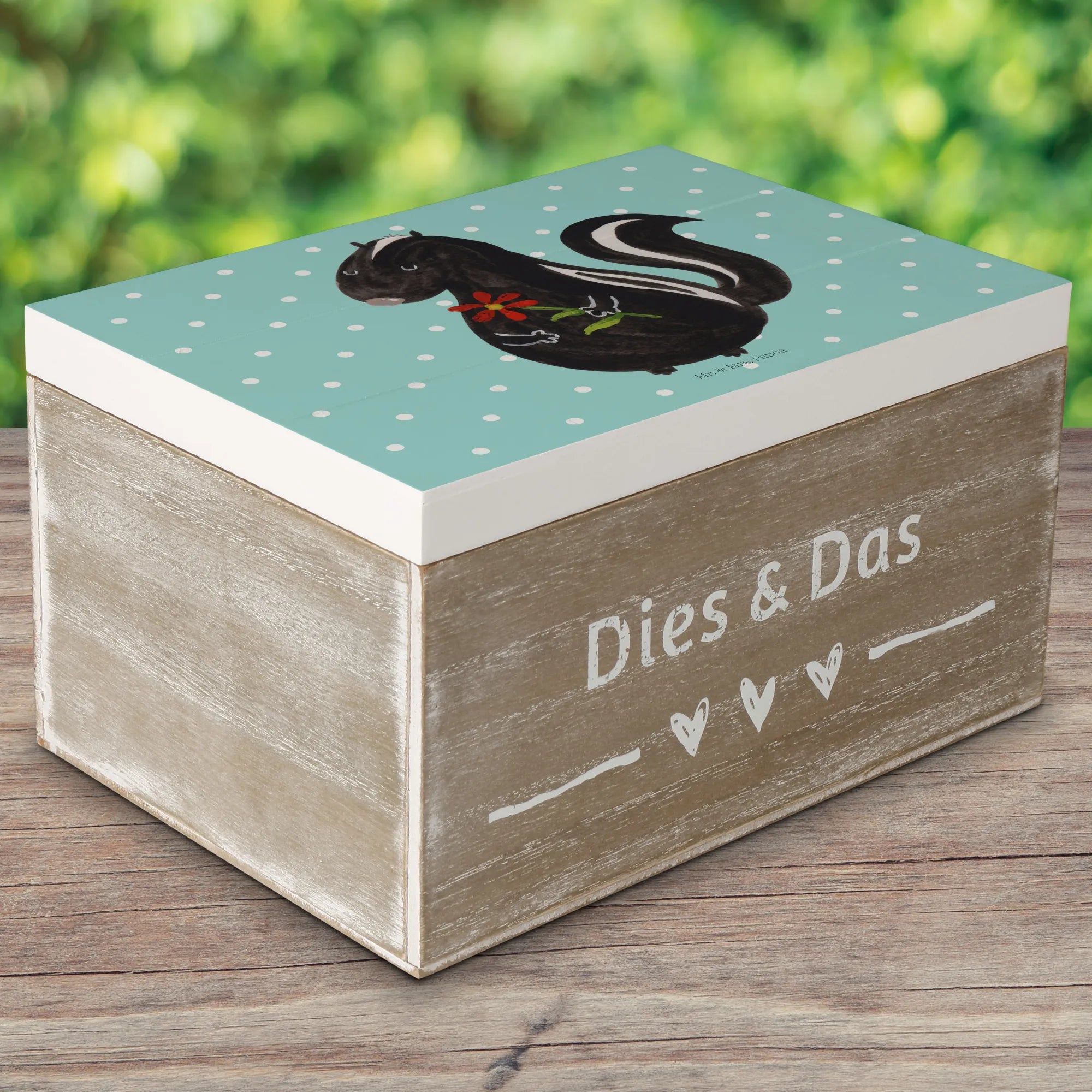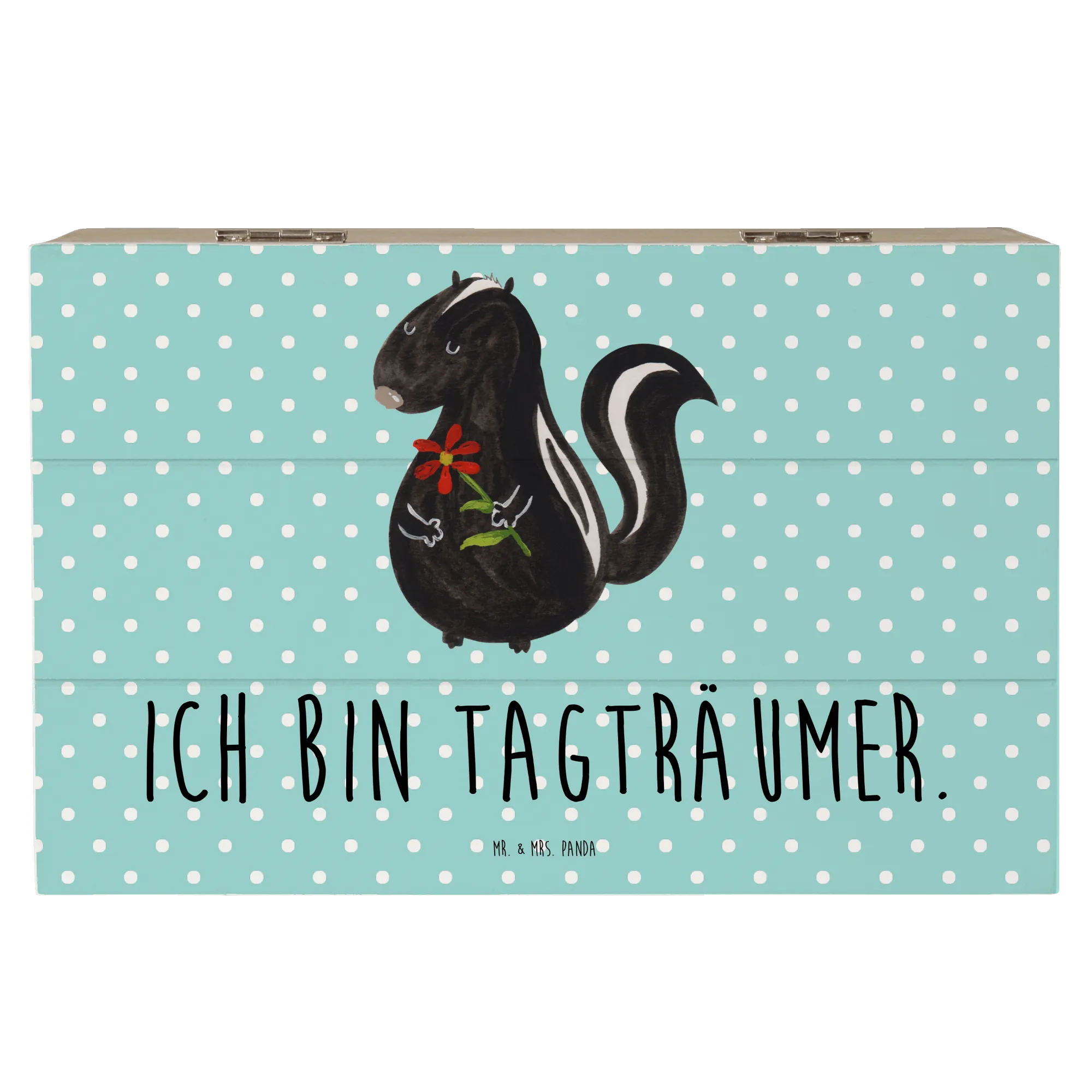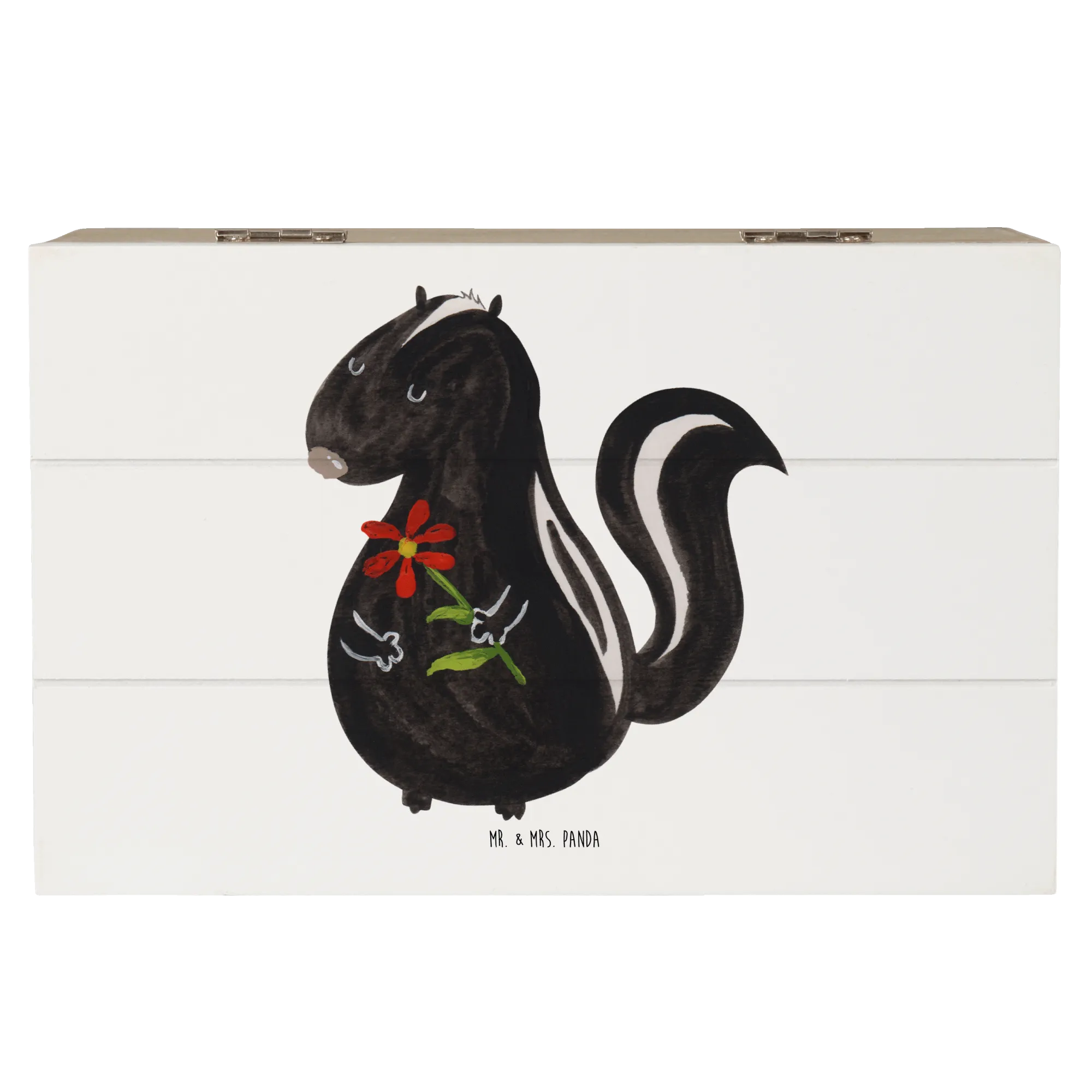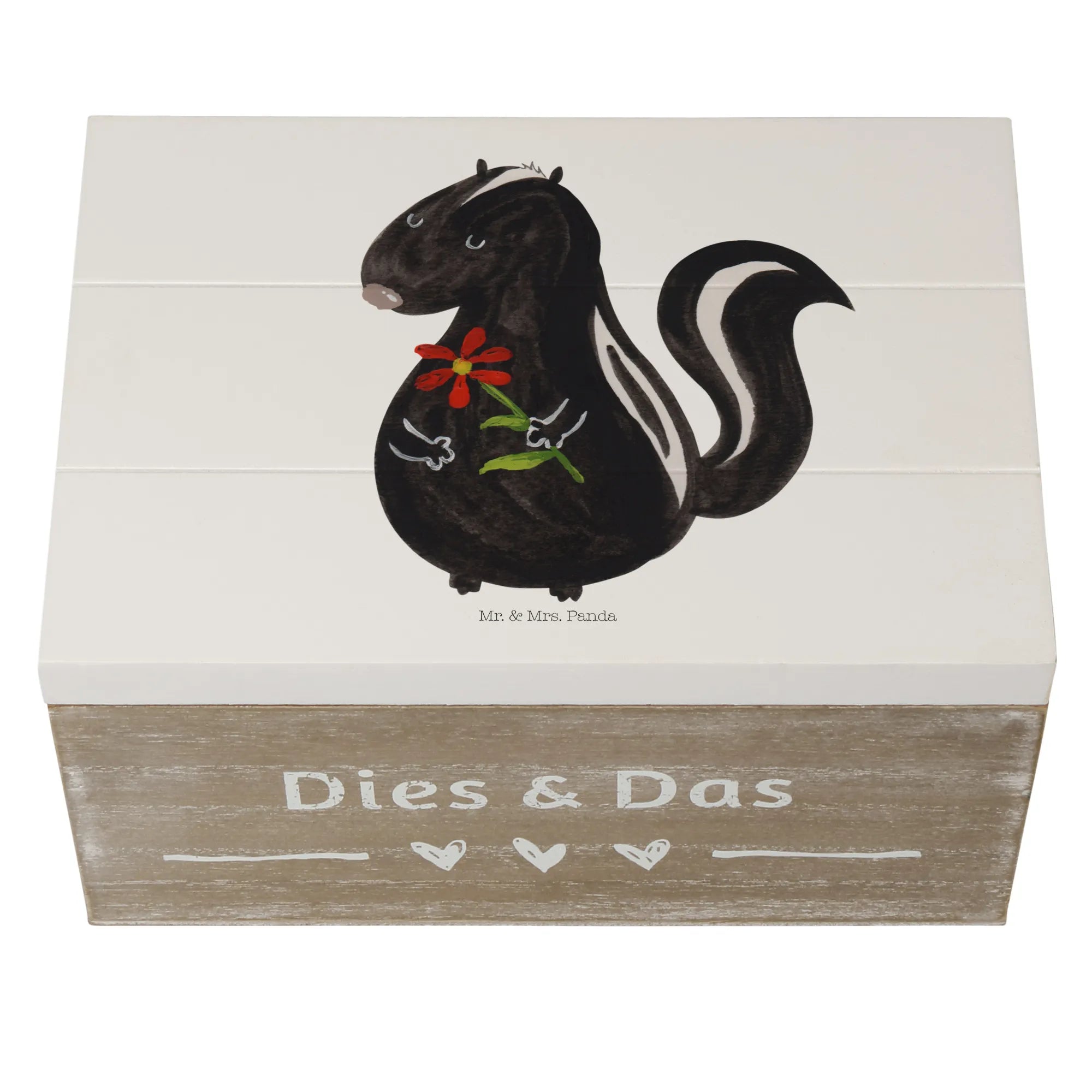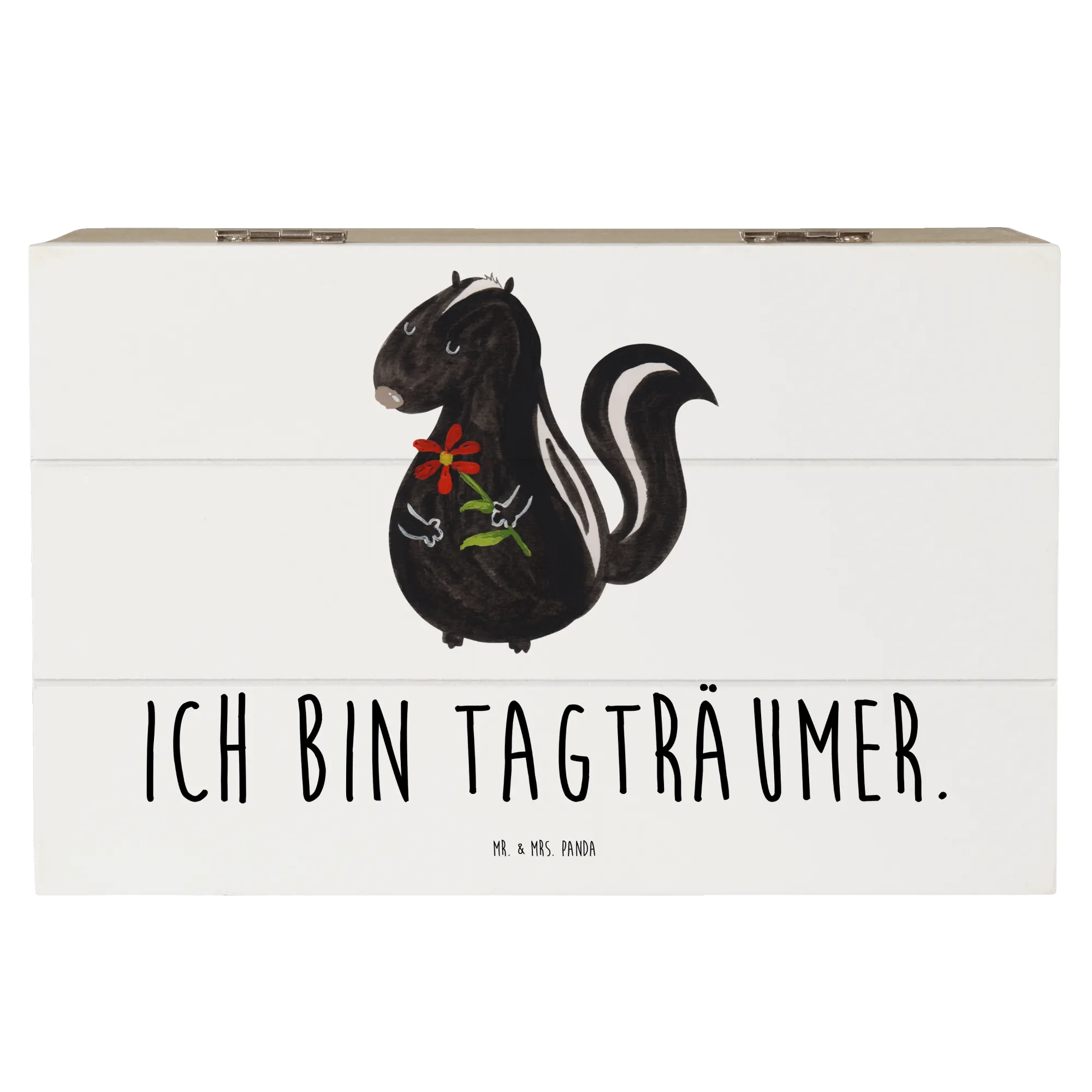 Perfect for storing your most cherished belongings, from childhood mementos to holiday keepsakes, this wooden box is lovingly designed to be a sustainable and reusable gift option. Crafted from robust wood fiber, the chest is not only durable but also features adorable artwork of a skunk adorned with a colorful flower crown, created in exquisite watercolor by Mrs. Panda herself. The skunk motif reminds us of dreams and daydreaming, making it an ideal gift for anyone who appreciates sweet, quirky decor.