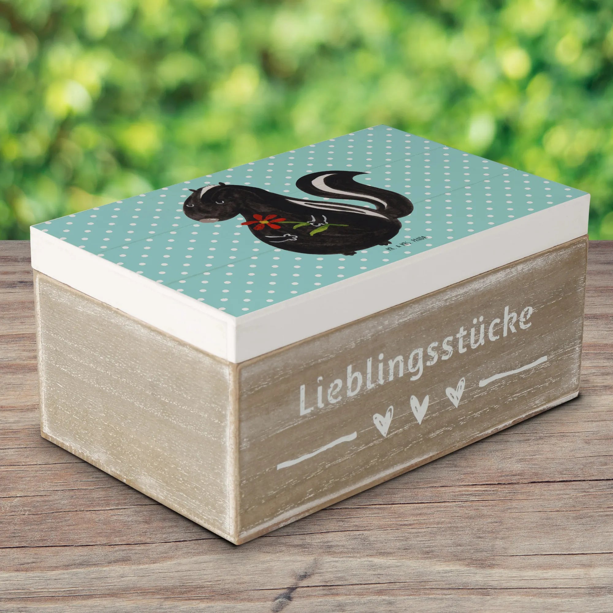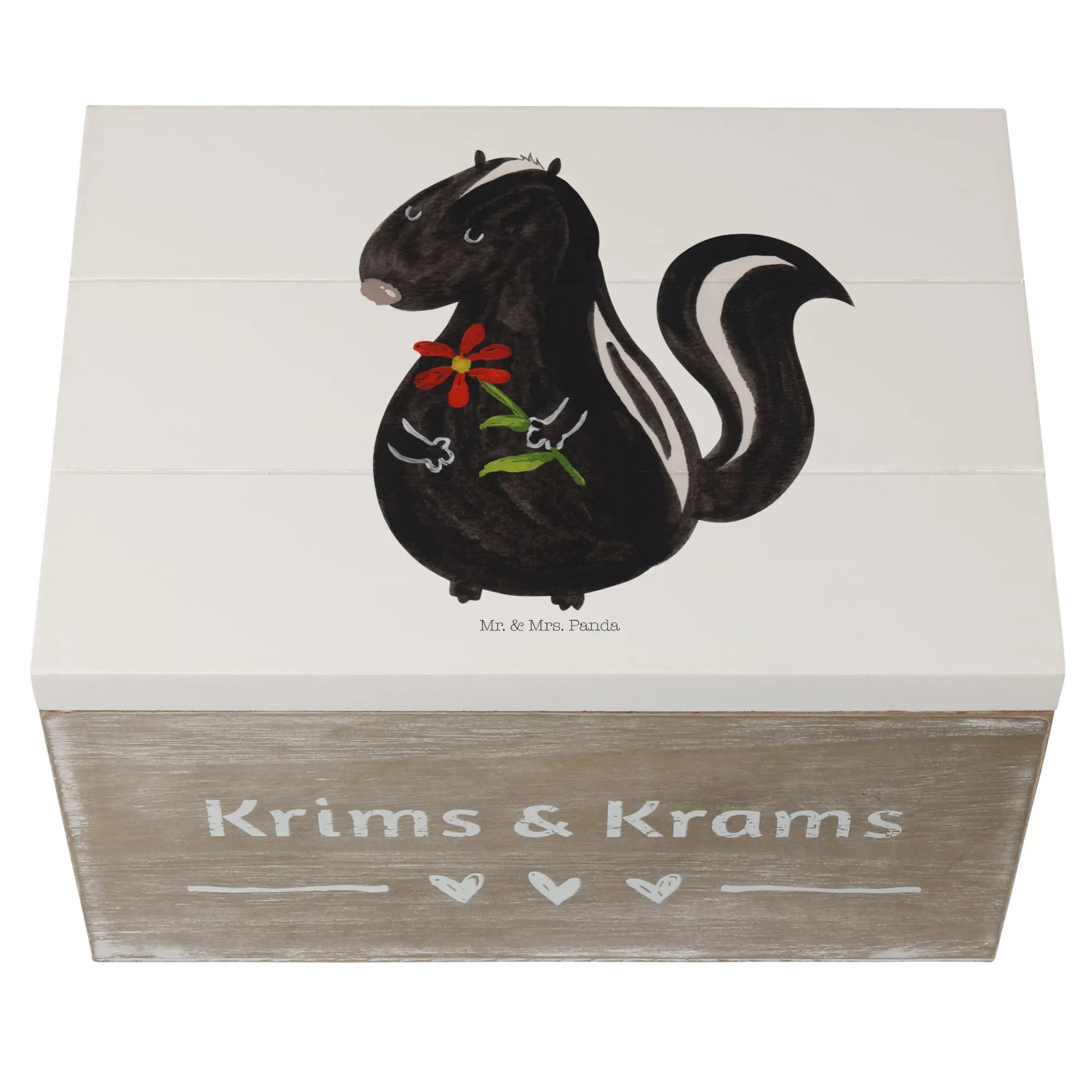 Introducing the Wooden Chest Skunk Flower from the delightful Skunk Collection by Mr. & Mrs. Panda! This charming decorative box is more than just a treasure chest; it's a beautiful memory box that brings joy and whimsy into any space.
