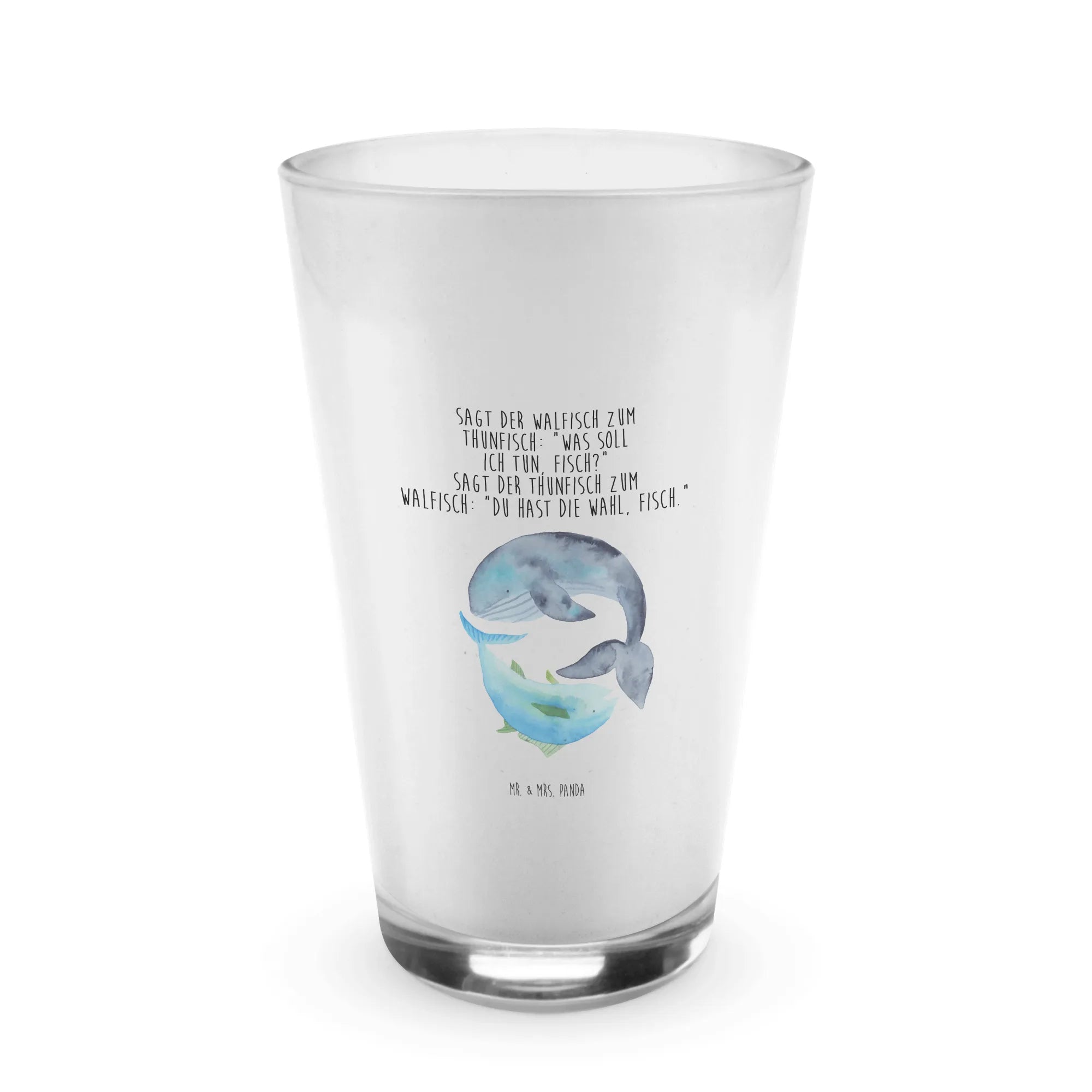 The adorable depiction of a whale and a tuna frolicking through a small world brimming with small animals instantly brings a smile to your face. It’s perfect for anyone who loves marine life or appreciates cute and artistic designs. The playful saying featured on the glass, 'Sagt der Walfisch zum Thunfisch: „Was soll ich tun, Fisch?“ Sagt der Thunfisch zum Walfisch: „Du hast die Wahl, Fisch.' adds a touch of humor, making it a fantastic gift for birthdays or as a quirky housewarming present.