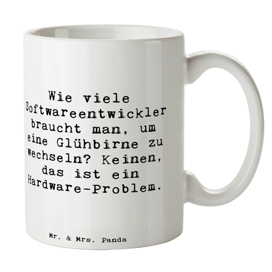 Mug Saying Wie viele Softwareentwickler braucht man, um eine Glühbirne zu wechseln? Keinen, das ist ein Hardware-Problem. - White
