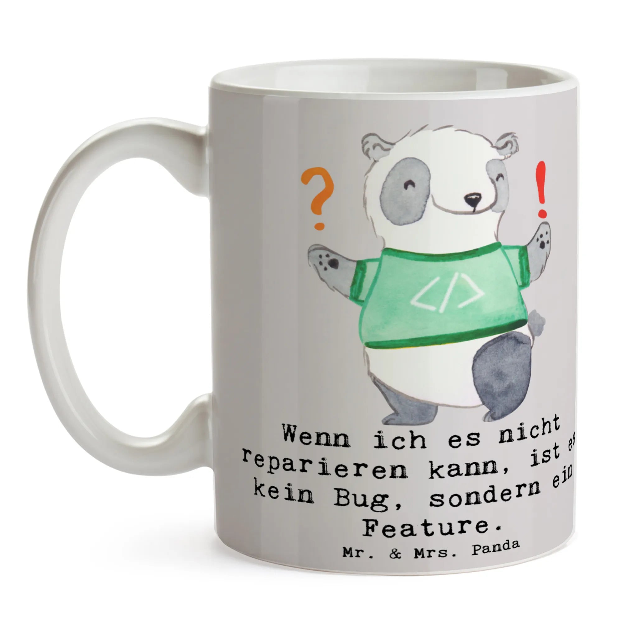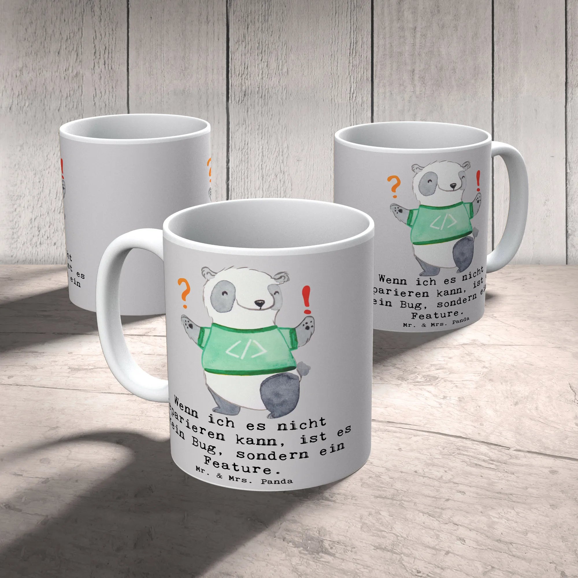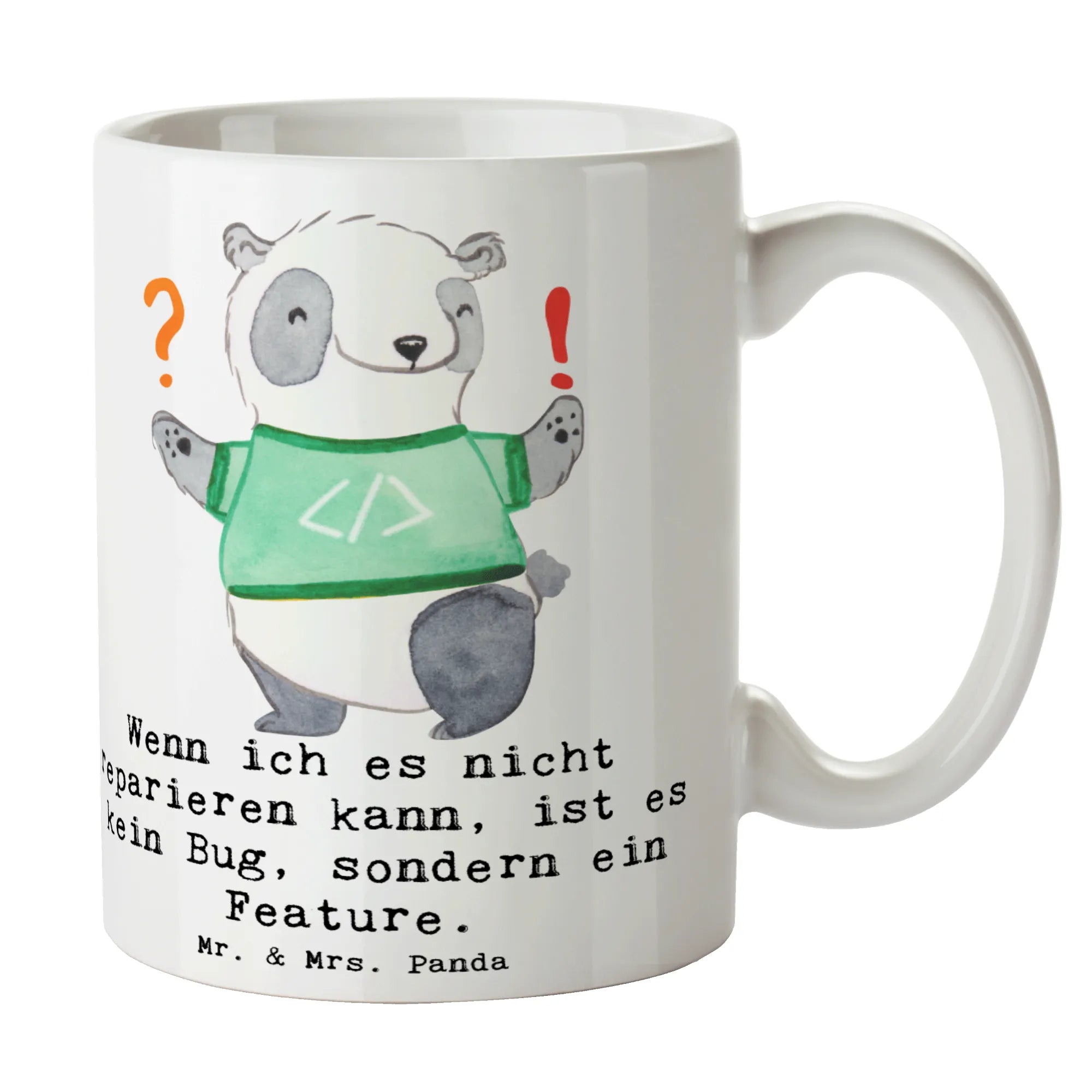 Die Tasse "Softwareentwickler" von Mr. & Mrs. Panda ist das perfekte Geschenk für alle, die in der aufregenden Welt der Technologie und Softwareentwicklung zuhause sind. Sie zeigt nicht nur ein originelles Design, sondern bietet auch den humorvollen Slogan: "Wenn ich es nicht reparieren kann, ist es kein Bug, sondern ein Feature!" Diese spritzige Aussage bringt jeden Softwareentwickler zum Schmunzeln und ist genau das richtige für den startenden Tag an deinem Arbeitsplatz oder für entspannte Kaffeepausen mit Kollegen.