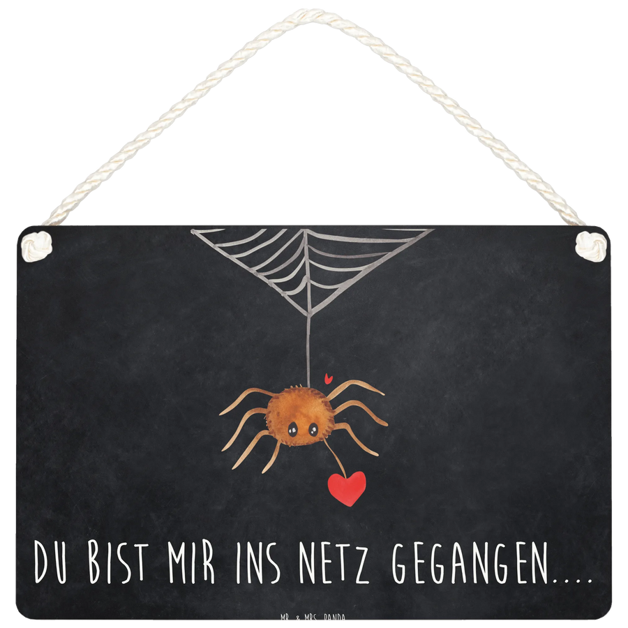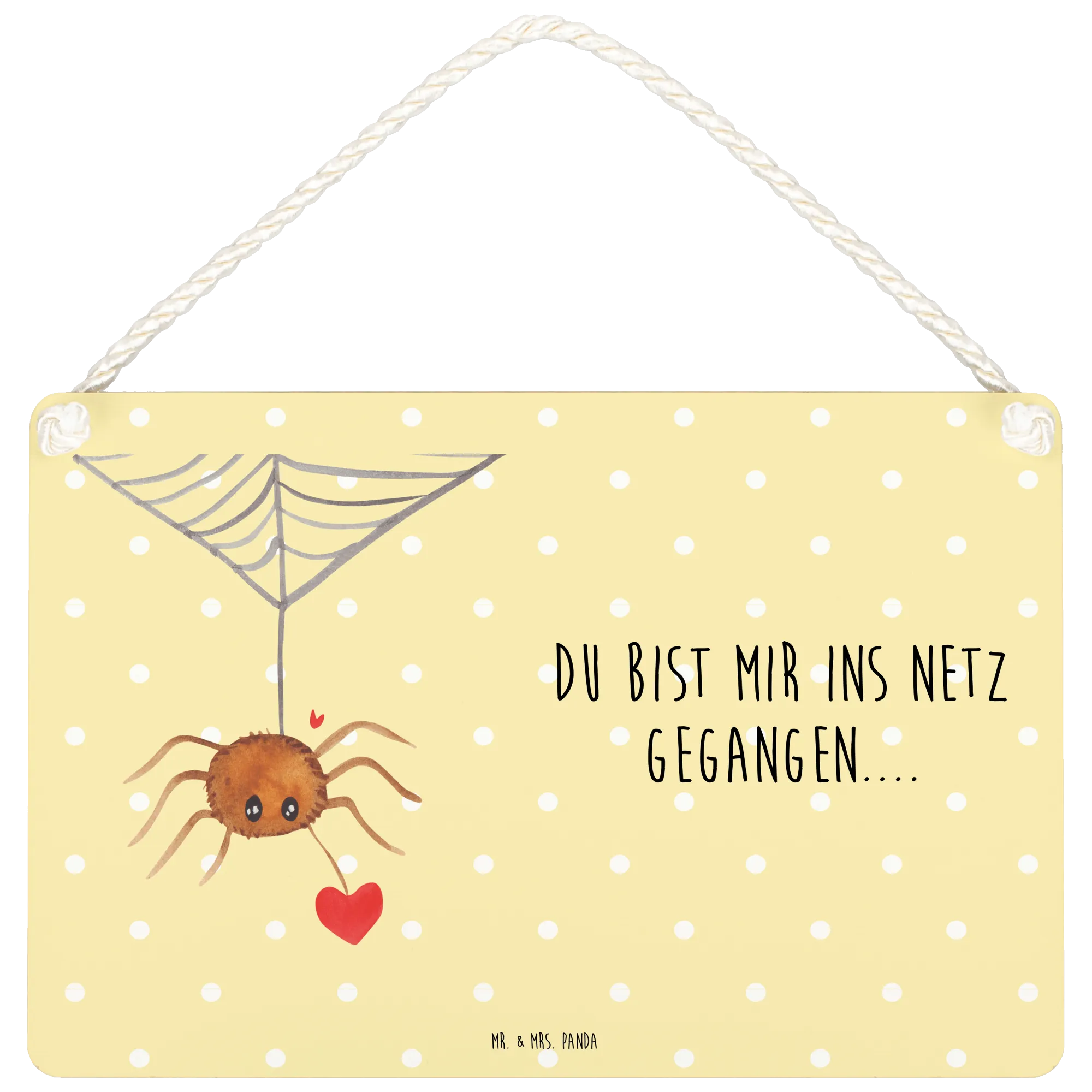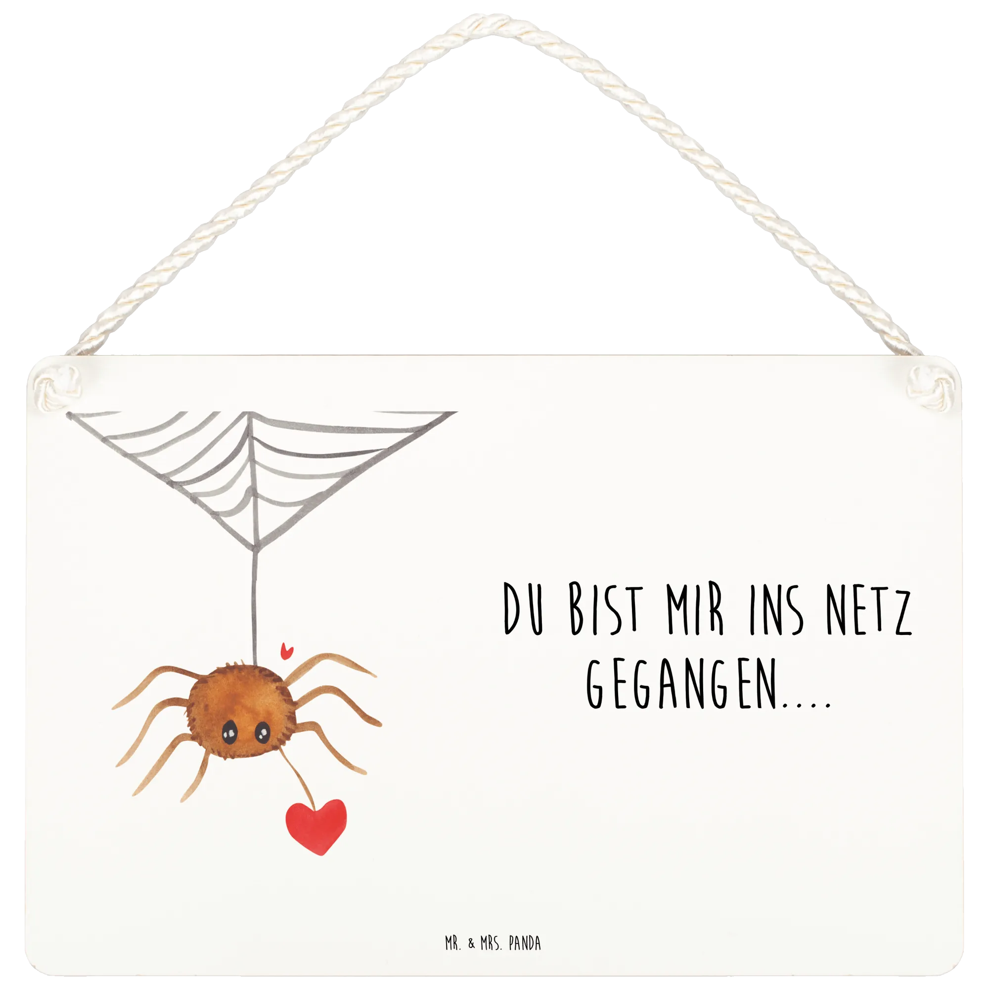 The design features Spider Agathe nestled alongside a heart, encapsulating the sweet essence of love in a charming manner. The phrase 'Du bist mir ins Netz gegangen...' — meaning 'You've caught me in your web...' — beautifully captures that moment of falling in love, while the artistry of Mrs. Panda adds a playful vibe. This makes the sign not just a decoration, but a genuine expression of your feelings.